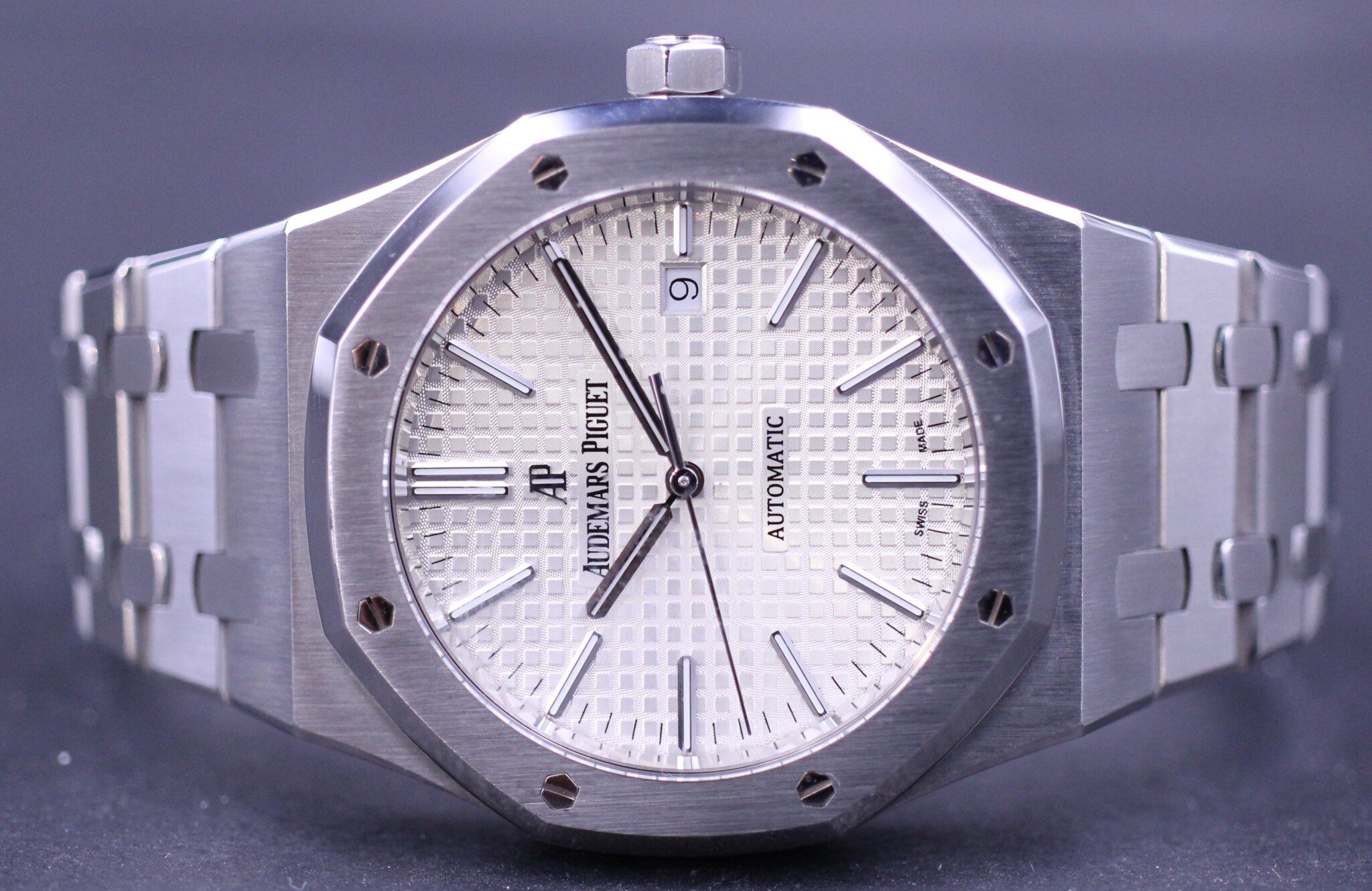Lækkert Audemars Piguet Royal Oak med hvid skive med “Grande Tapisserie” mønster og hvidgulds markeringer. Uret måler 41mm.