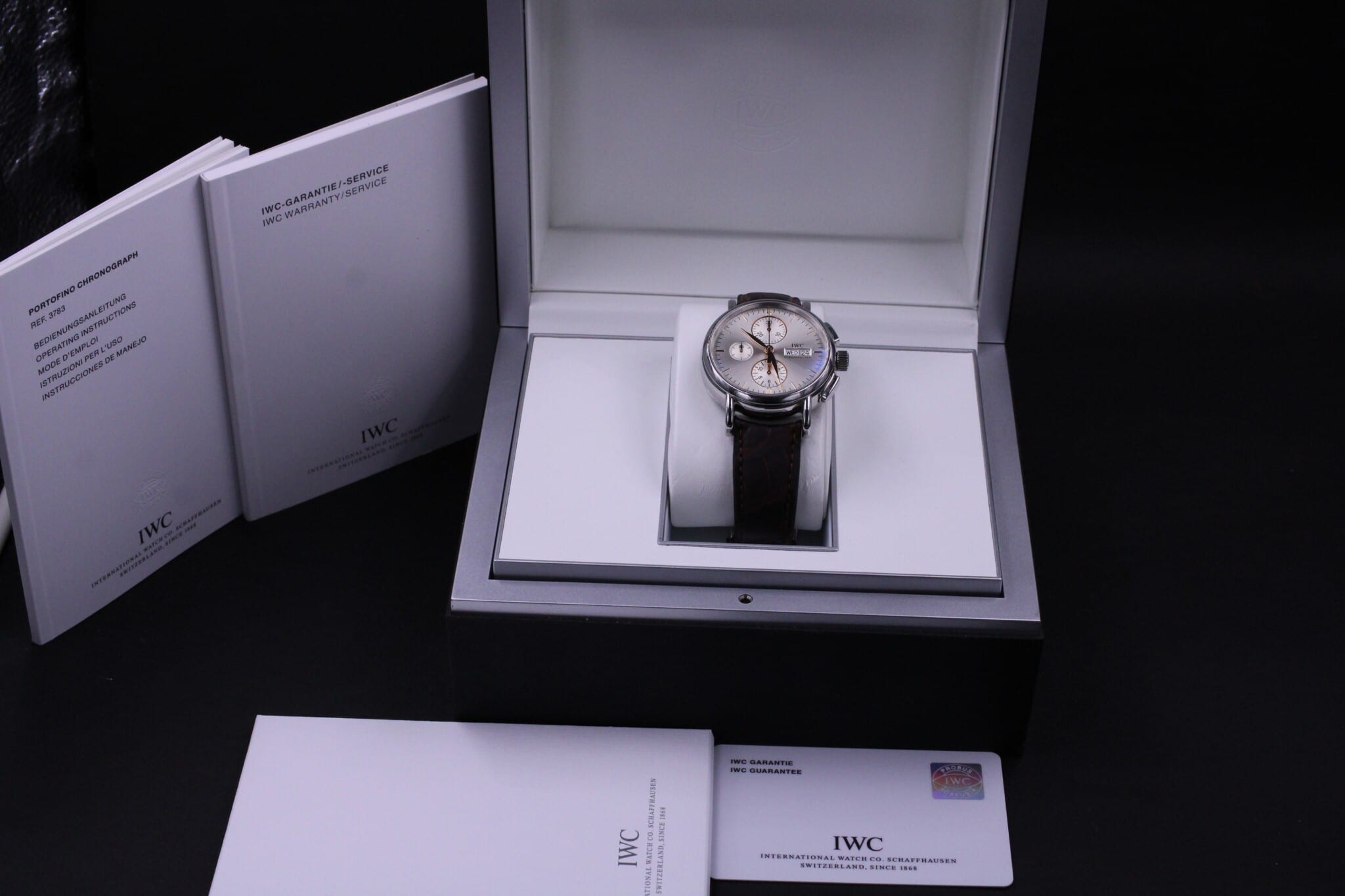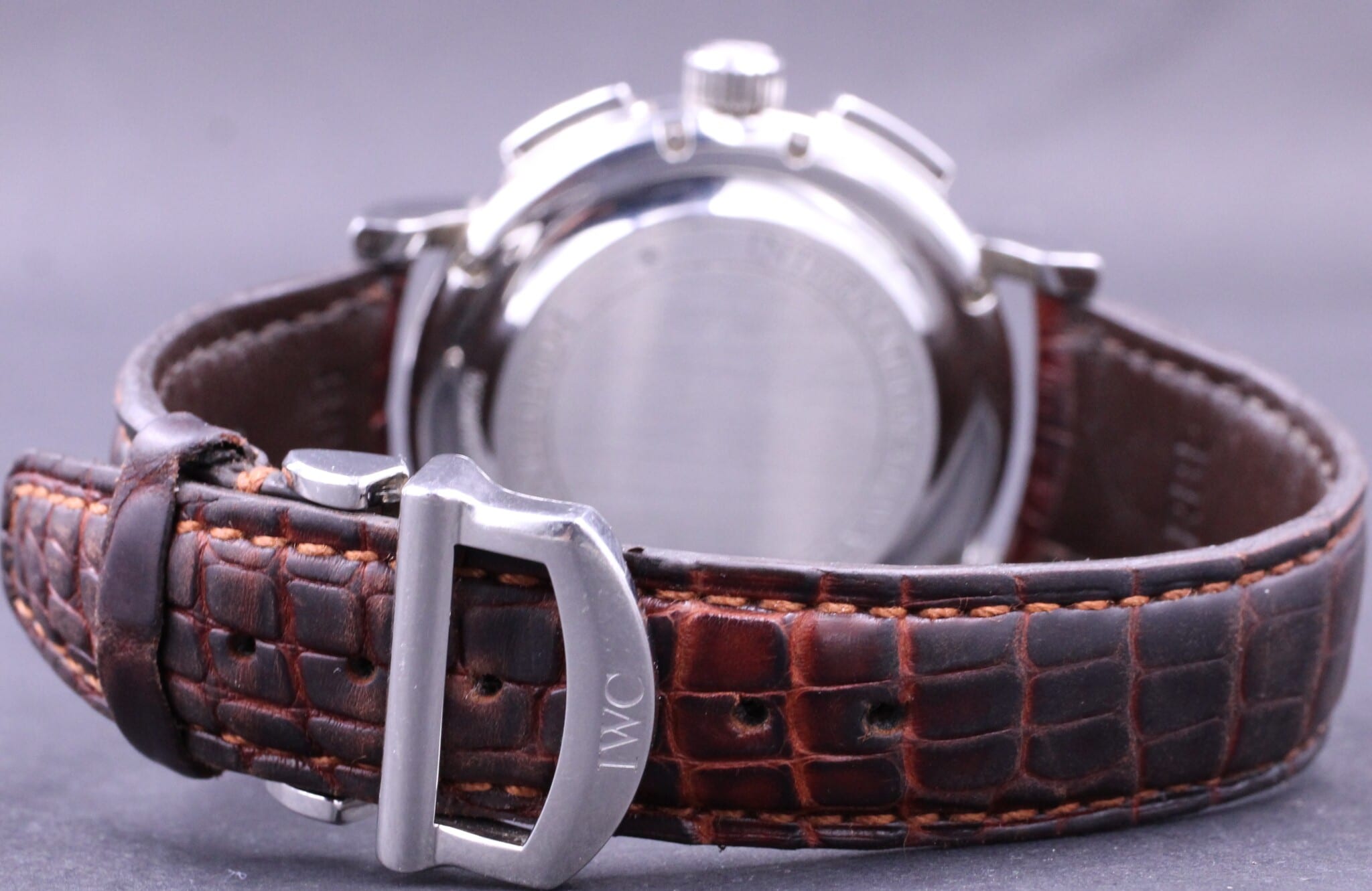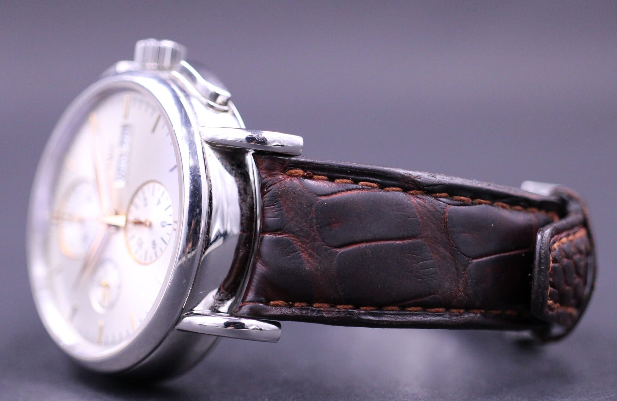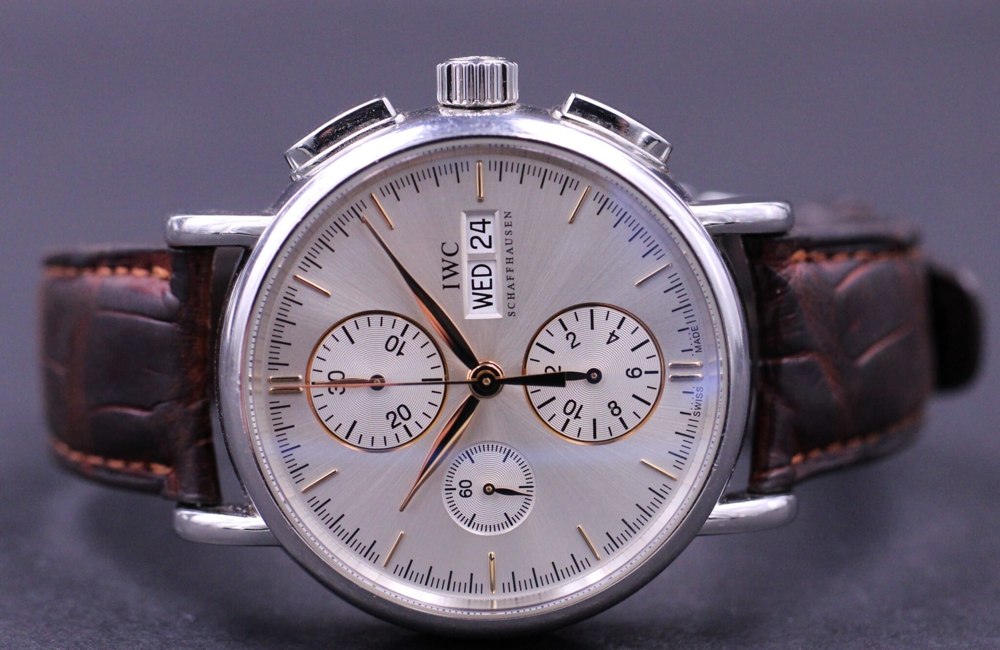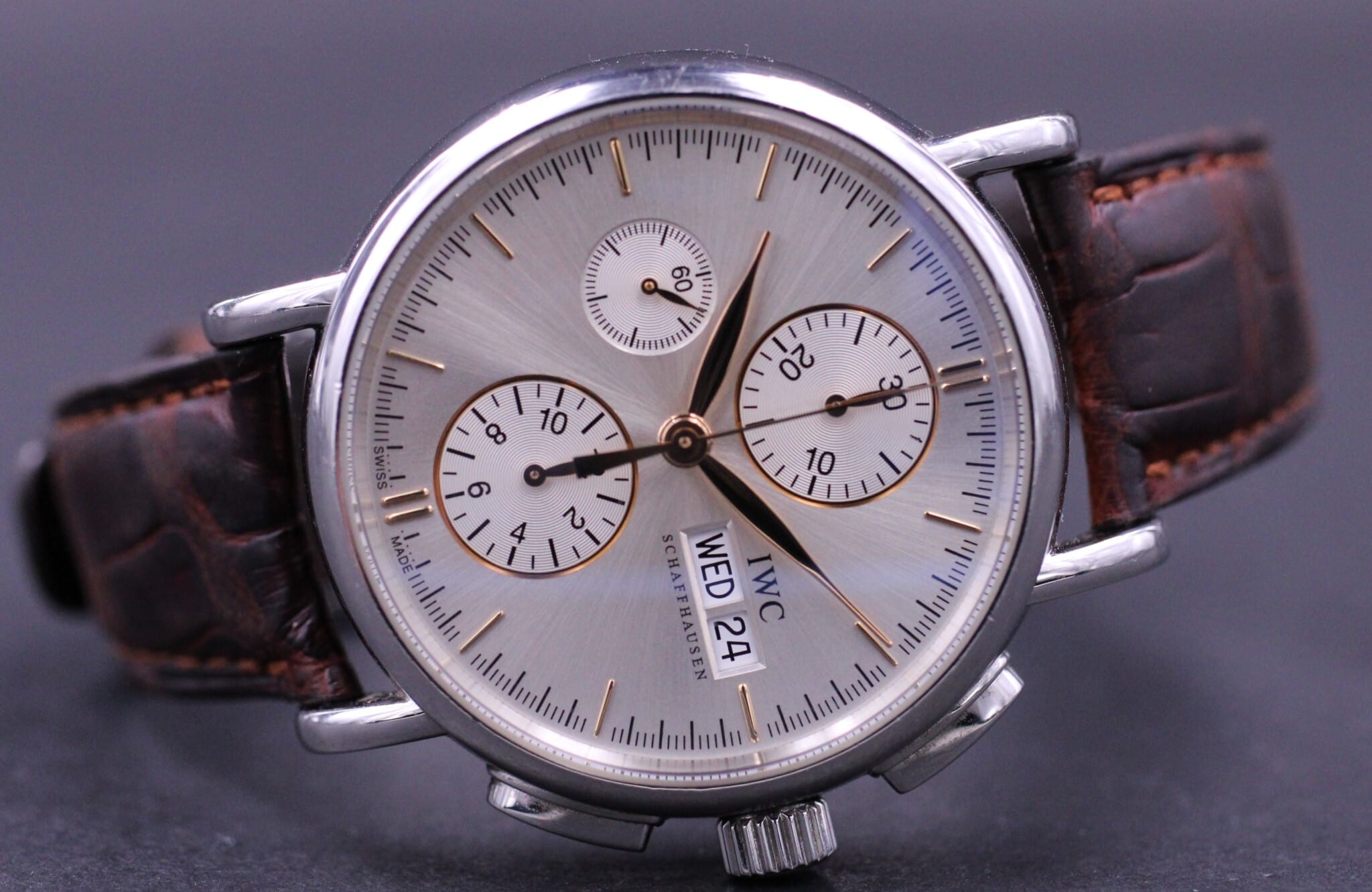 Et klassisk IWC med automatisk urværk: Dag, dato og kronograf på sølvskive samt leder rem med foldespænde.
