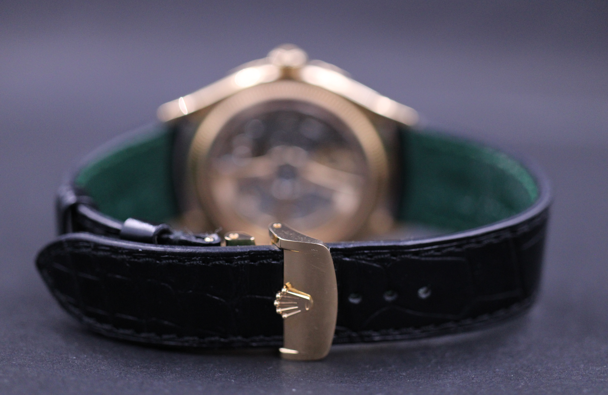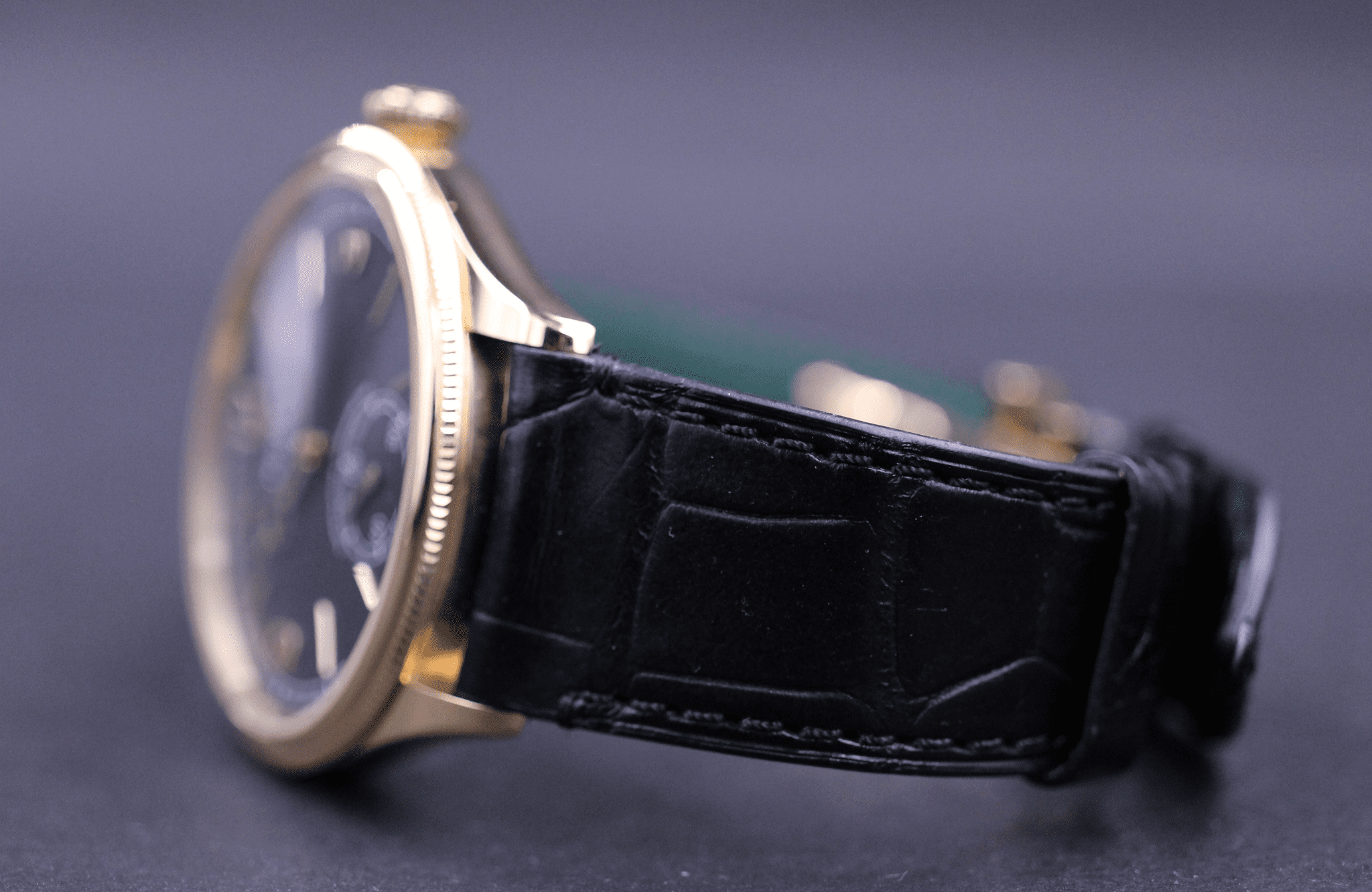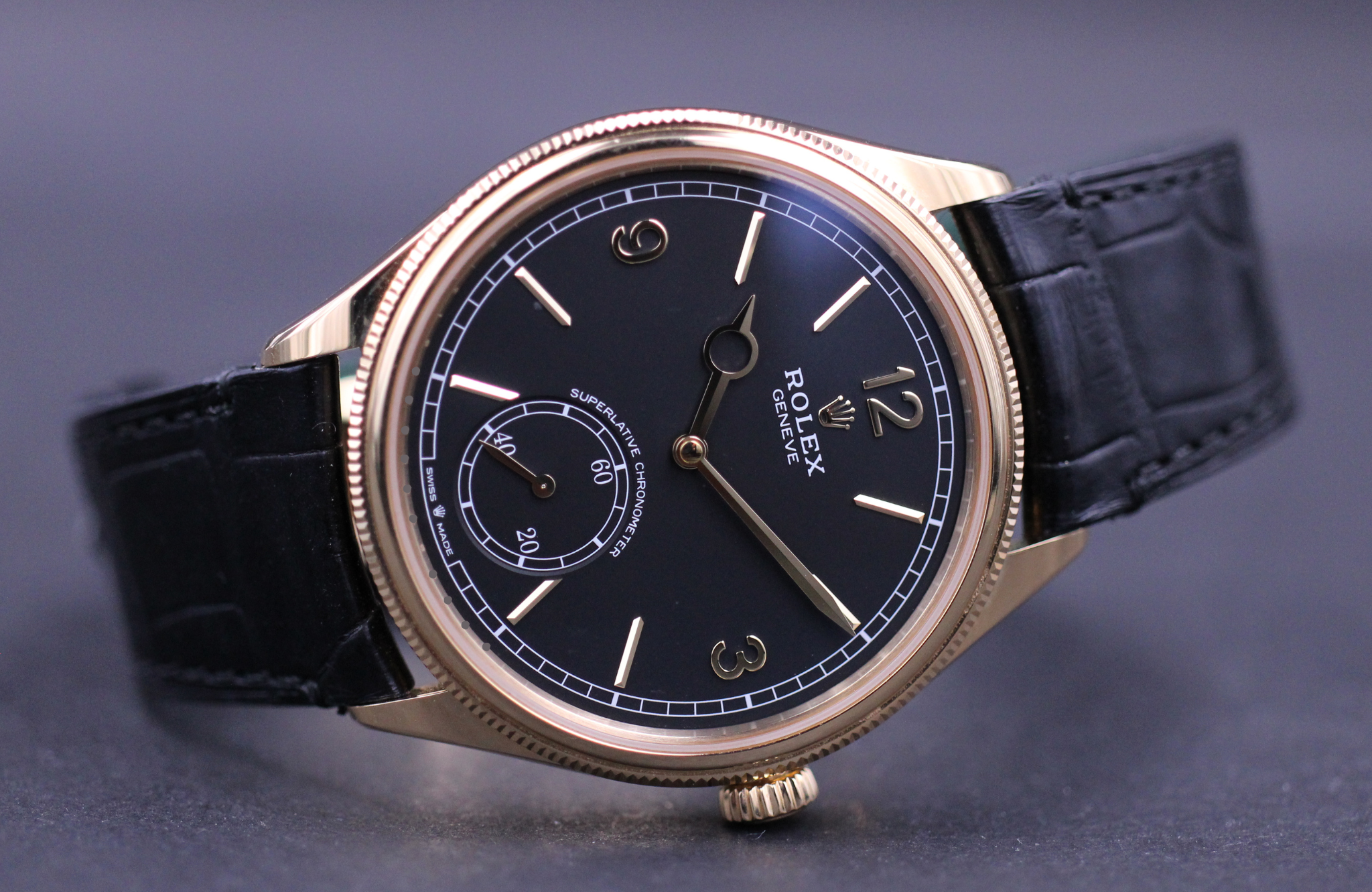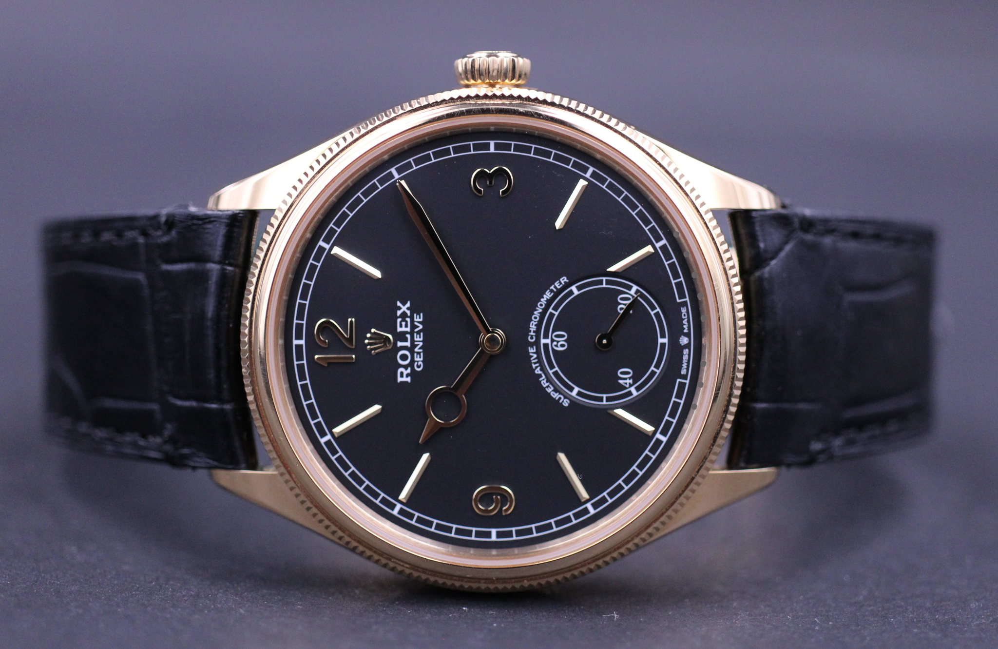 Super flot Rolex 1908 i 39mm. Her med den flotte sorte skive, urkasse i guld samt læderrem.