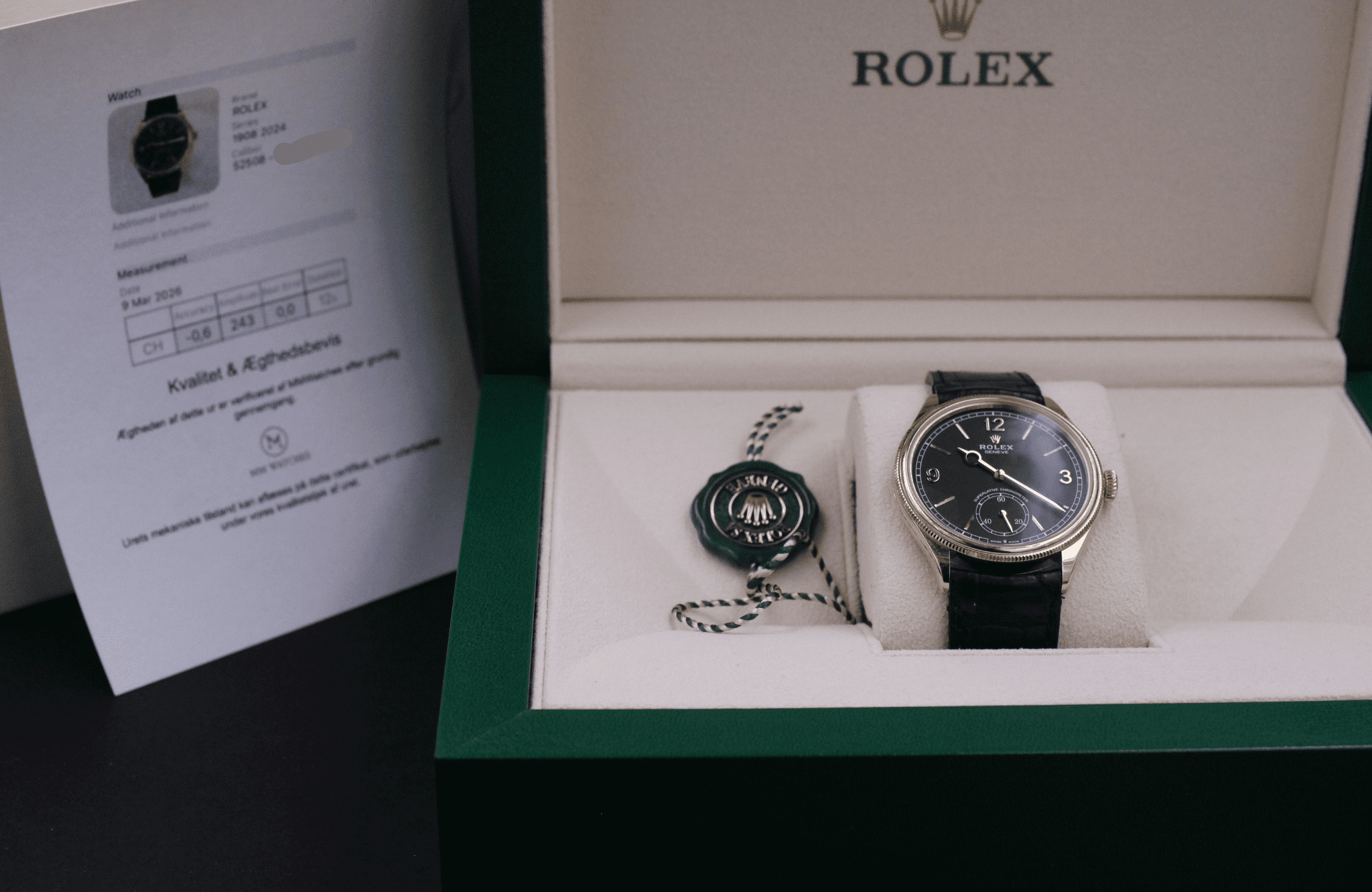 Rolex 1908, ref. 52508 fra 2024. Uret er omfattet af Rolex World Wide Garanti til 2029. Uret er i perfekt stand.