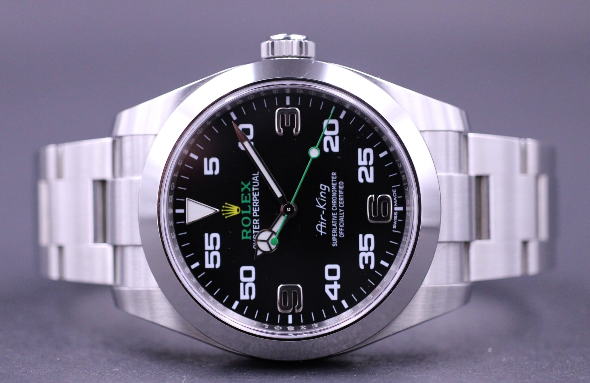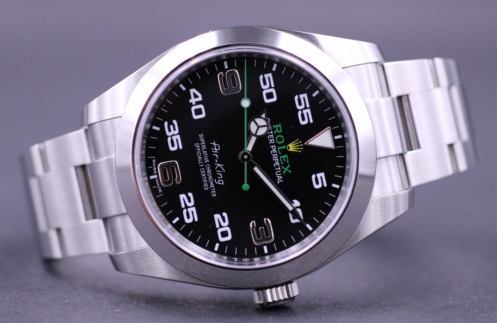 Super lækker Air-King, her i den nyeste model der blev introduceret på Basel messen i 2016. Uret måler 40mm og er lavet af 904L stål og monteret med ridsefrit safirglas. Uret har en sort skive, med karakteristiske arabiske tal, og den grønne tekst samt grønne sekundviser, giver virkeligt uret et fedt og unikt look.
