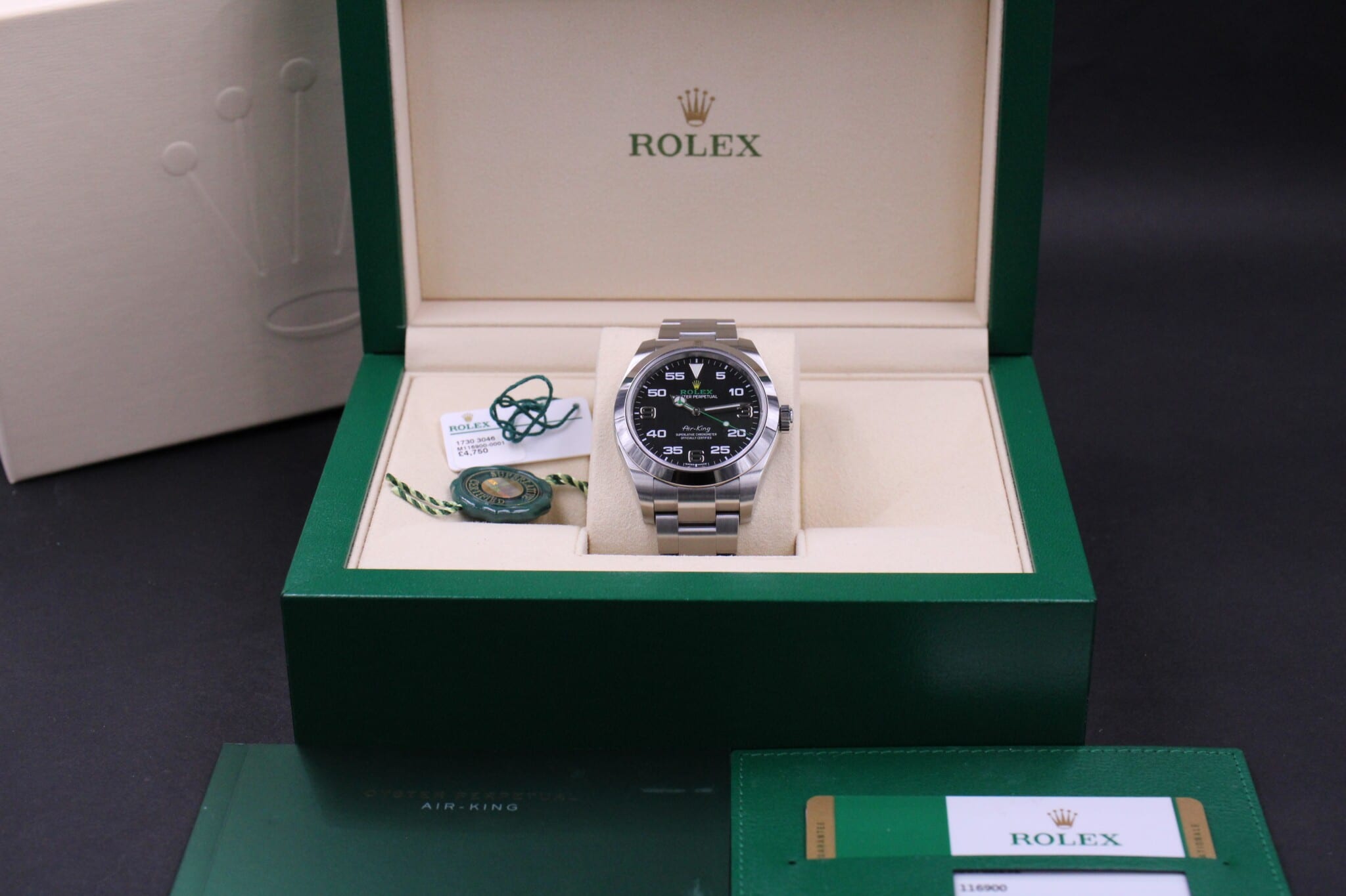 Rolex Air-King, ref. 116900 fra August 2019 og er dermed omfattet af Rolex World Wide Garanti til 2024.