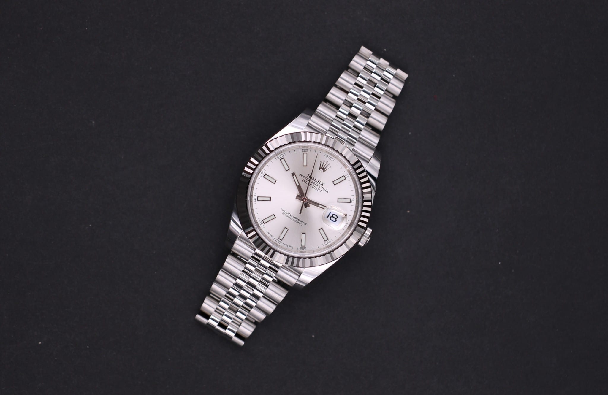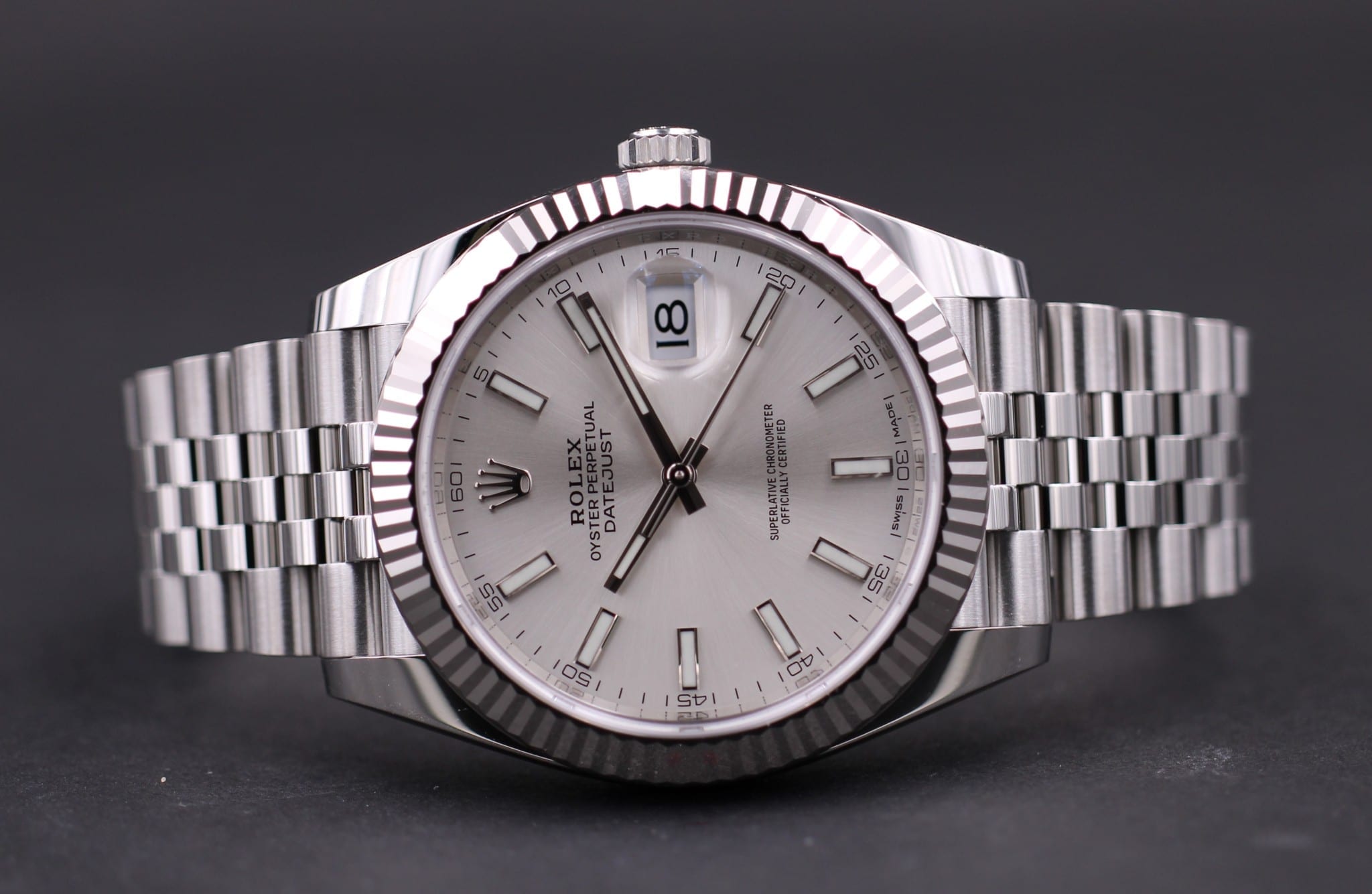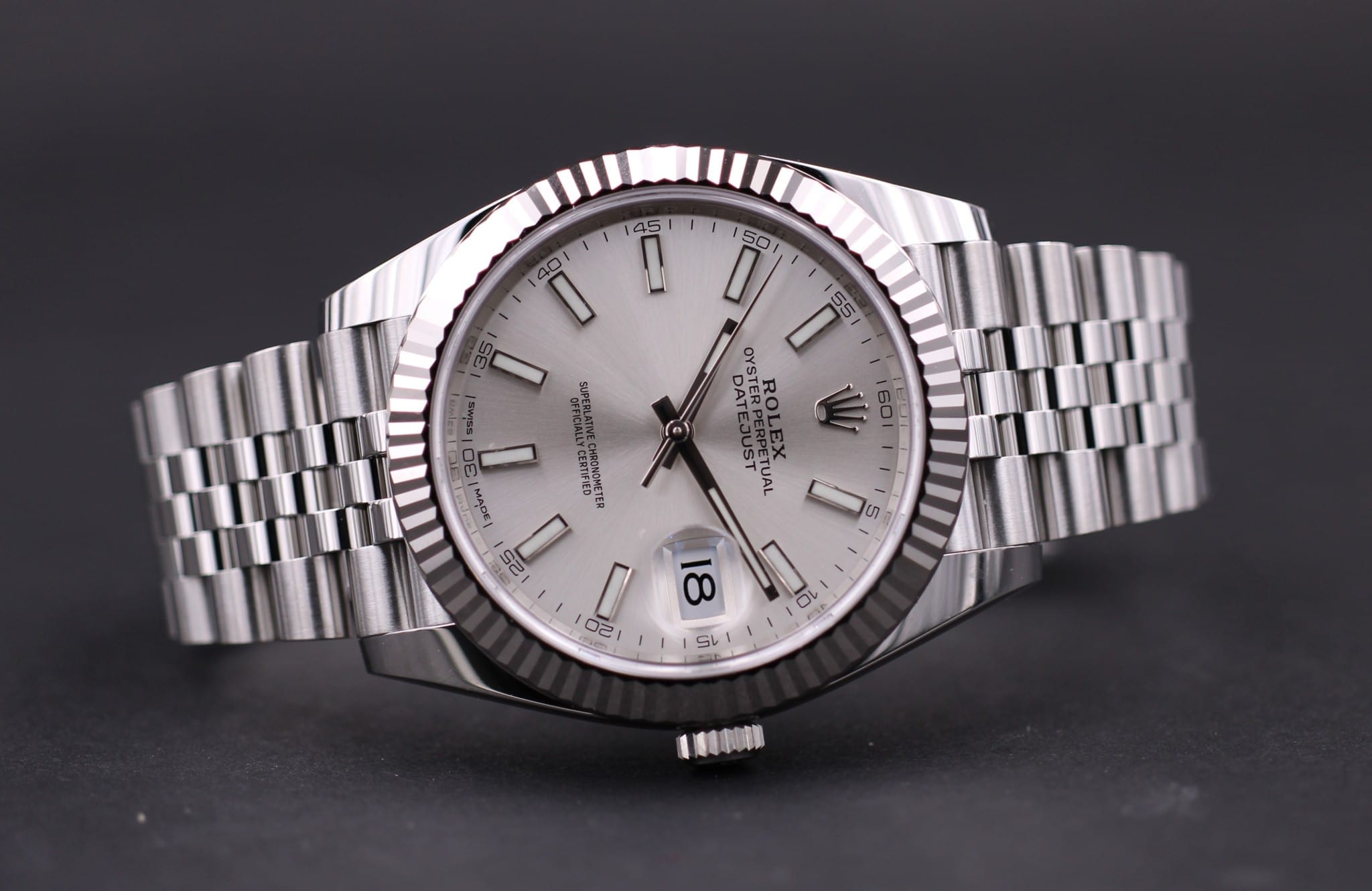 Klassisk Datejust model i 41mm, her med en flot silver dial samt riflet hvidgulds lynette. Uret er monteret på en Jubilee lænke.