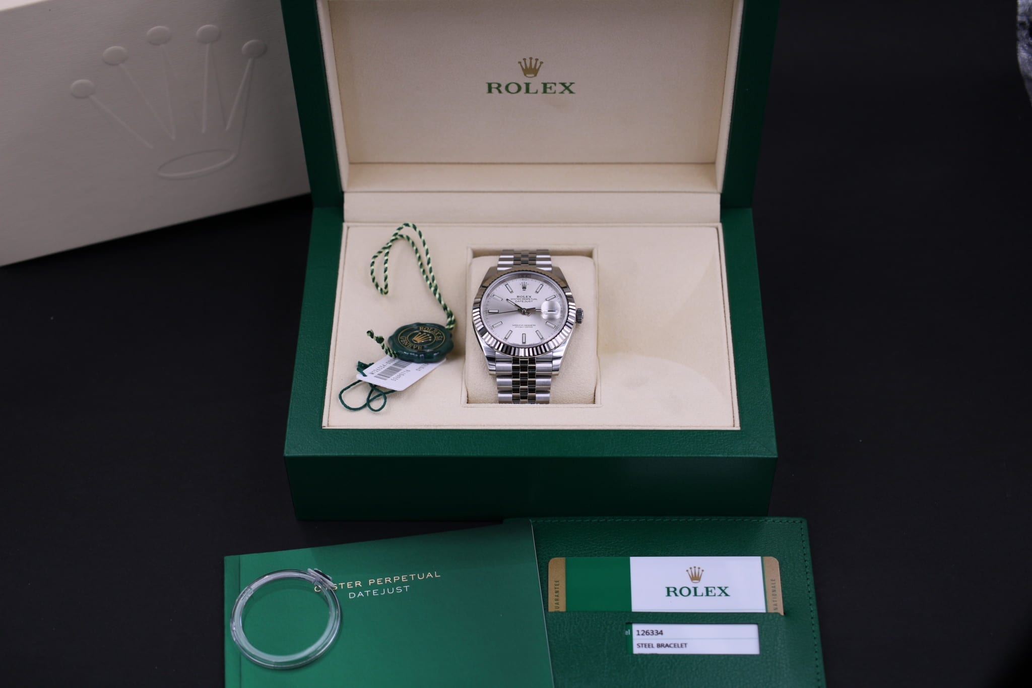 Mærke: Rolex Model: Datejust 41 Ref. nr.: 126334 Årgang: 2017 Tilbehør: Boks, papirer og certifikat Funktioner: dato Størrelse: 41m Stand: 95%