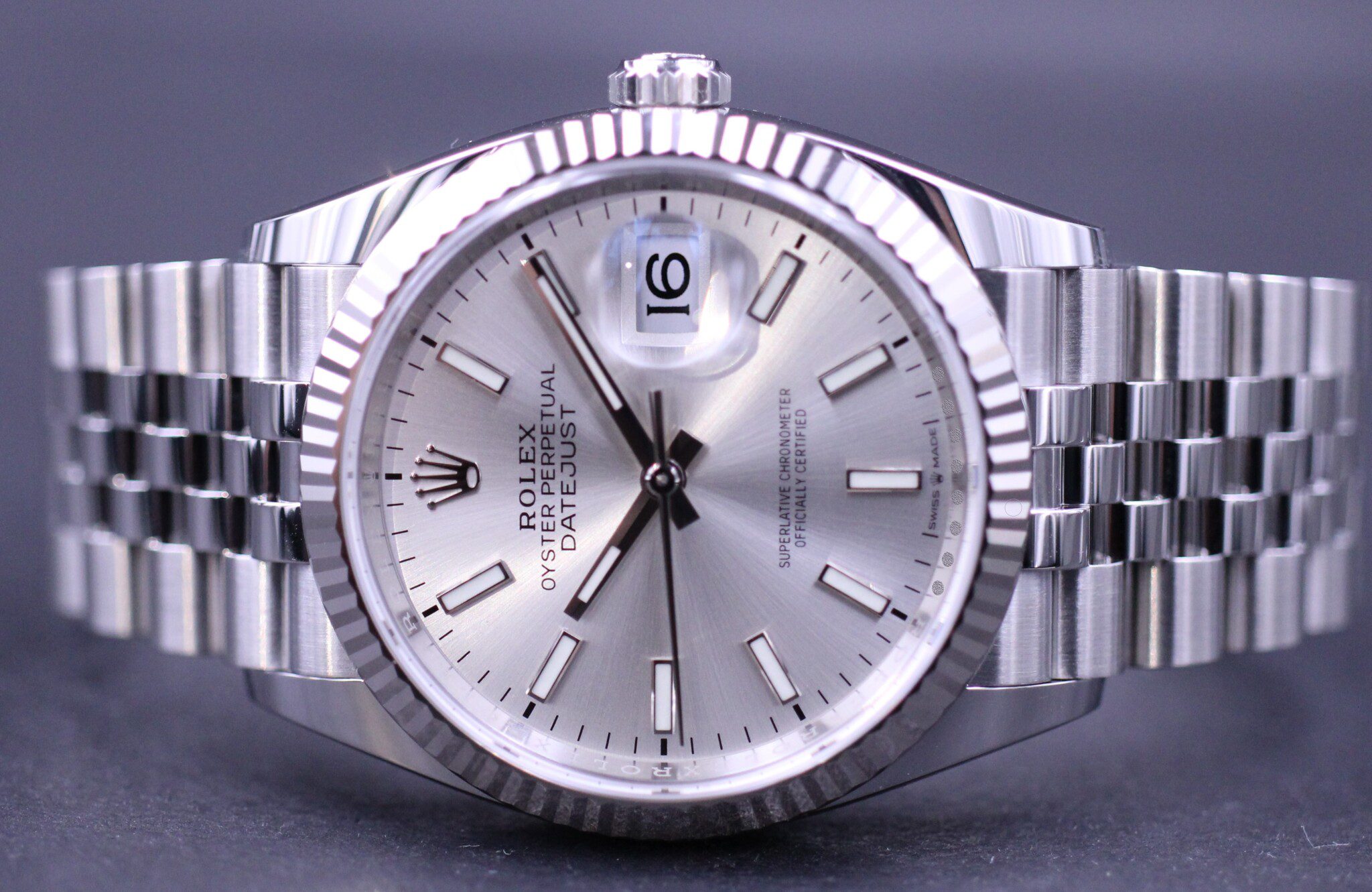 Yderst populær Datejust til både mænd og kvinder i 36mm. Her med en flot sølv skive.