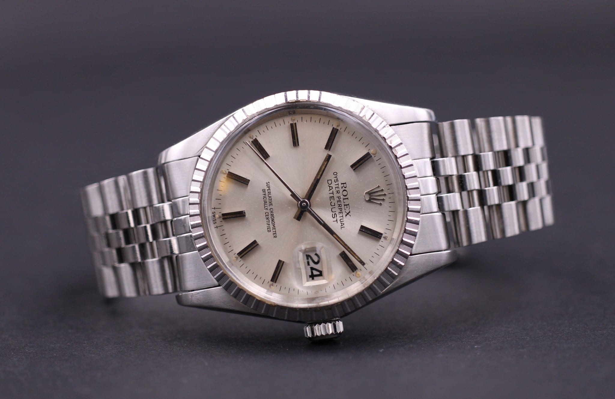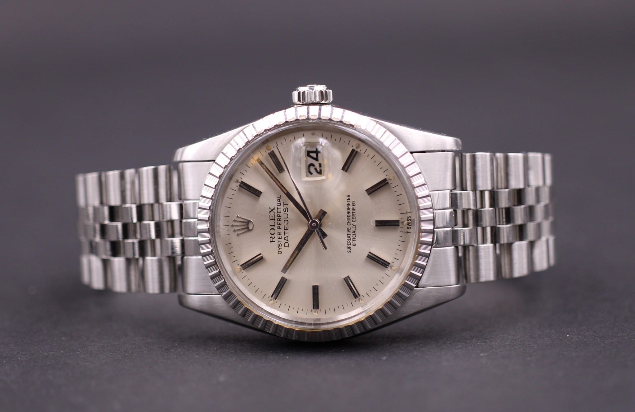 Smuk Datejust her i kombinationen med jubilee lænken og riflet lynette. Der sidder en yderst smuk sølv skive i uret. Tritium lume plots der er flot creme patineret.