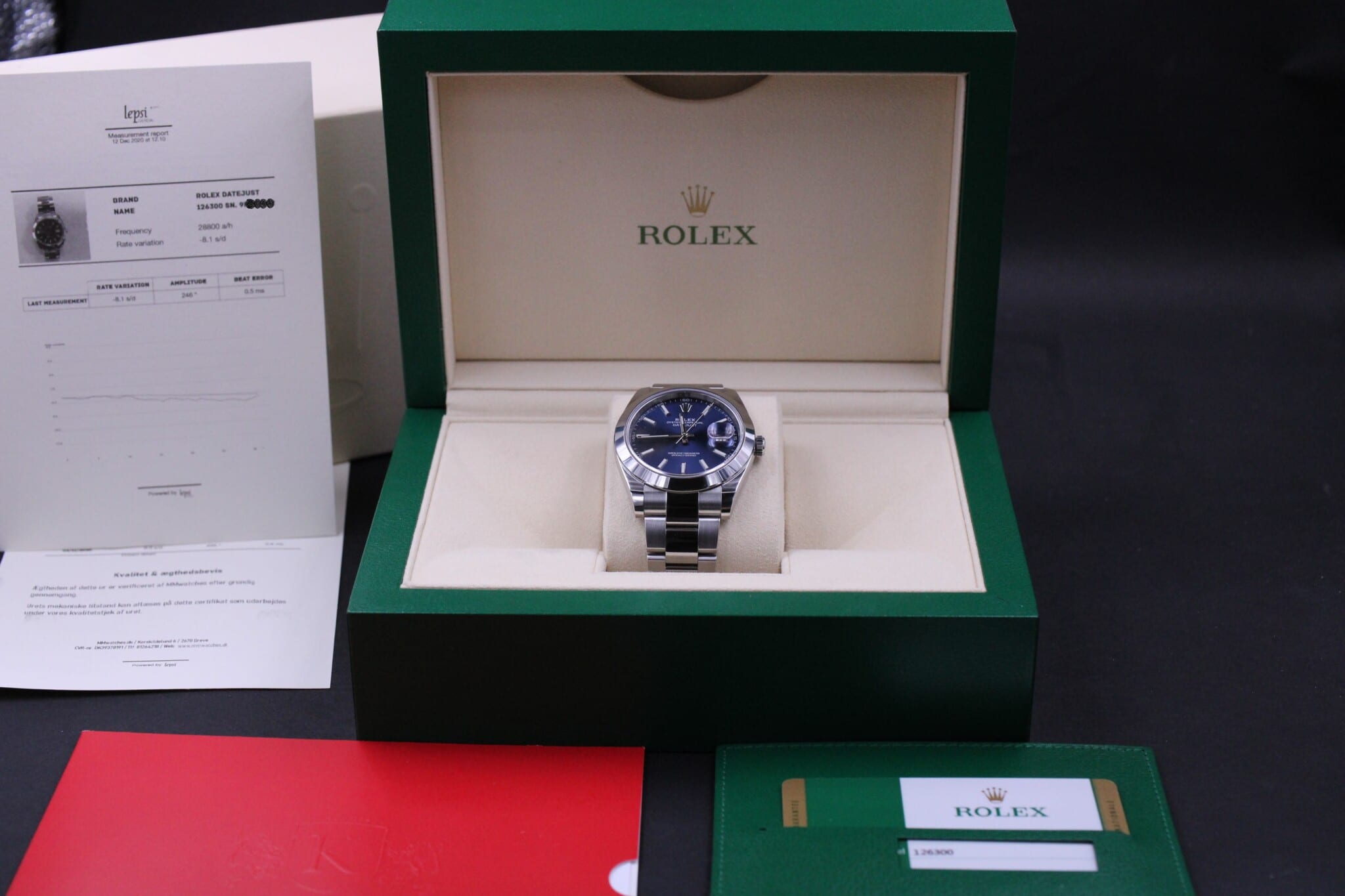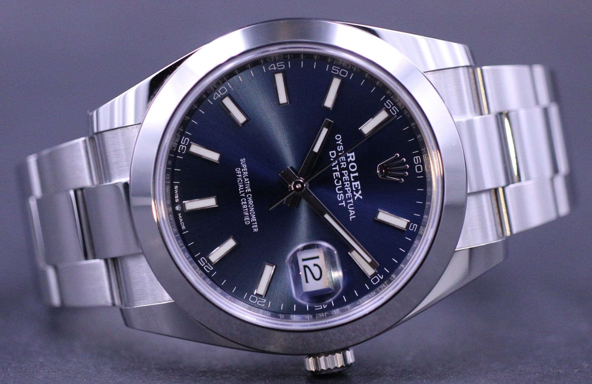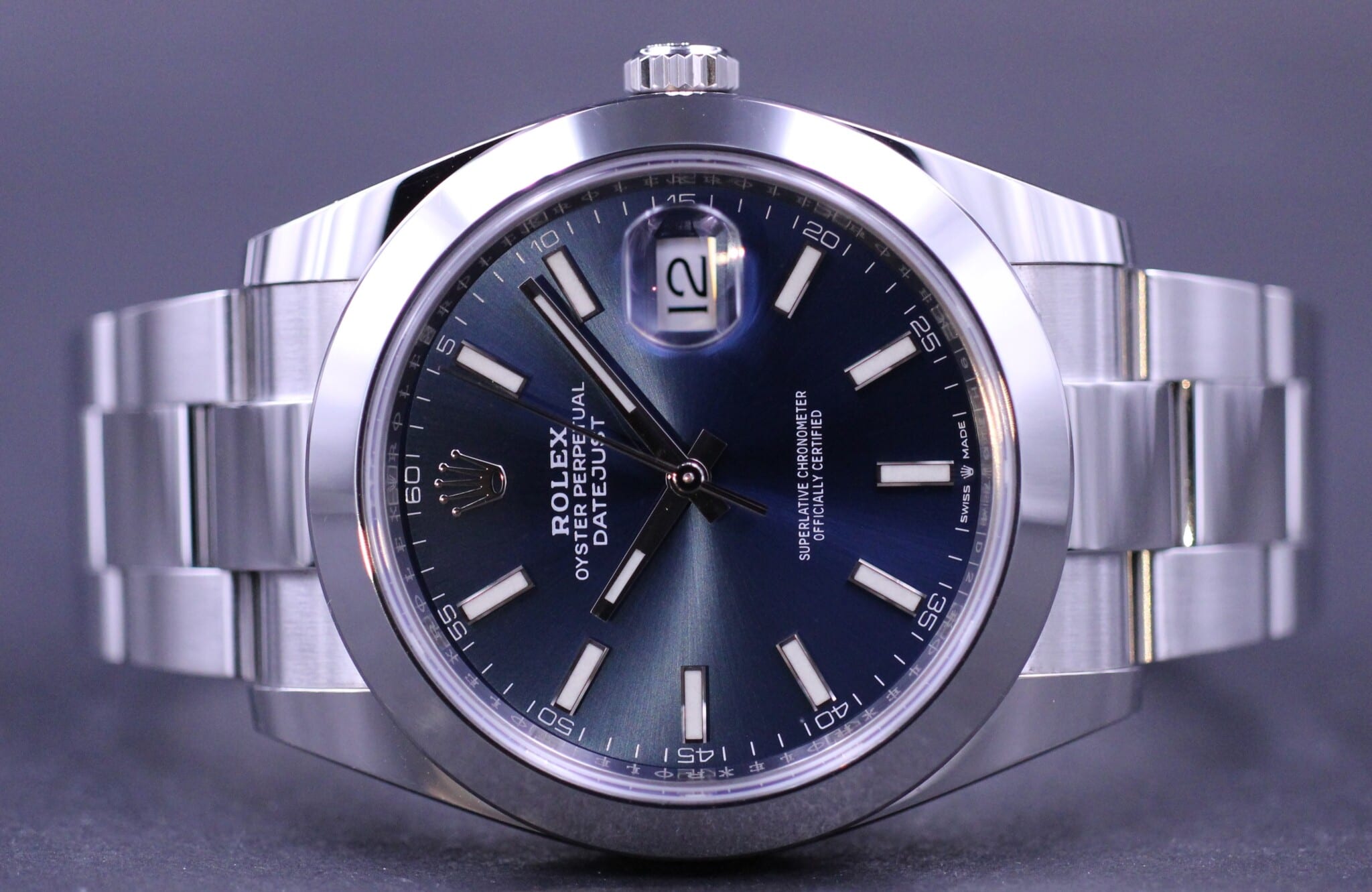 Lækkert eksemplar af den nyeste Datejust 41mm udgave. Her med flot blå sunburst skive samt smooth bezel. Uret sidder på den populære Oyster lænke, låsen er med extension link der gør et muligt at justere spændet 5mm uden værktøj.