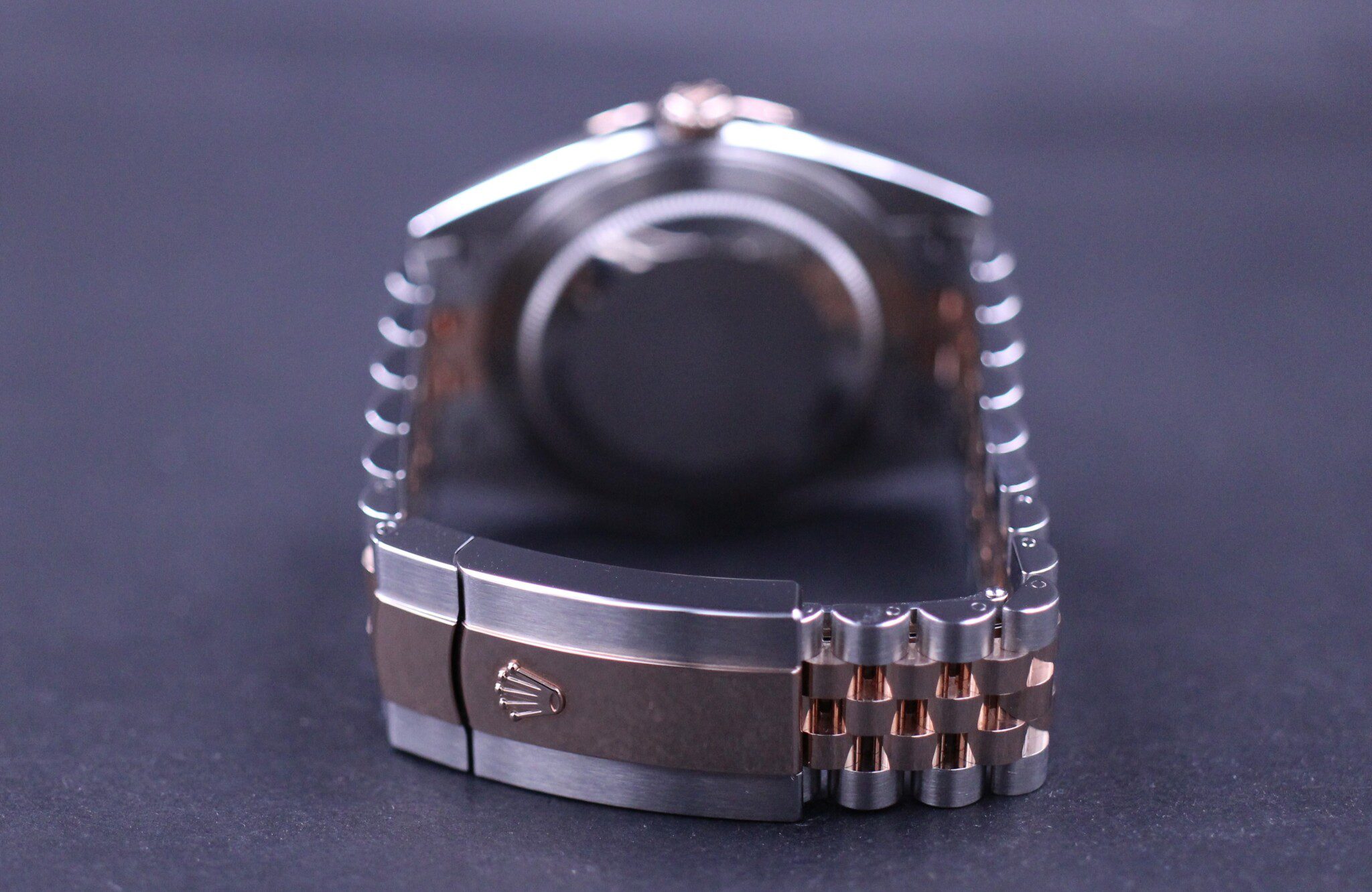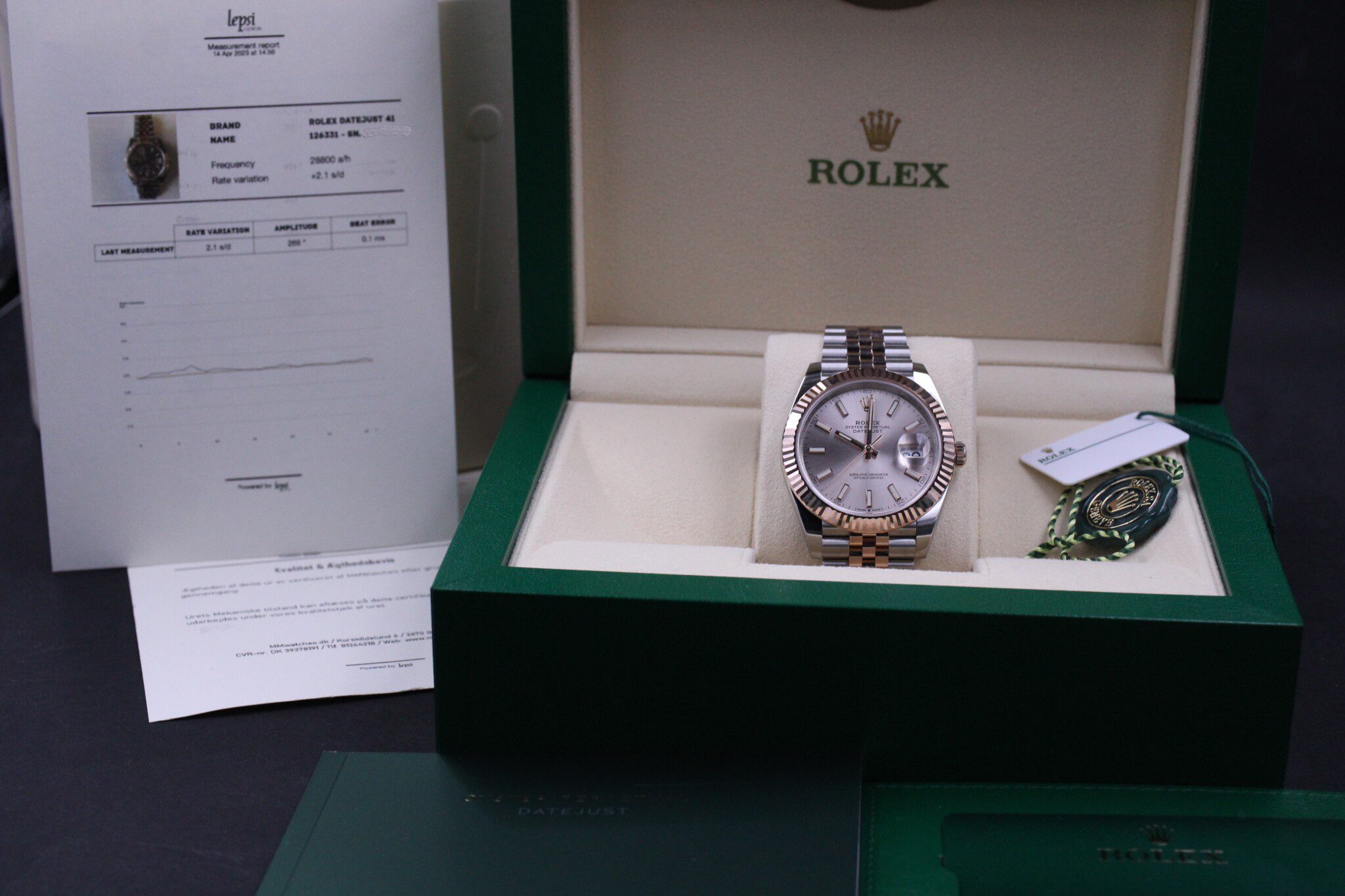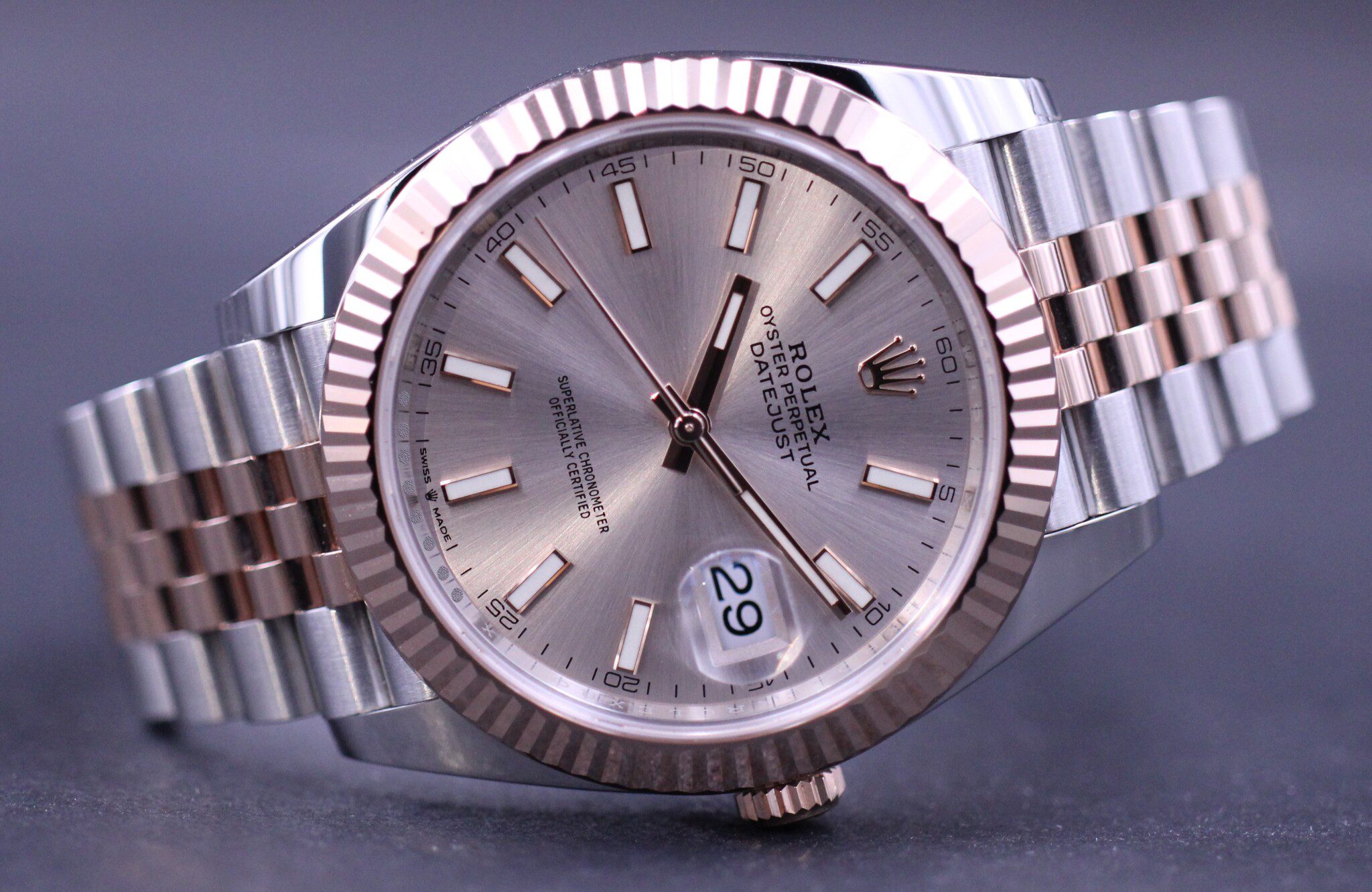 Flot eksemplar af den nyeste 41mm udgave, af den velkendte Datejust model, her i Everose guld og stål med den smukke sunburst skive samt riflet Everose lynette. Uret sidder på en Jubilee lænke. Låsen er med extension link der gør det muligt at justere spændet 5mm uden hjælp af værktøj.