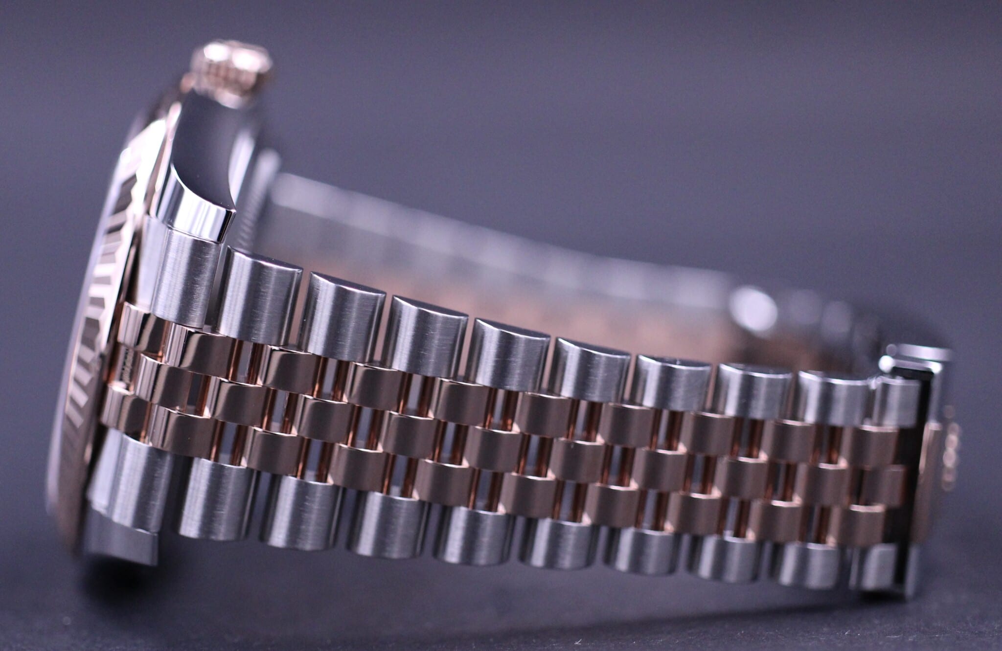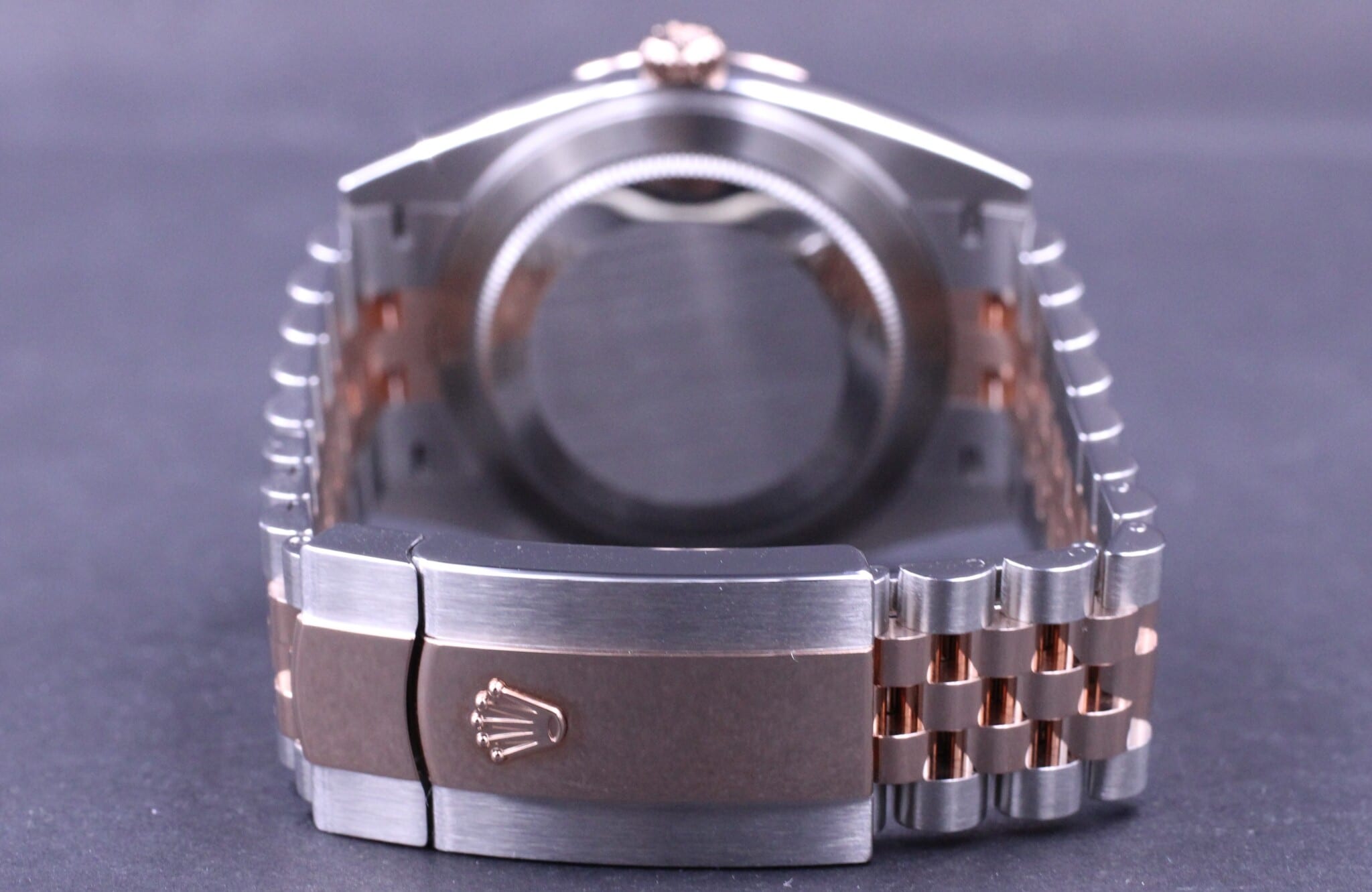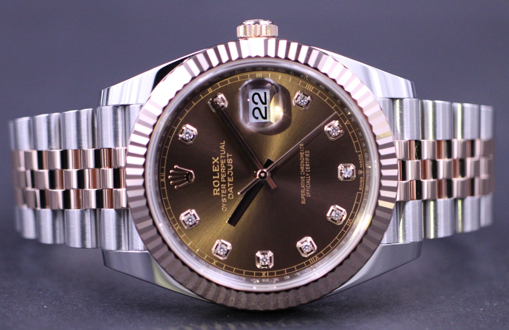 Flot eksemplar af den nyeste 41mm udgave, af den velkendte Datejust model, her i Everose guld og stål og smuk Choko diamant skive samt riflet Everose lynette. Uret sidder på en Jubilee lænke, låsen er med extension link der gør det muligt at justere spændet 5mm uden værktøj.
