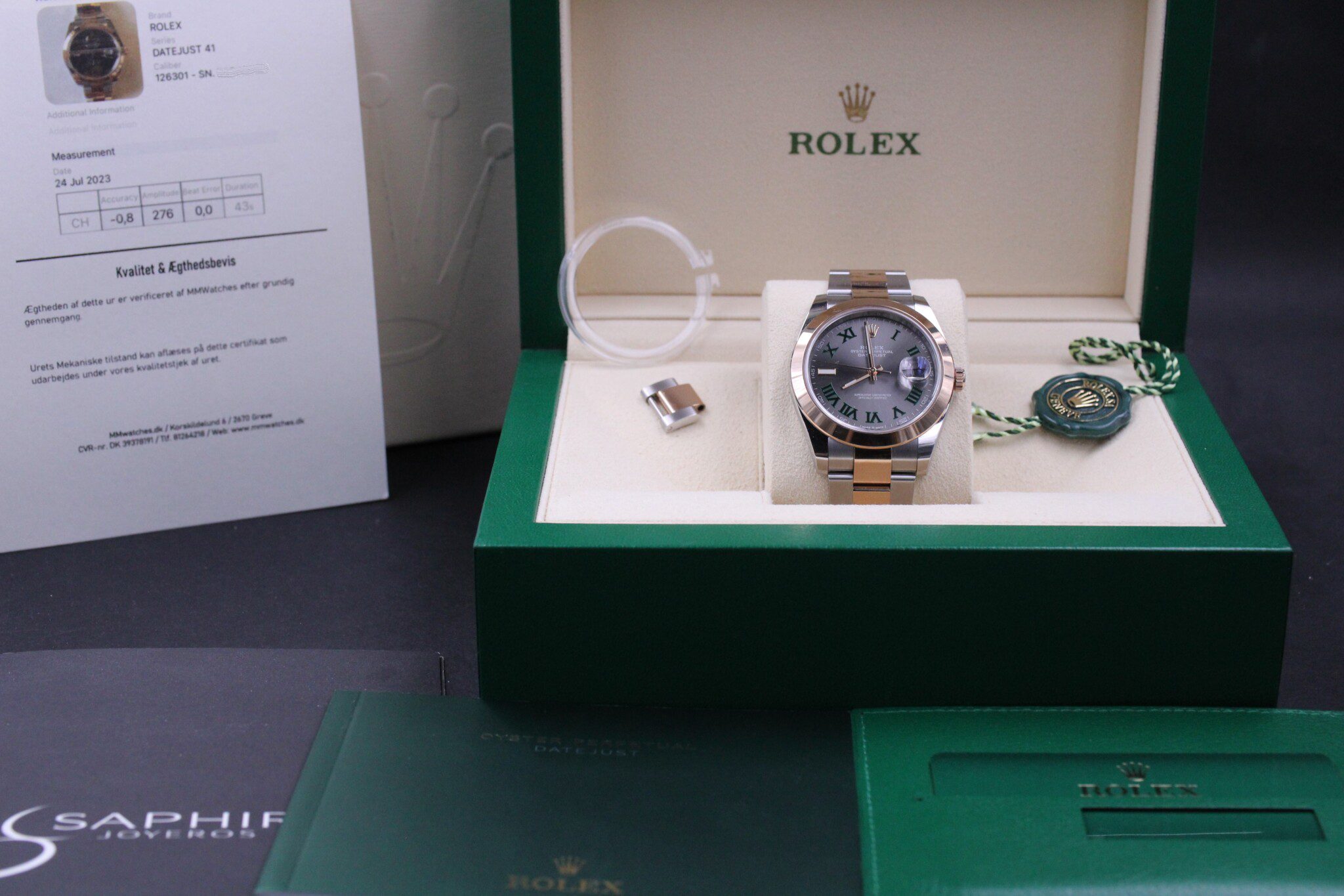 Uret kommer som et komplet sæt med bokse, manualer, certifikat, hangtag, bezelbeskytter, original købskvittering, mv.