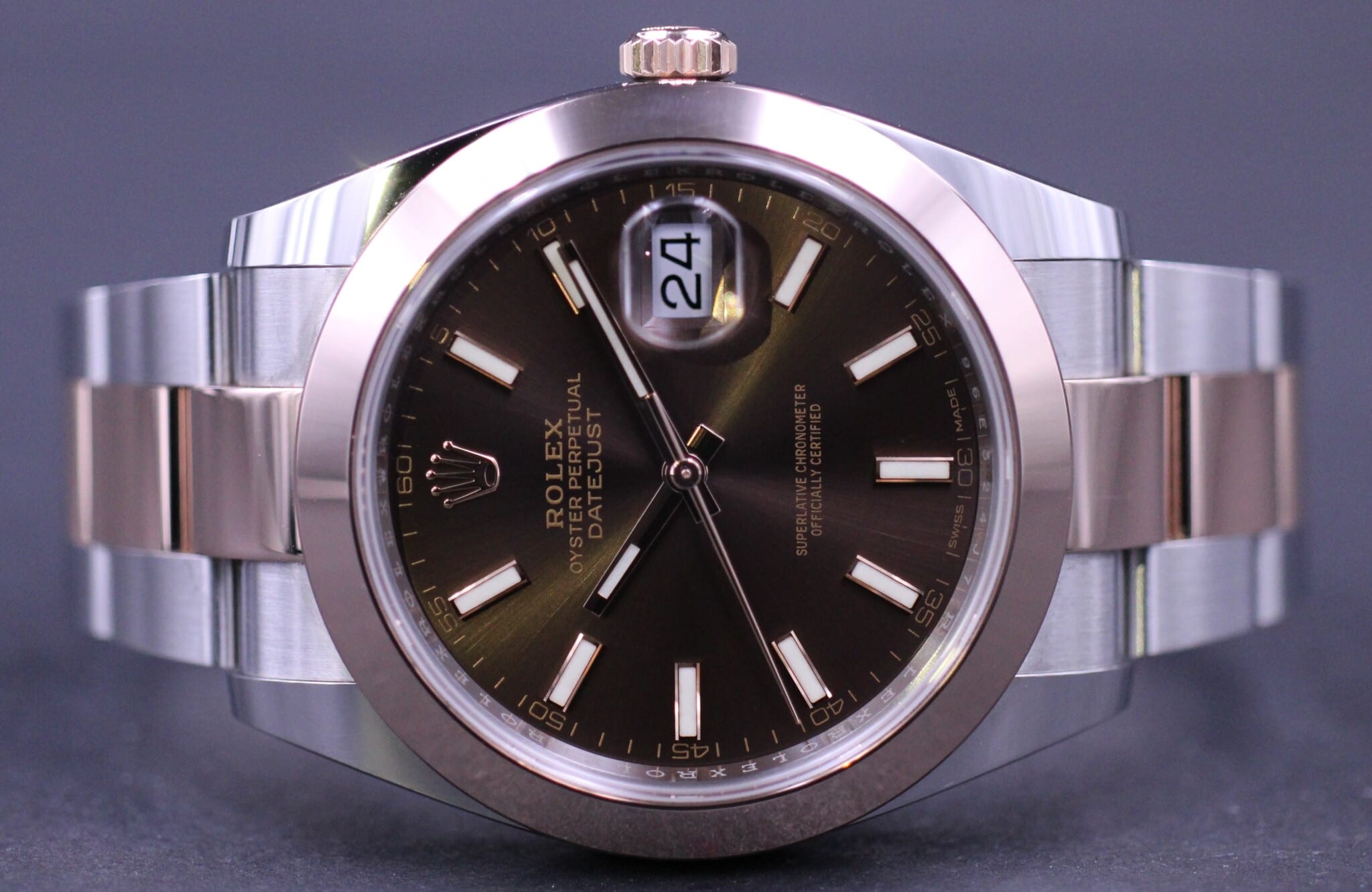 Den seneste 41mm udgave, af den velkendte og klassiske Datejust model, her i stål og Everose guld med flot og elegant choko skive samt glat lynette. Låsen i lænken er med extension link, der gør det muligt at justere spændet 5mm.