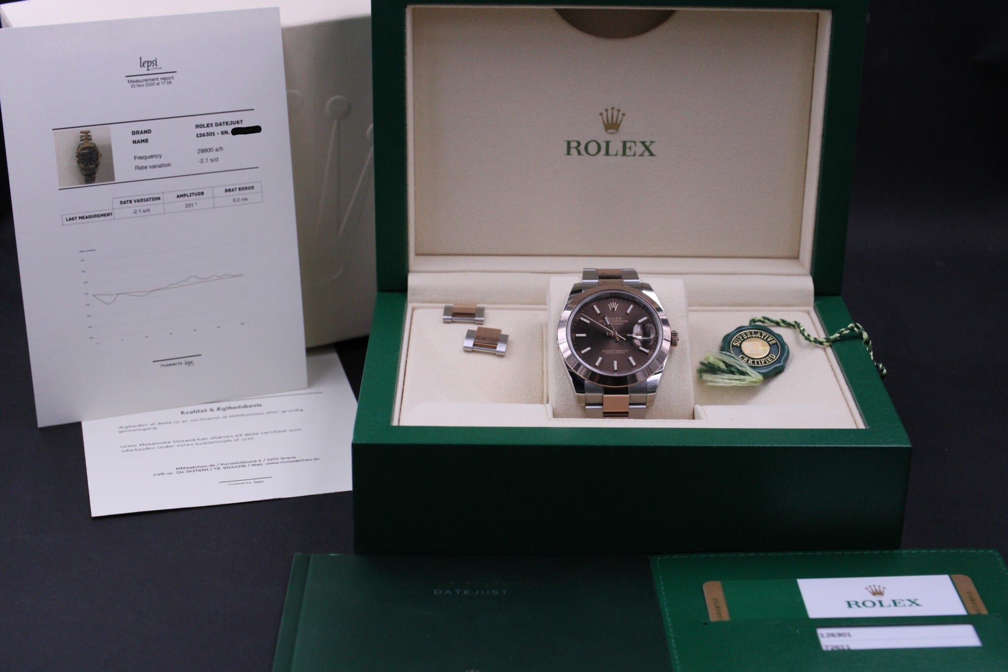 Med til dette ur medfølger MMwatches ”Kvalitet og ægthedsbevis”. Gennem vores grundige gennemgang af uret, fastslår vi at uret er 100% originalt. Urets mekaniske tilstand er testet og lever op til vores kvalitetskrav. Målingerne kan ses i det medfølgende bevis.
