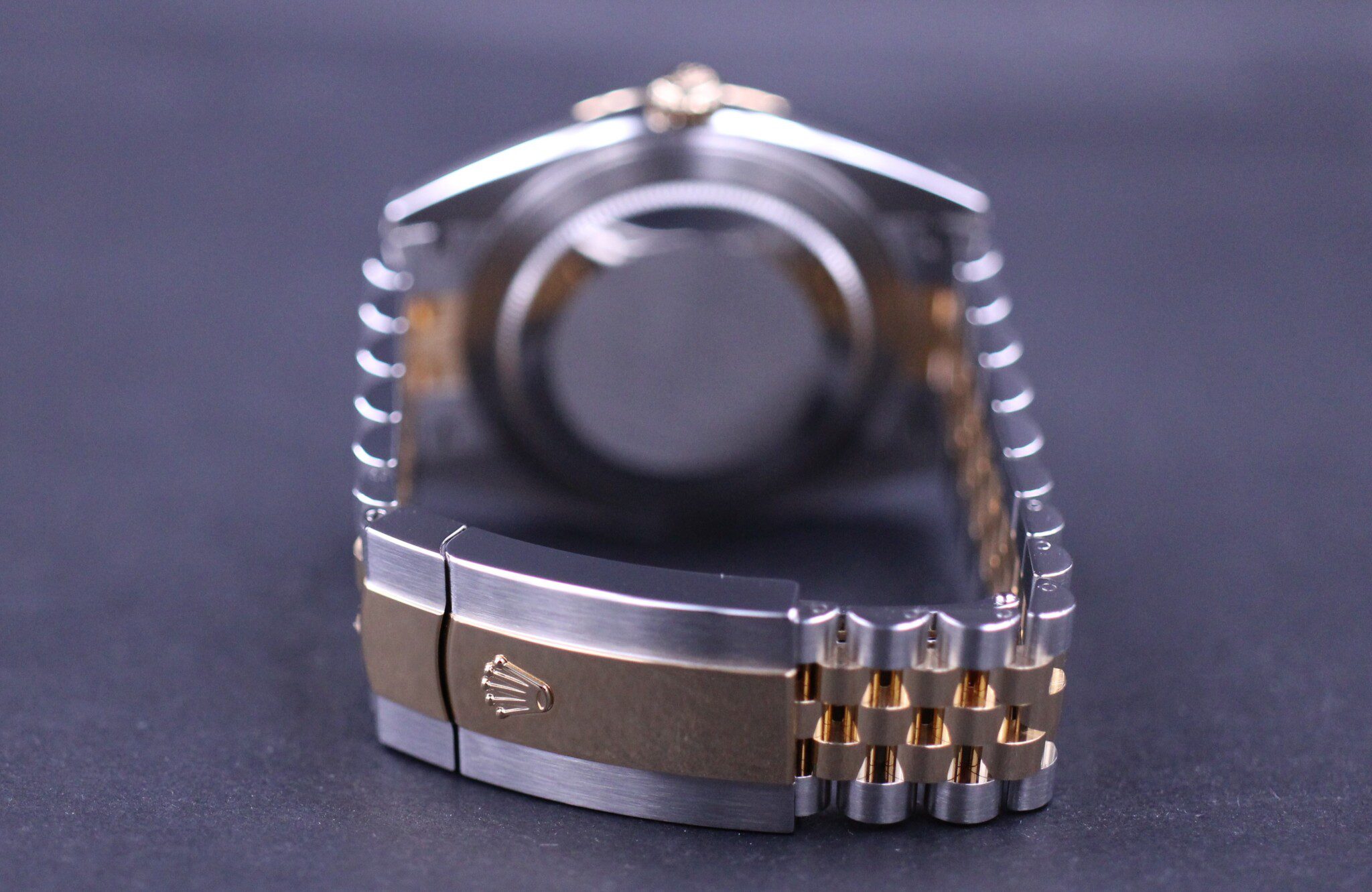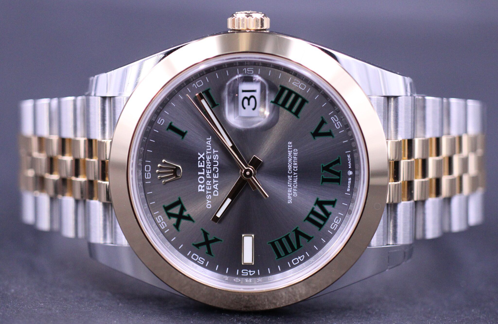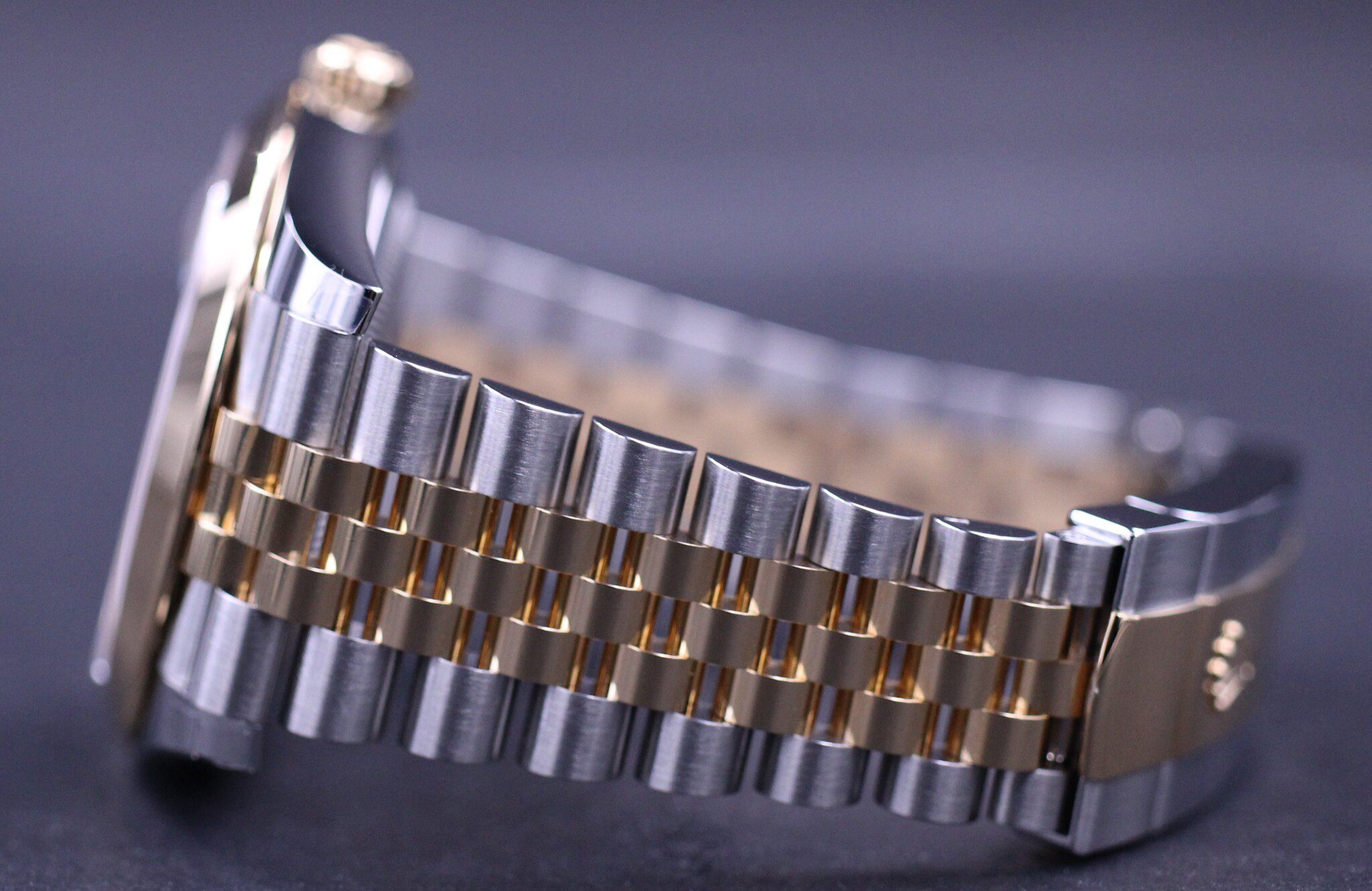 Lækkert eksemplar af den seneste 41mm udgave, af den velkendte og klassiske Datejust model i guld og stål. Kommer her med den eftertragtede Wimbledon/slate skive samt glat guld lynette. Uret sidder på en jubilee lænke.