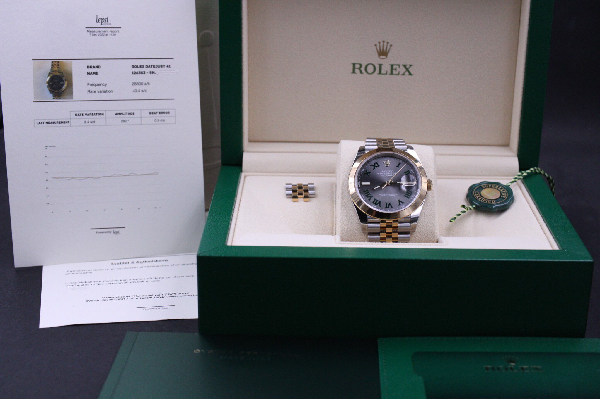 Mærke: Rolex Model: Datejust 41 Ref. nr.: 126303 Årgang: 2022 Tilbehør: Boks, papirer & certifikat Funktioner: Dato Størrelse: 41mm Stand: 100%