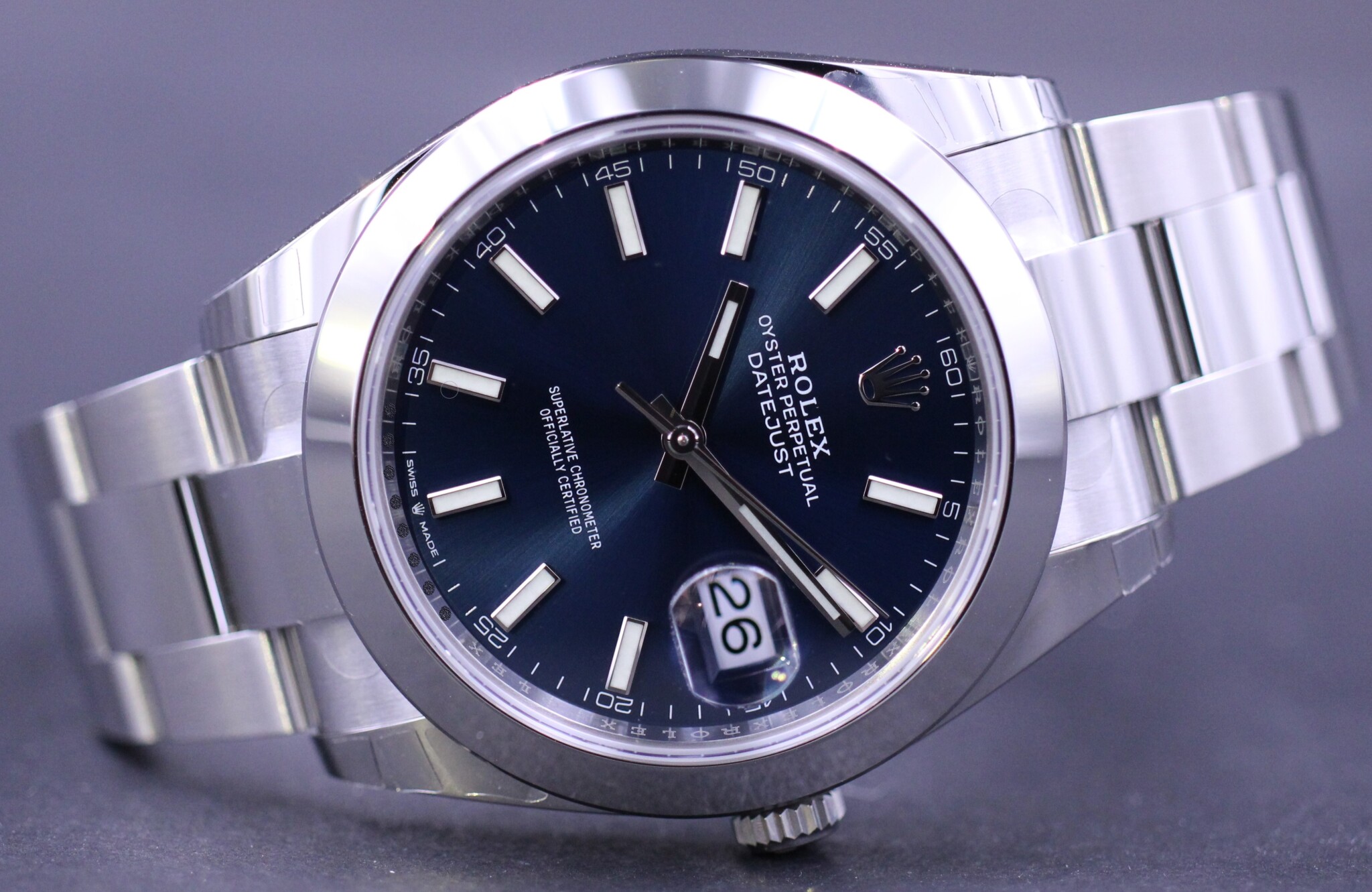 Lækkert eksemplar af den nyeste Datejust 41mm udgave. Her med flot blå sunburst skive samt smooth bezel. Uret sidder på den populære Oyster lænke, låsen er med extension link der gør et muligt at justere spændet 5mm uden værktøj.