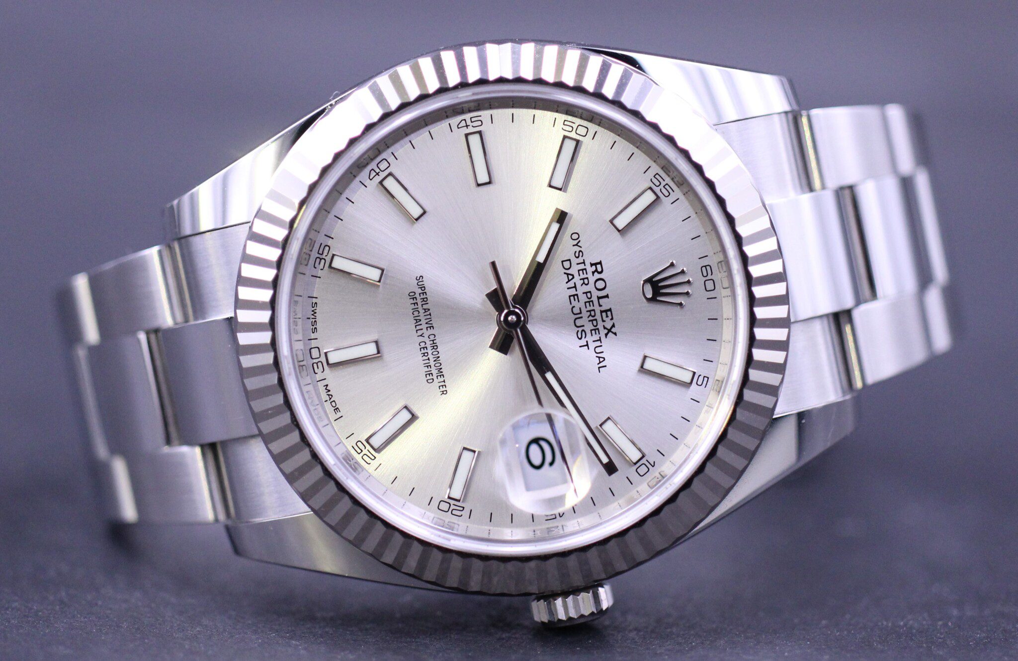 Klassisk Datejust model i 41mm, her med den flotte sunburst silver dial samt riflet hvidgulds lynette. Uret er monteret på en Oyster lænke.
