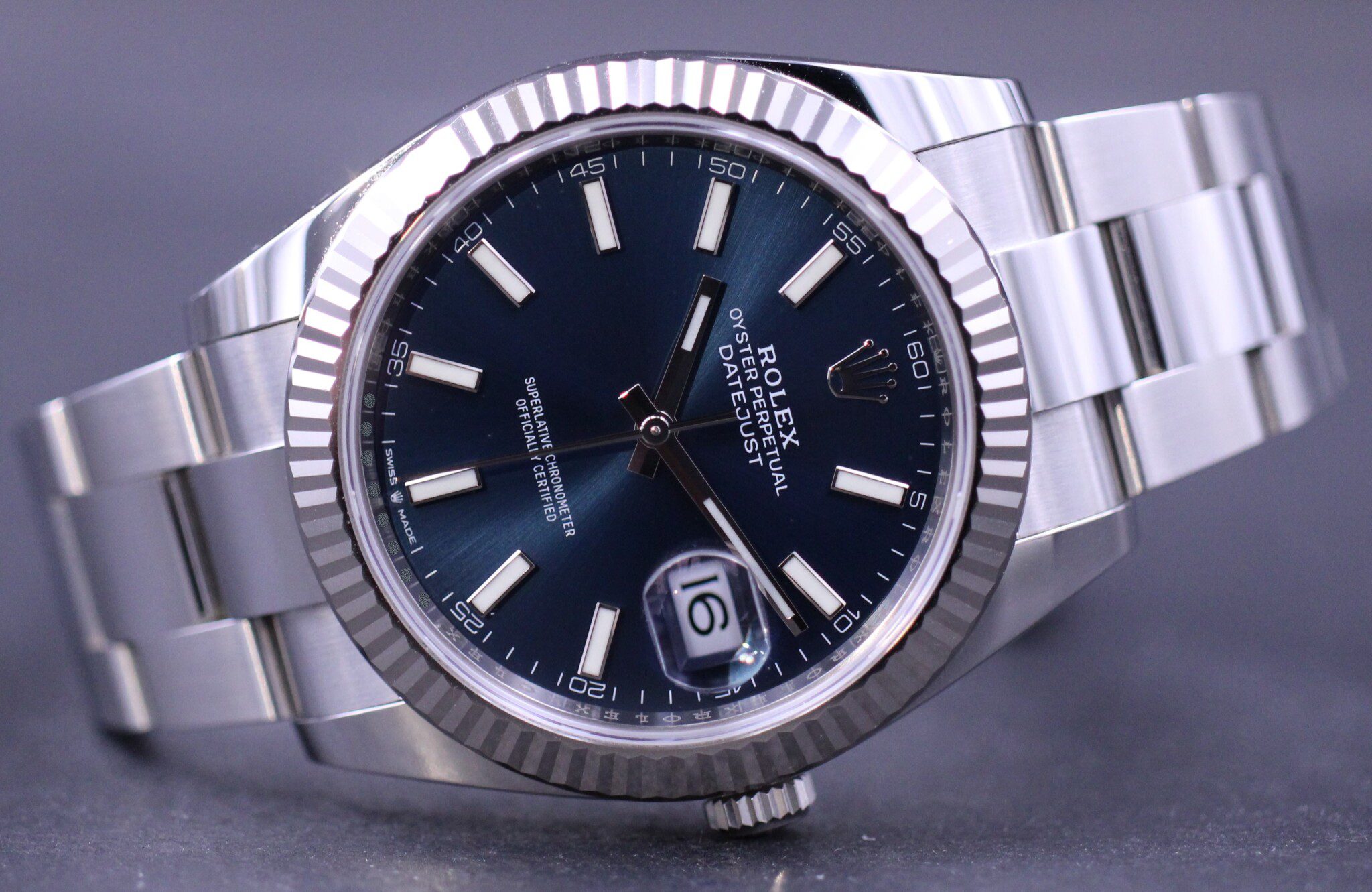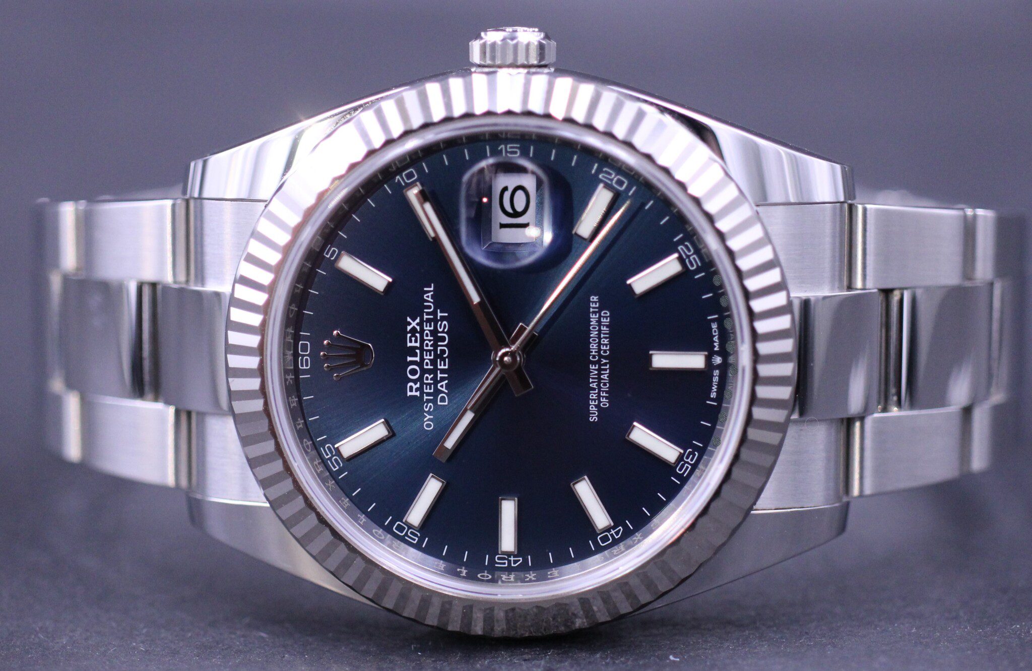 Klassisk Datejust model i 41mm, her med den flotte blå sunburst skive samt riflet hvidgulds lynette. Uret er monteret på en oyster lænke.