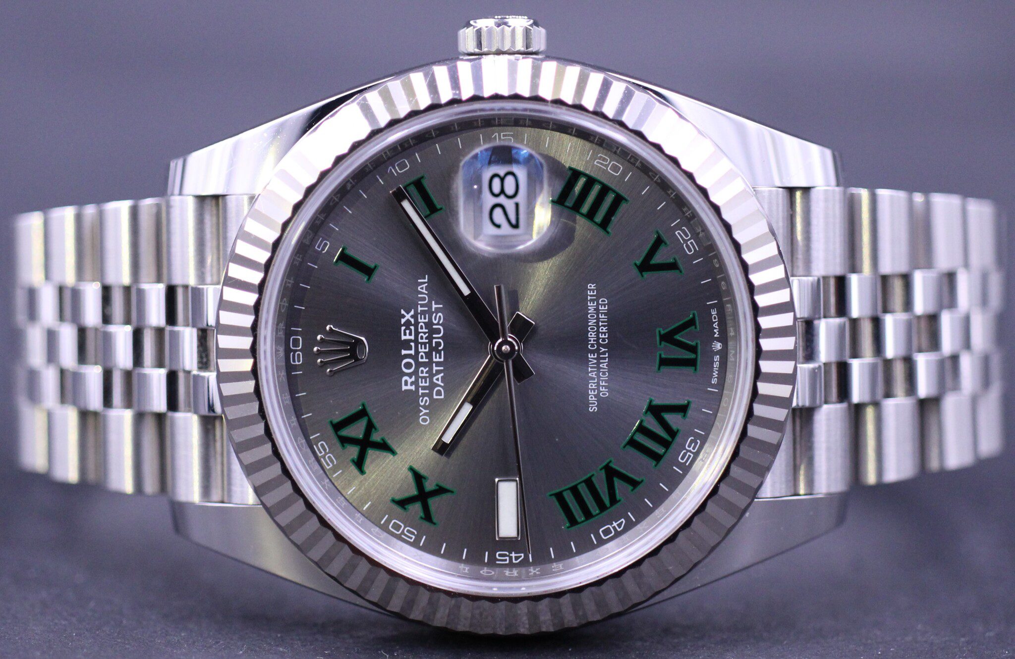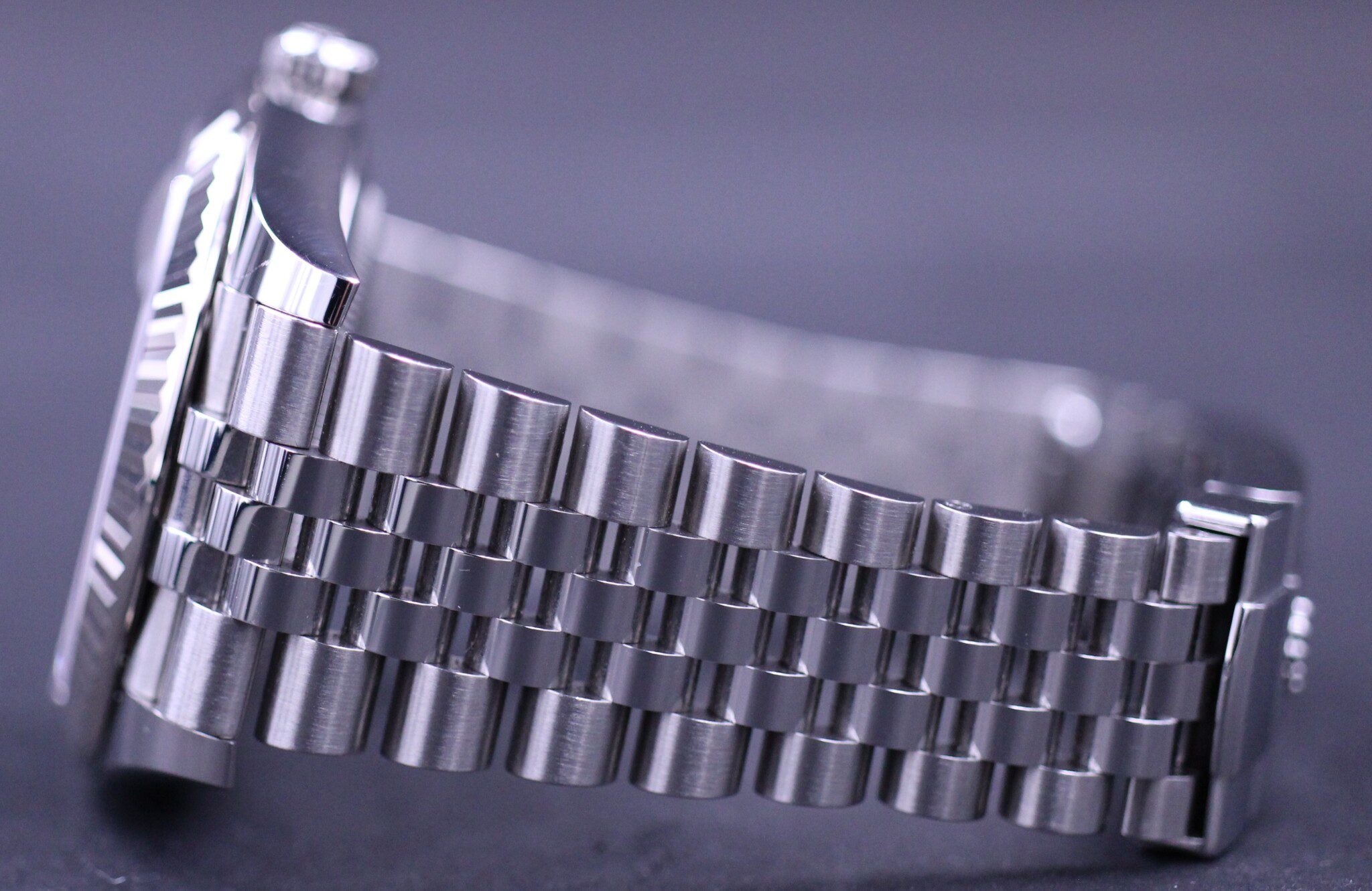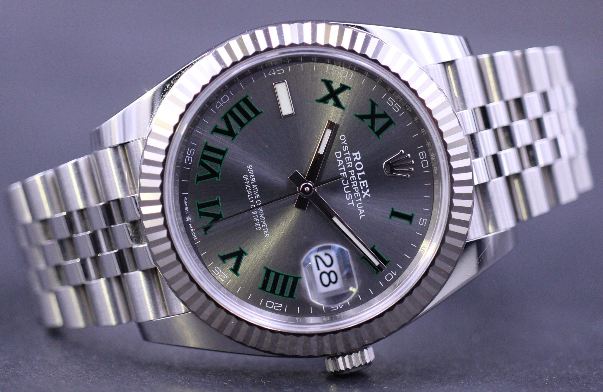 Klassisk Datejust model i 41mm, her med den flotte Wimbledon skive samt riflet hvidgulds lynette. Uret er monteret på en Jubilee lænke.