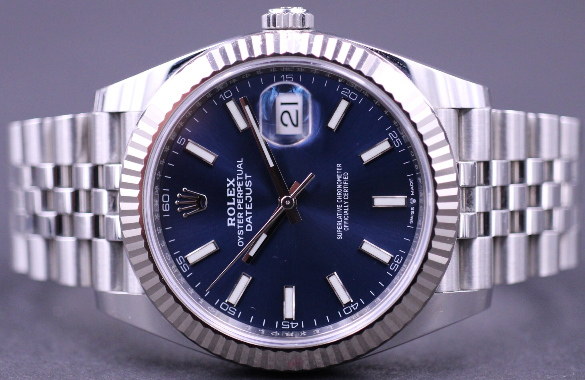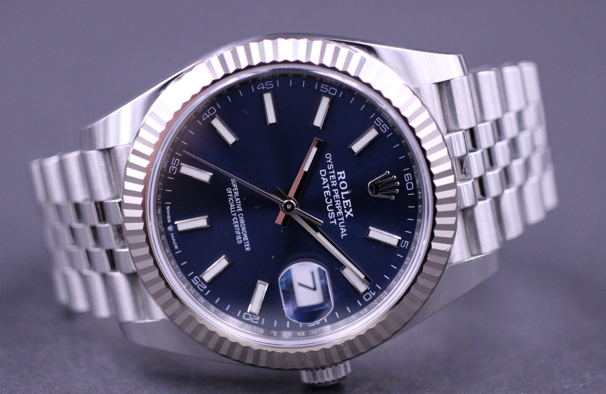 Klassisk Datejust model i 41mm, her med den flotte blå sunburst skive samt riflet hvidgulds lynette. Uret er monteret på en Jubilee lænke.