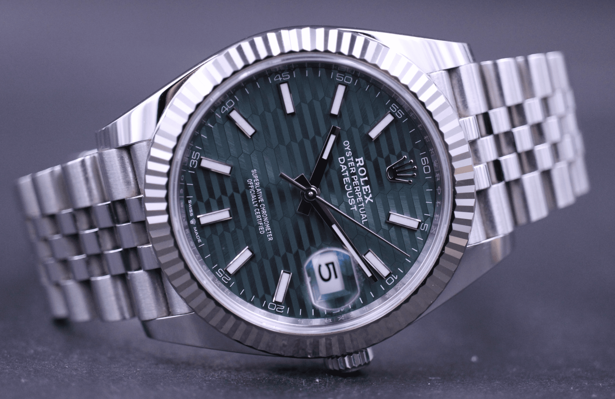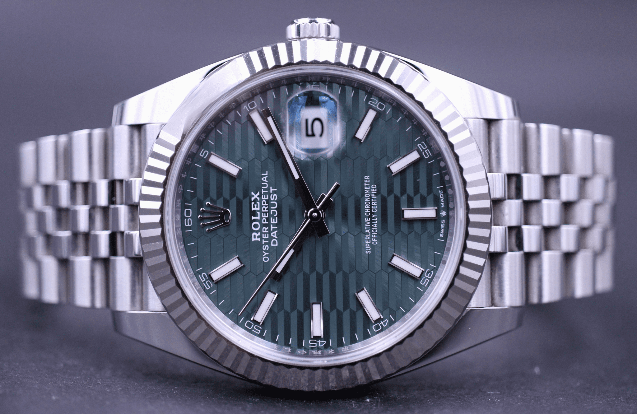 Klassisk Datejust model i 41mm, her med den flotte green motif skive med riflet hvidgulds lynette. Uret er monteret på en jubilee lænke.