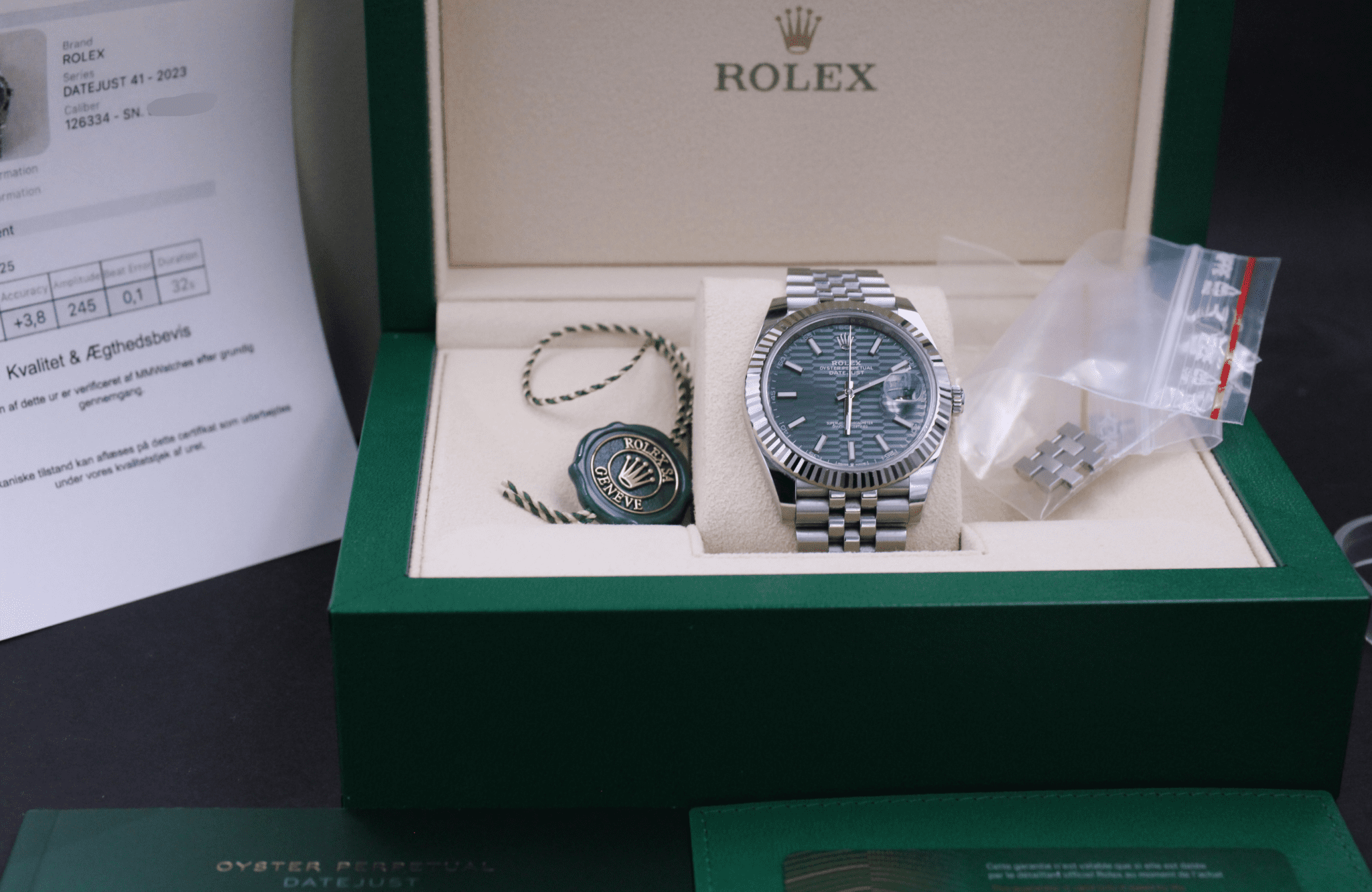 Mærke: Rolex Model: Datejust 41 Ref. nr.: 126334 Årgang: 2024 Tilbehør: Boks, papirer & certifikat Funktioner: Dato Størrelse: 41mm Stand: 98%