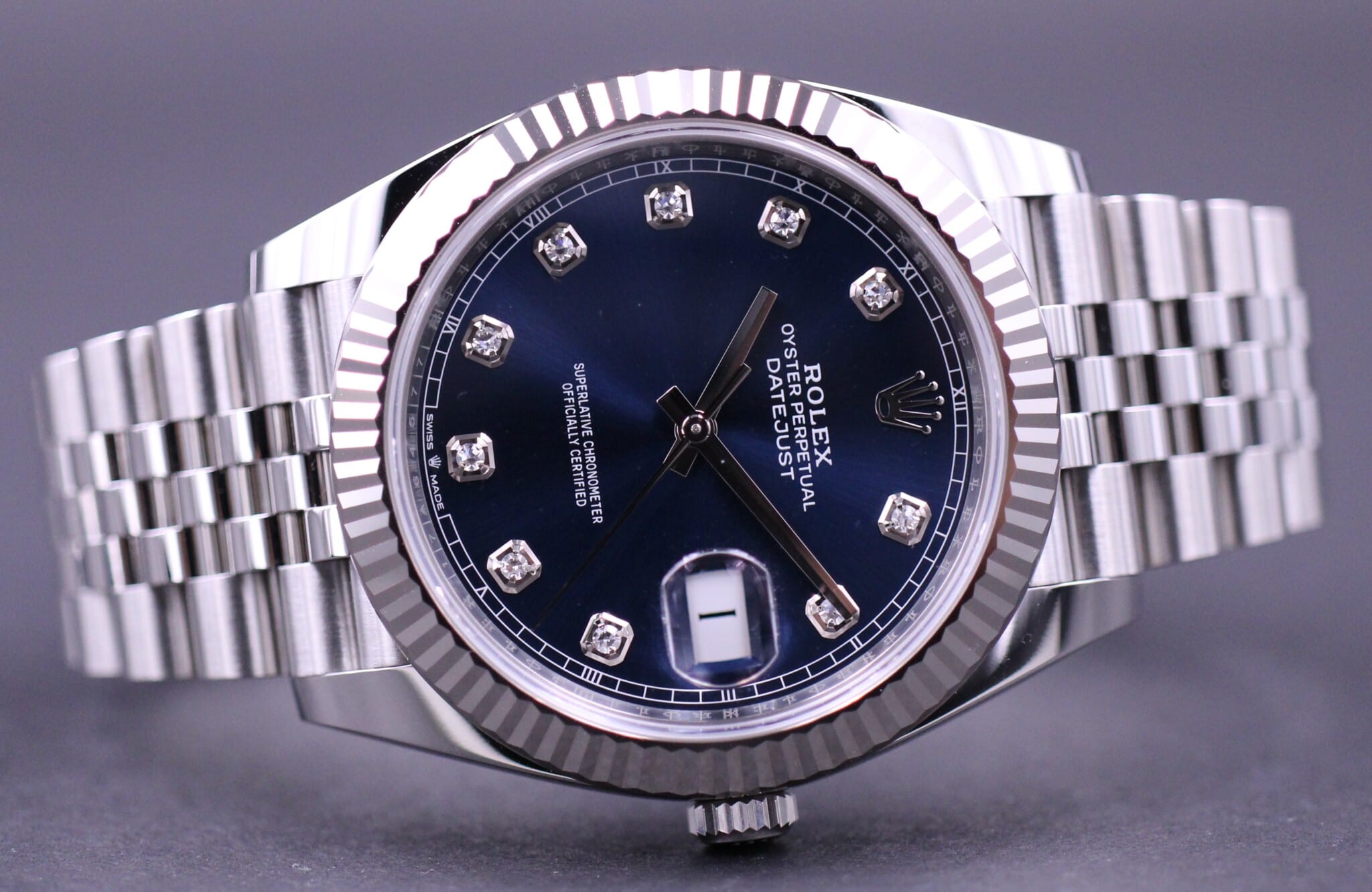 Klassisk Datejust model i 41mm, her med en flot blå diamond dial samt riflet hvidgulds lynette. Uret er på jubilee lænke.