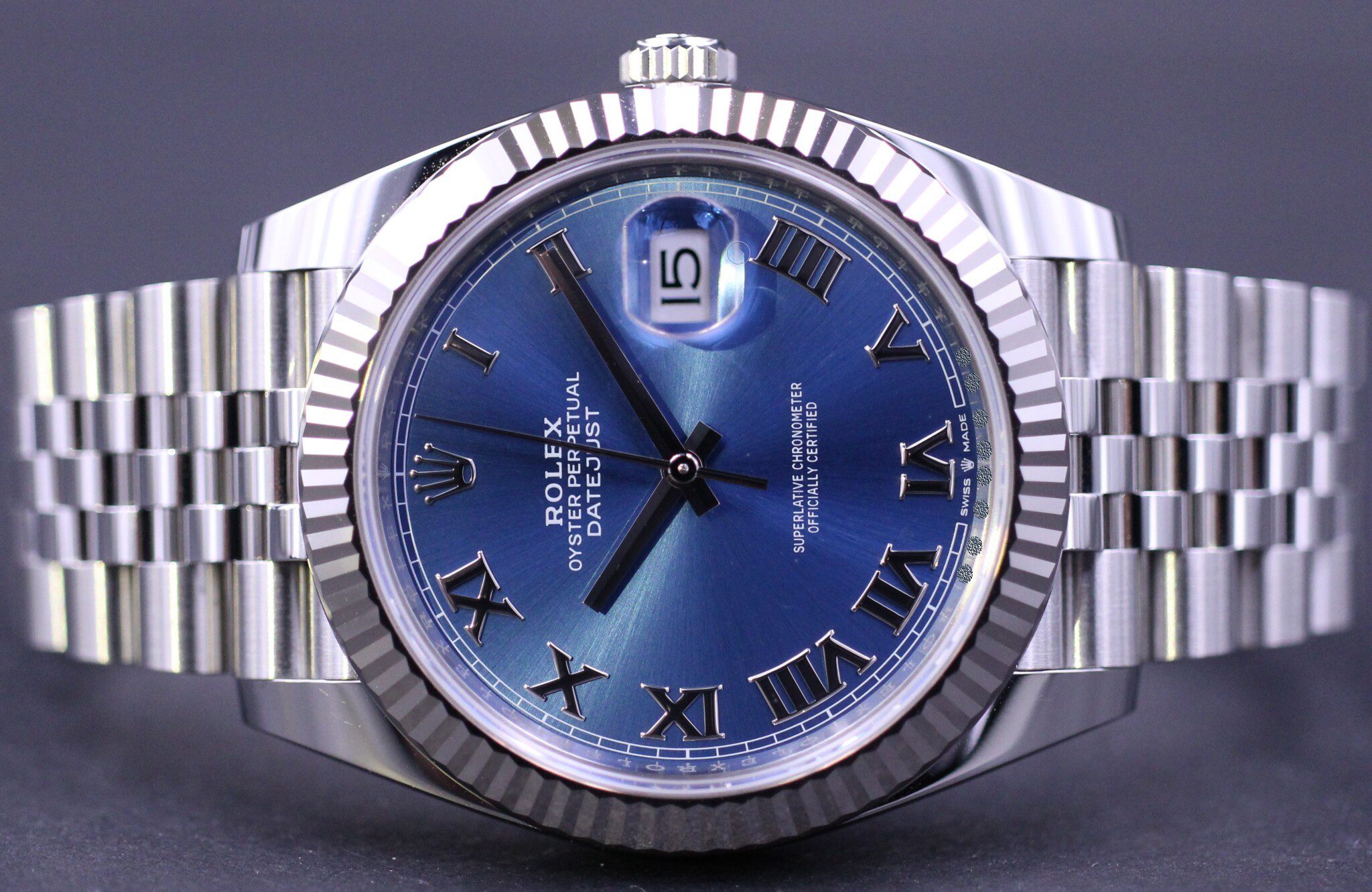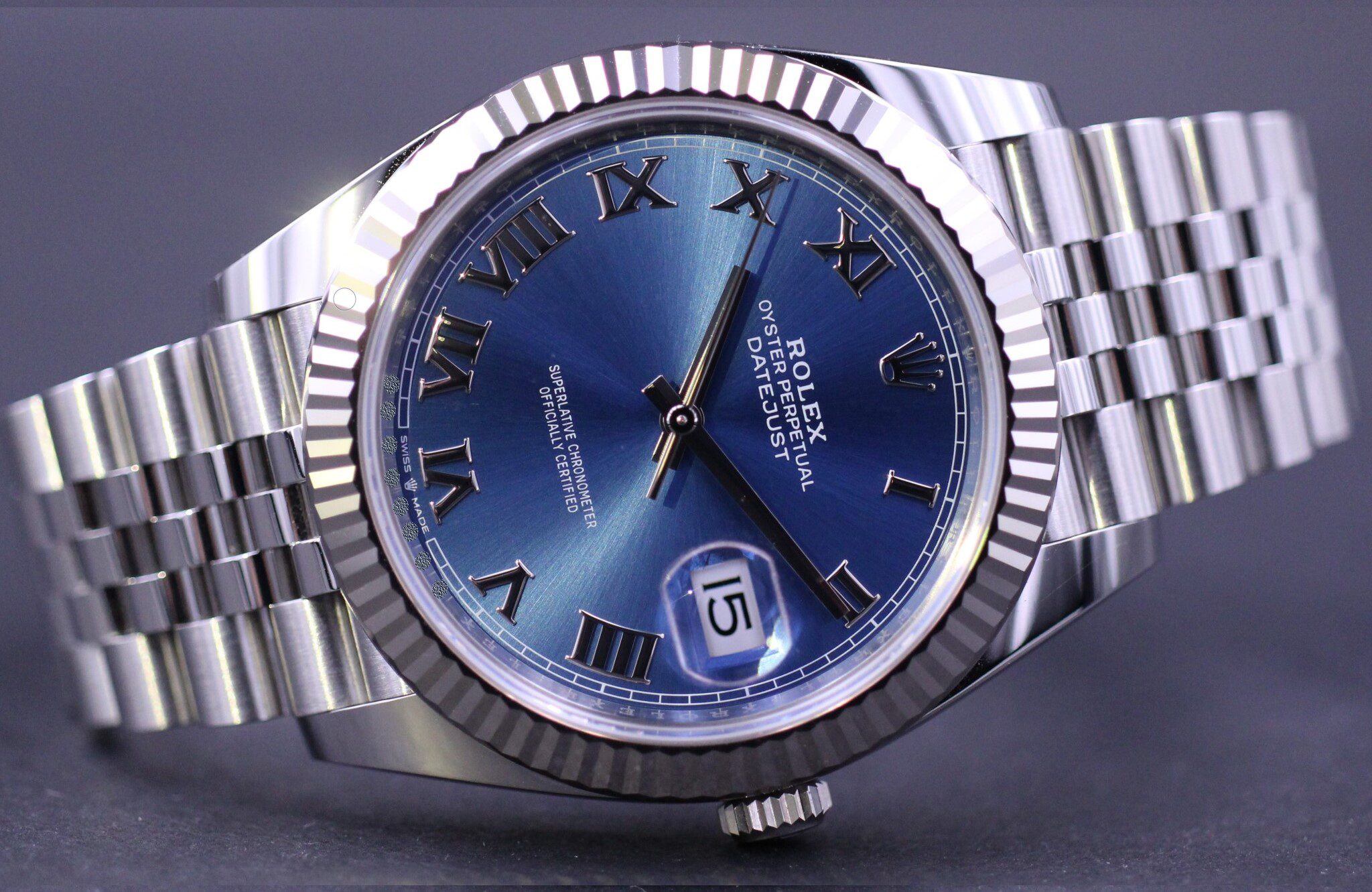 Klassisk Datejust model i 41mm, her med den flotte blå sunburst skive samt riflet hvidgulds lynette. Uret er monteret på en Jubilee lænke.