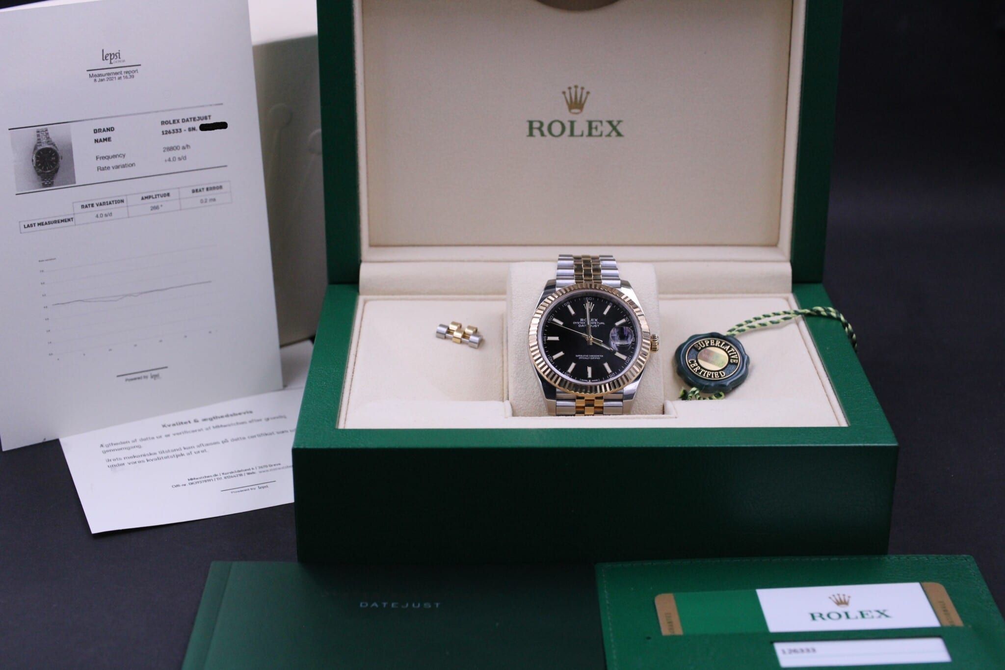 Uret kommer som et komplet sæt med bokse, manualer, certifikat, hangtag, mv.