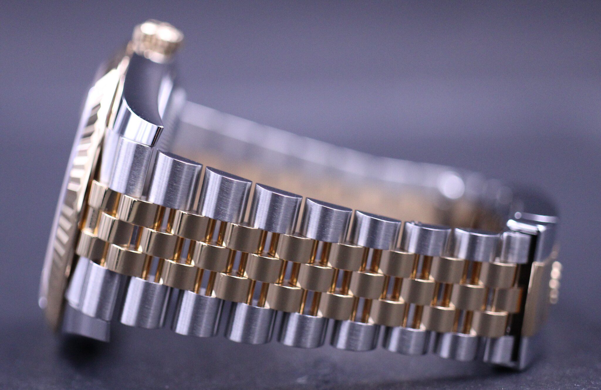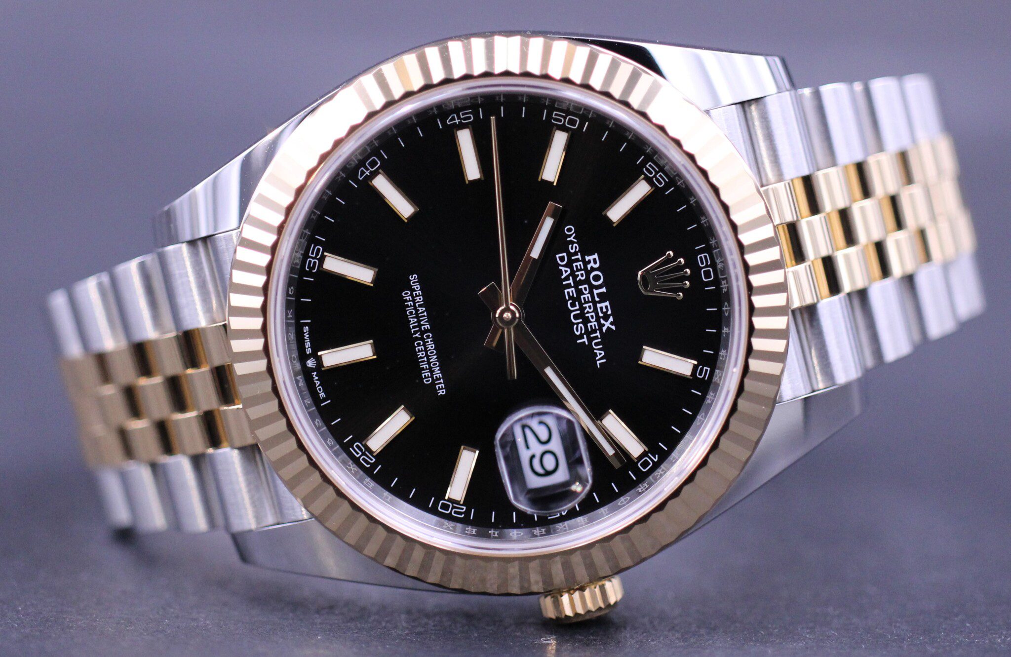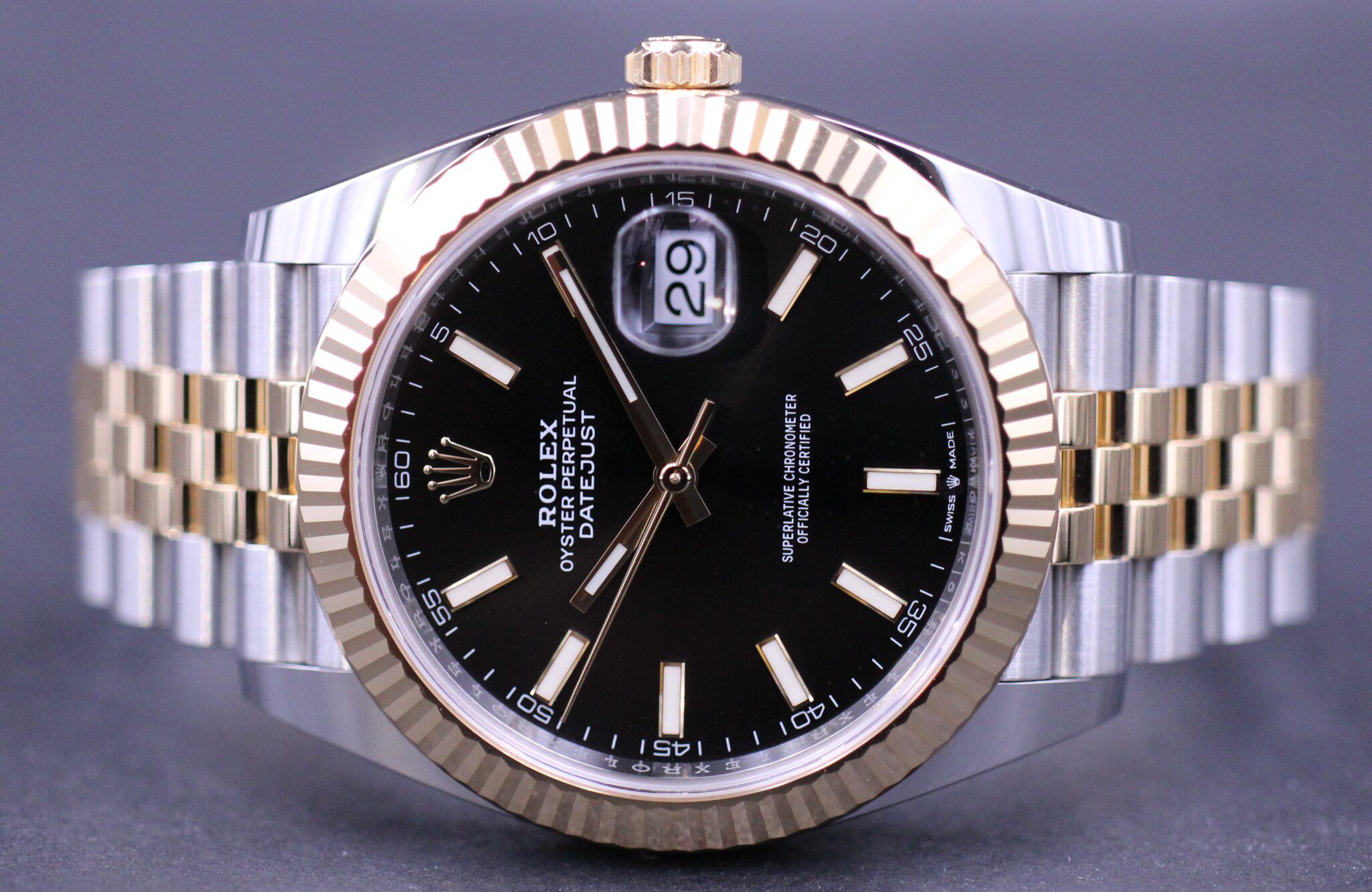 Klassisk Datejust model i 41mm, her med en flot sort sunburst skive som passer perfekt til urets lænke i guld og stål. Uret er monteret på jubilee bracelet.