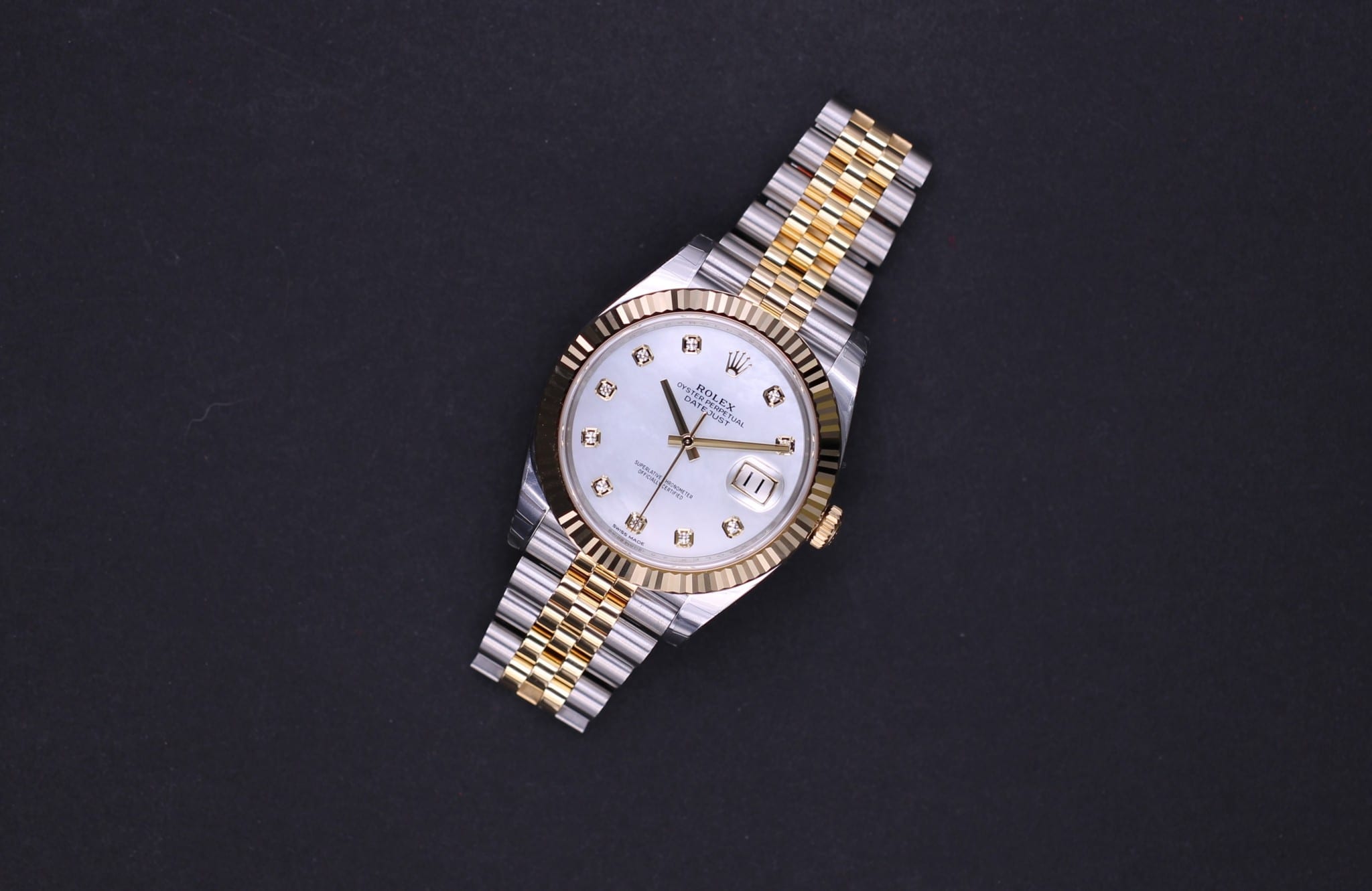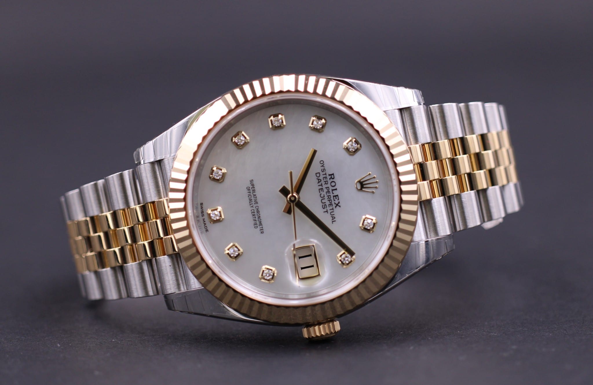 Klassisk Datejust model i 41mm, her med en flot Perlemor diamant dial som passer perfekte til uret i guld / stål uret. Uret er monteret på jubilee bracelet.