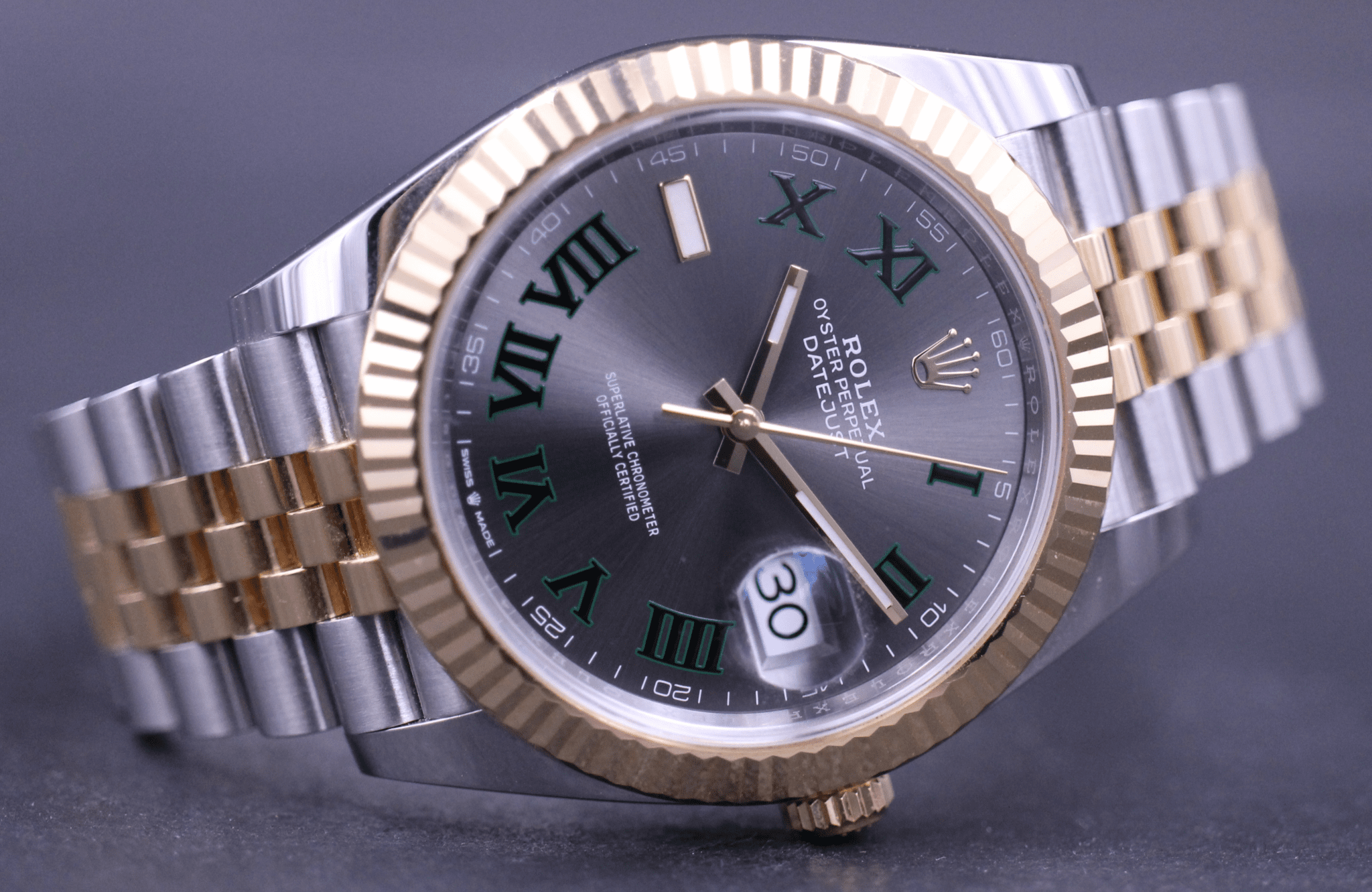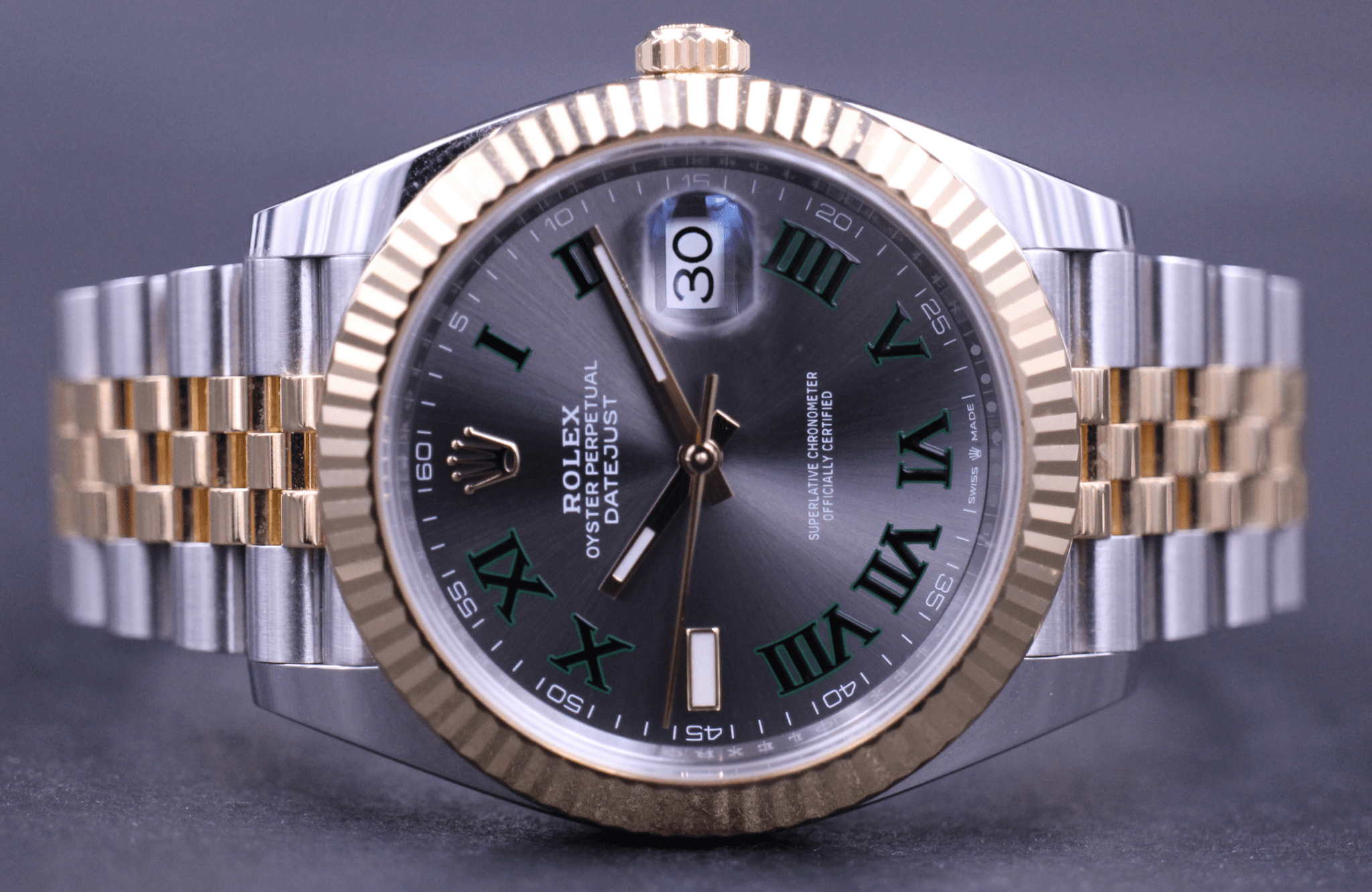 Klassisk Datejust model i 41mm, her med den flotte og populære Wimbledon dial som passer perfekte til uret i guld / stål uret. Uret er monteret på jubilee bracelet.