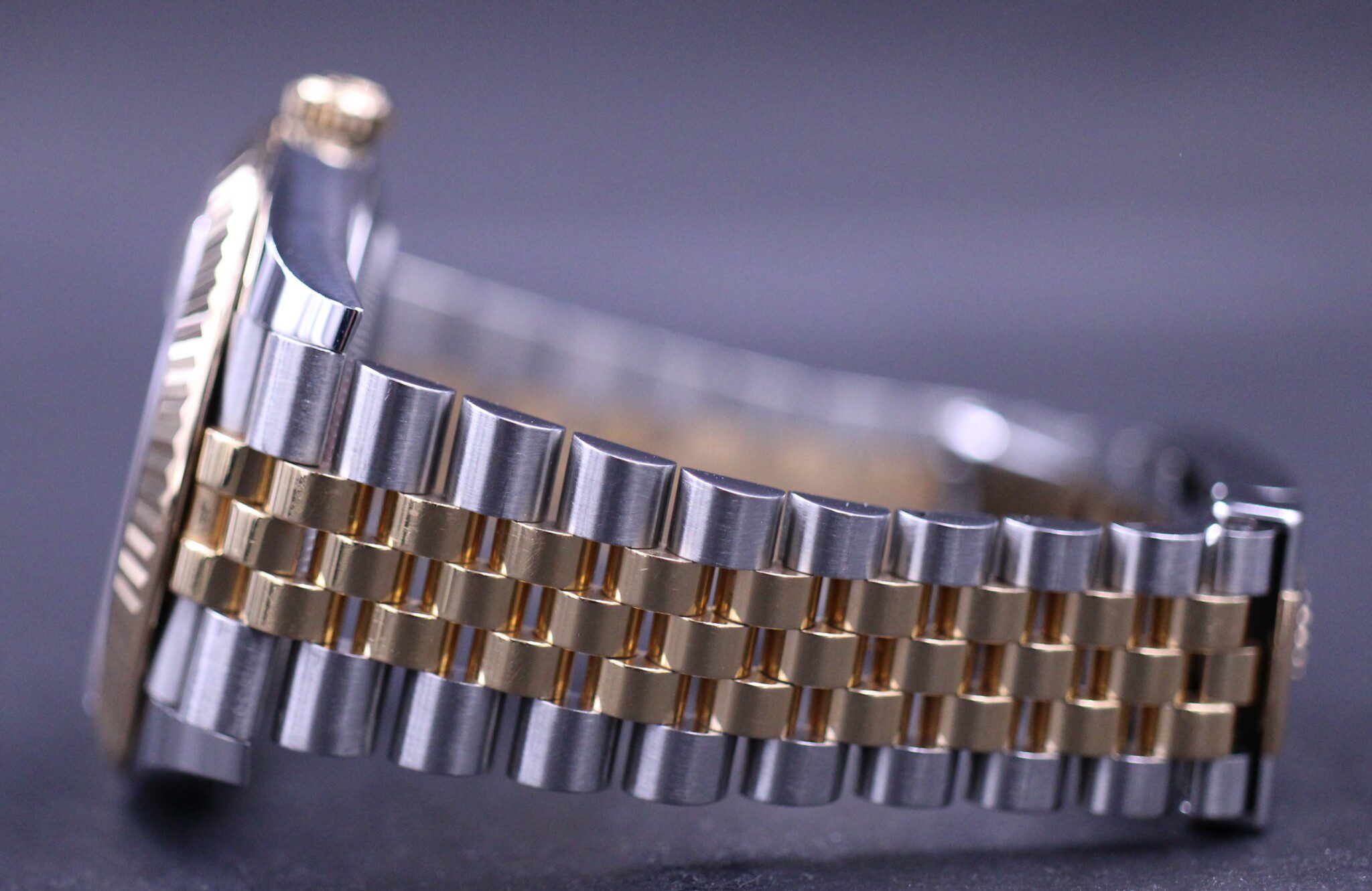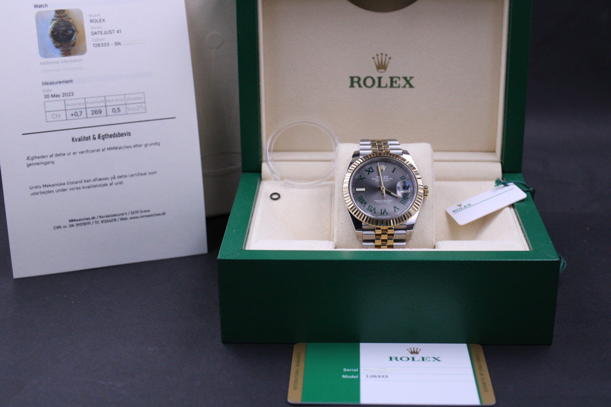Klassisk Datejust model i 41mm, her med den flotte og populære Wimbledon dial som passer perfekte til uret i guld / stål uret. Uret er monteret på jubilee bracelet.