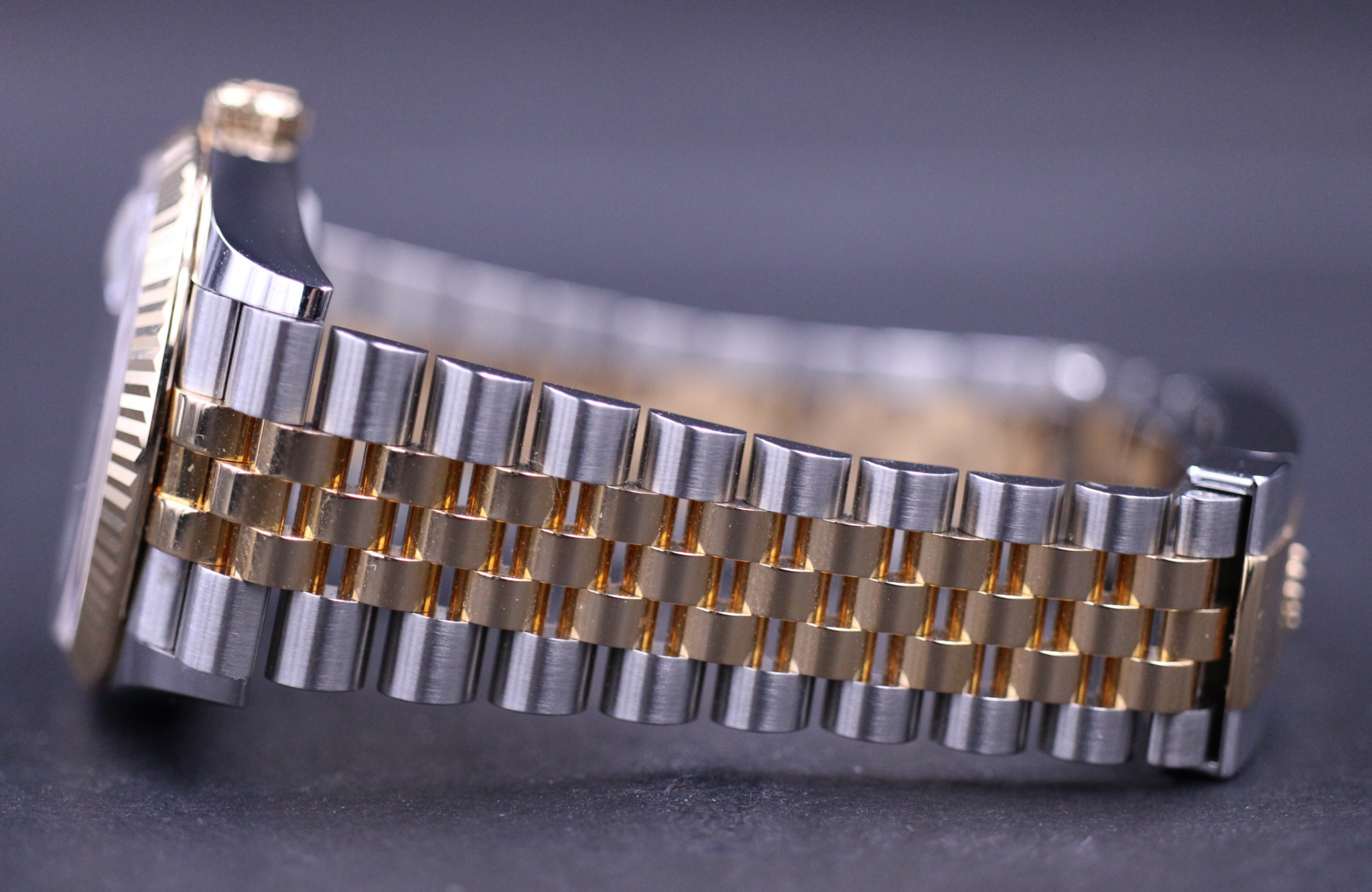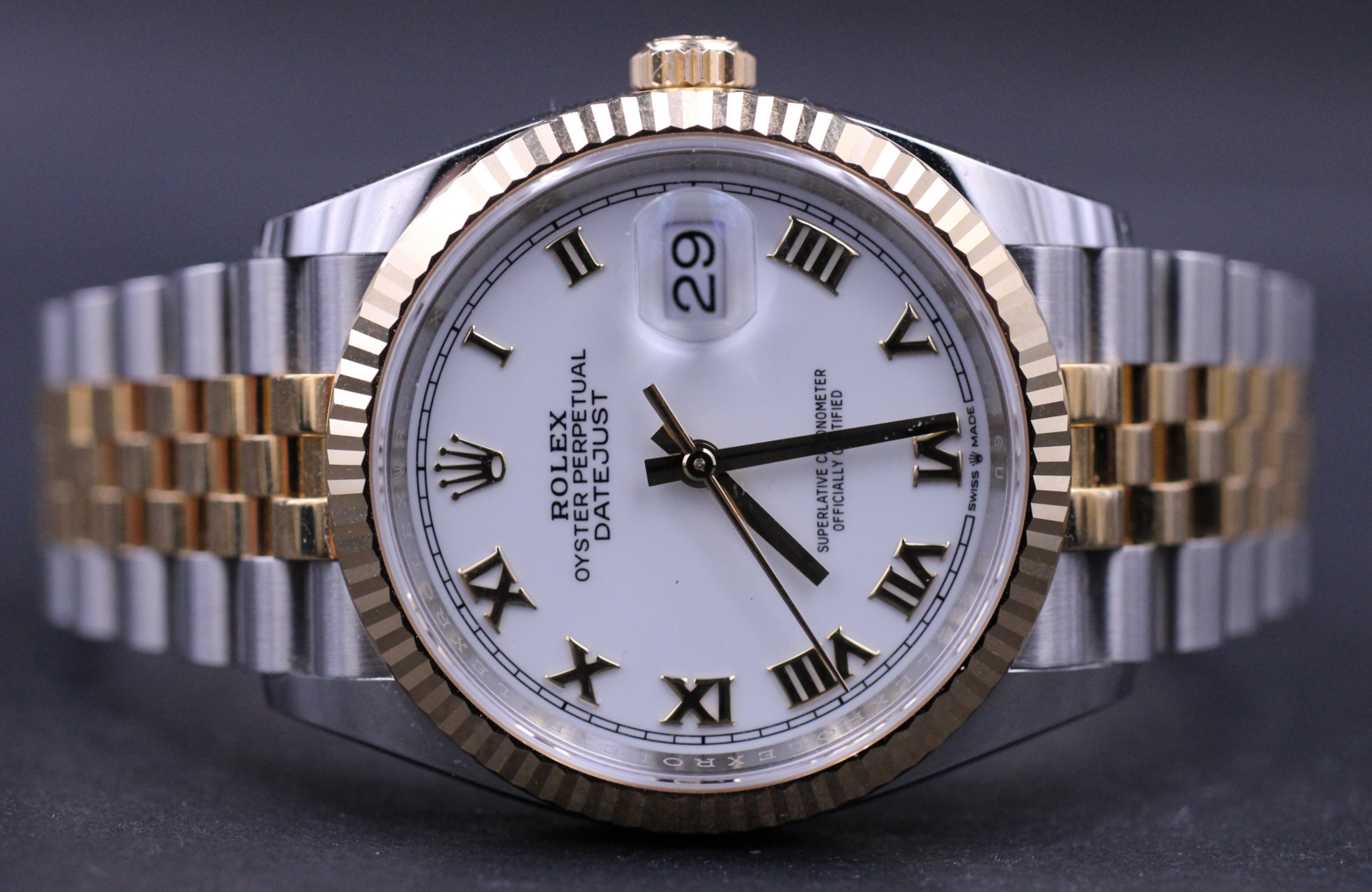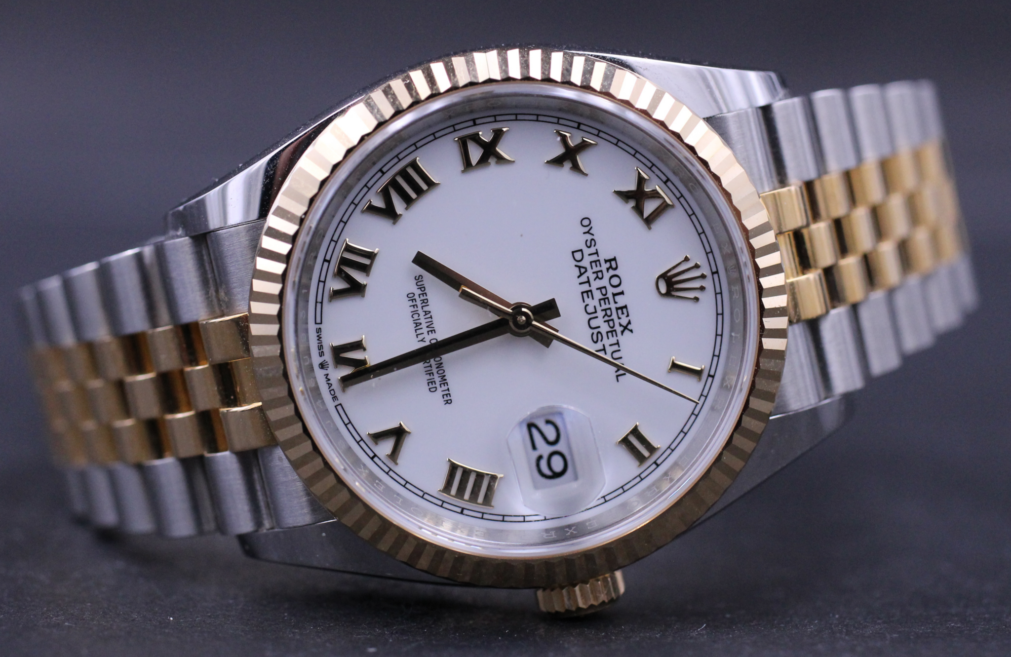 Uret der er udført i stål og gult guld måler 36mm og har den flotte hvide skive med romertal.