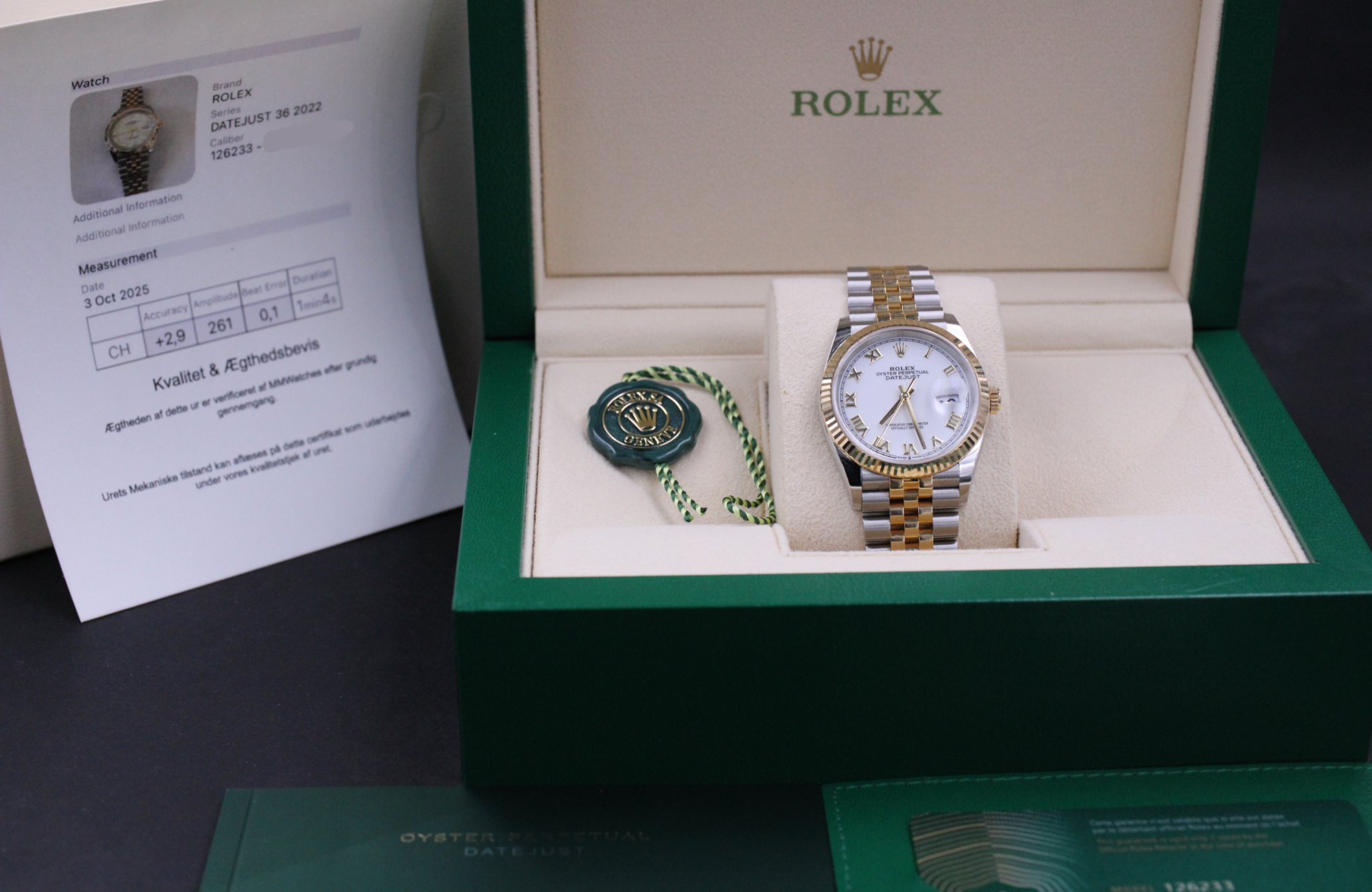 Med til dette ur medfølger MMwatches ”Kvalitet og ægthedsbevis”. Gennem vores grundige gennemgang af uret, fastslår vi at uret er 100% originalt. Urets mekaniske tilstand er testet og lever op til vores kvalitetskrav. Målingerne kan ses i det medfølgende bevis.