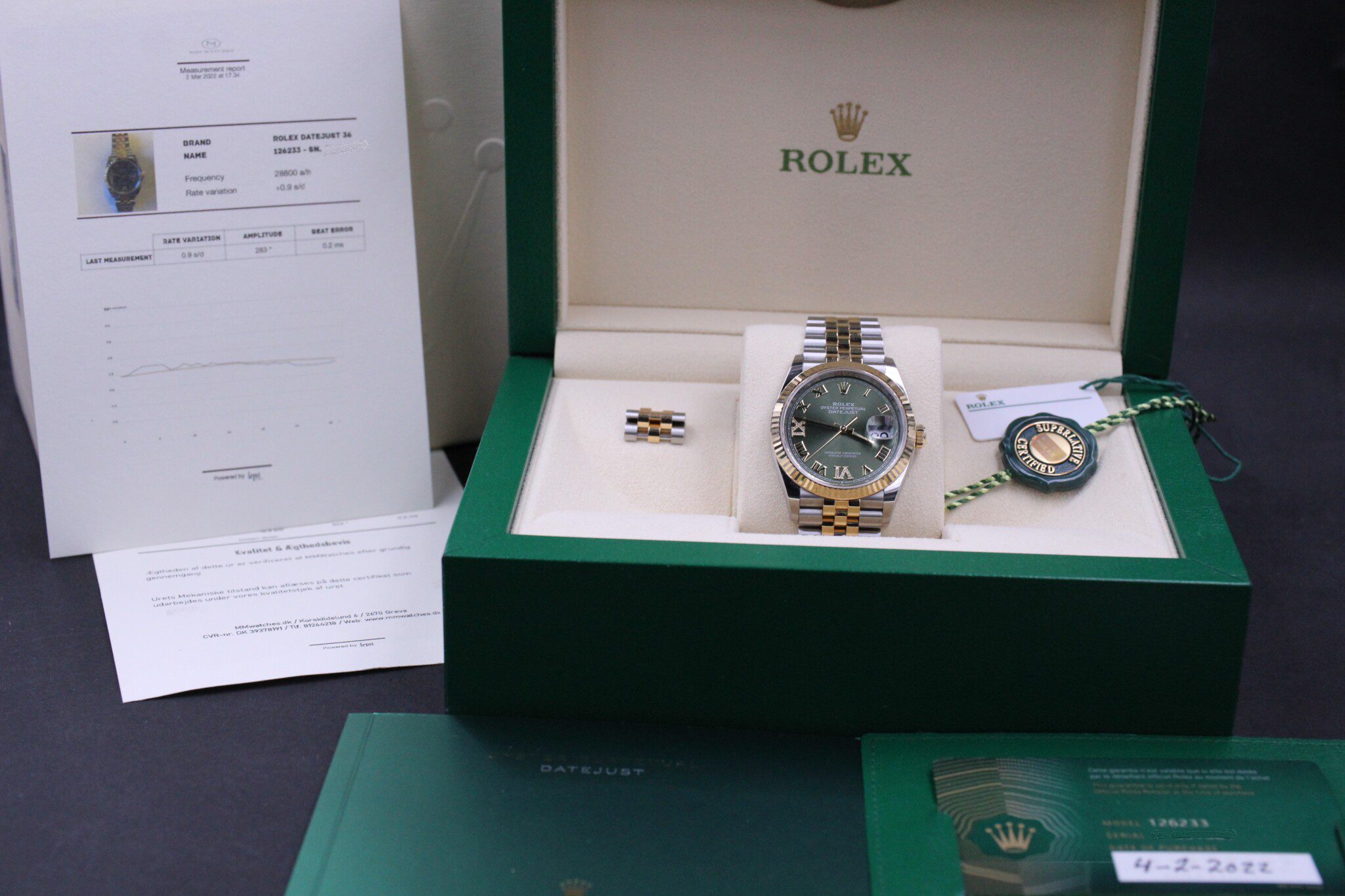 Med til dette ur medfølger MMwatches ”Kvalitet og ægthedsbevis”. Gennem vores grundige gennemgang af uret, fastslår vi at uret er 100% originalt. Urets mekaniske tilstand er testet og lever op til vores kvalitetskrav. Målingerne kan ses i det medfølgende bevis.