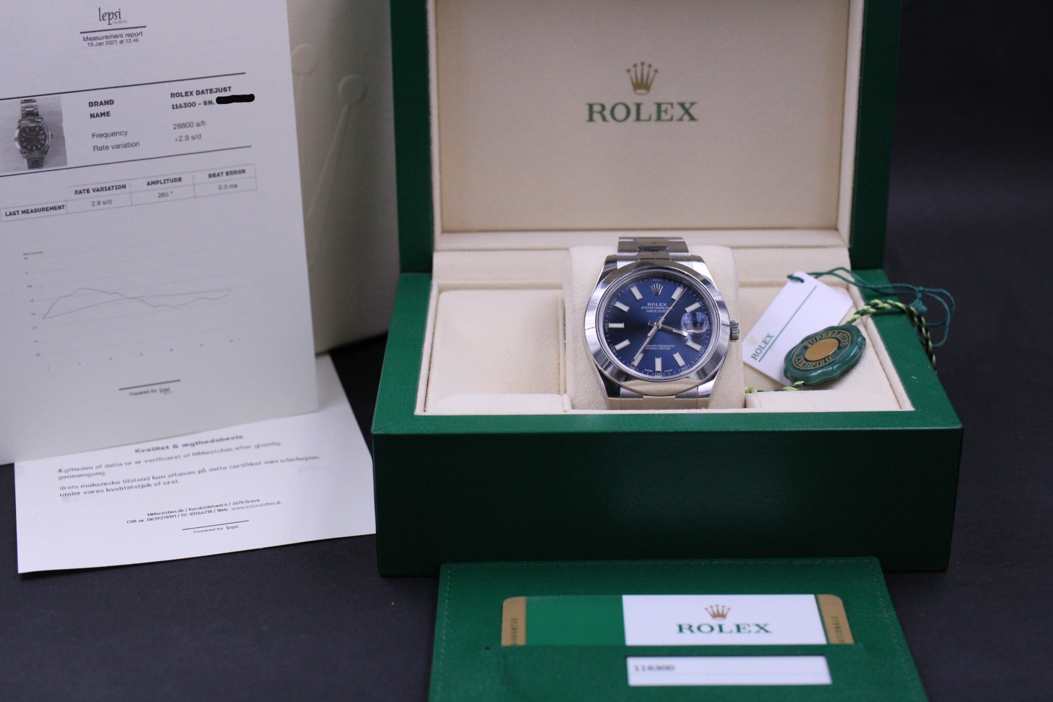 Med til dette ur medfølger MMwatches ”Kvalitet og ægthedsbevis”. Gennem vores grundige gennemgang af uret, fastslår vi at uret er 100% originalt. Urets mekaniske tilstand er testet og lever op til vores kvalitetskrav. Målingerne kan ses i det medfølgende bevis.