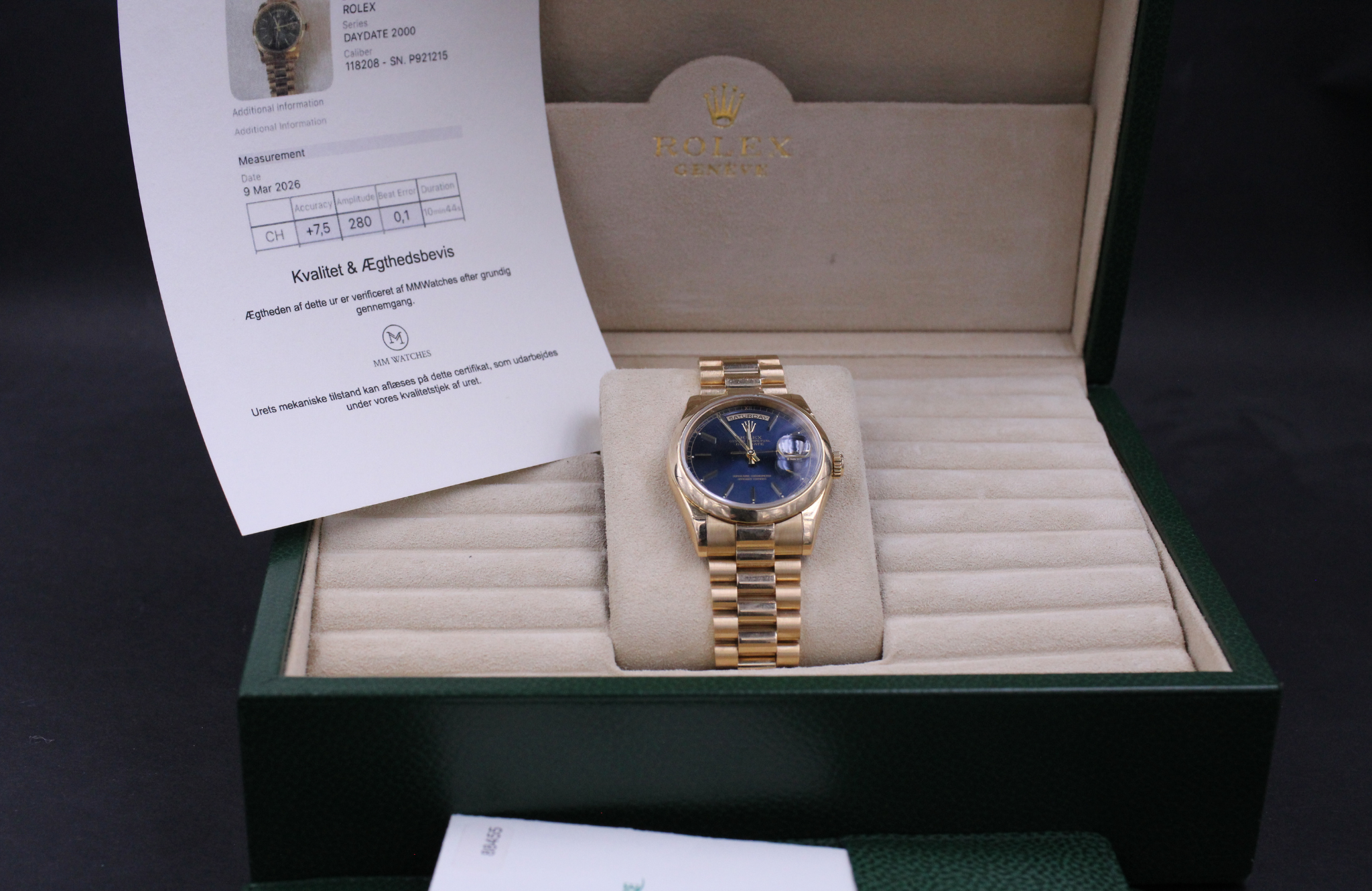Med til dette ur medfølger MMwatches ”Kvalitet og ægthedsbevis”. Gennem vores grundige gennemgang af uret, fastslår vi at uret er 100% originalt. Urets mekaniske tilstand er testet og lever op til vores kvalitetskrav. Målingerne kan ses i det medfølgende bevis.