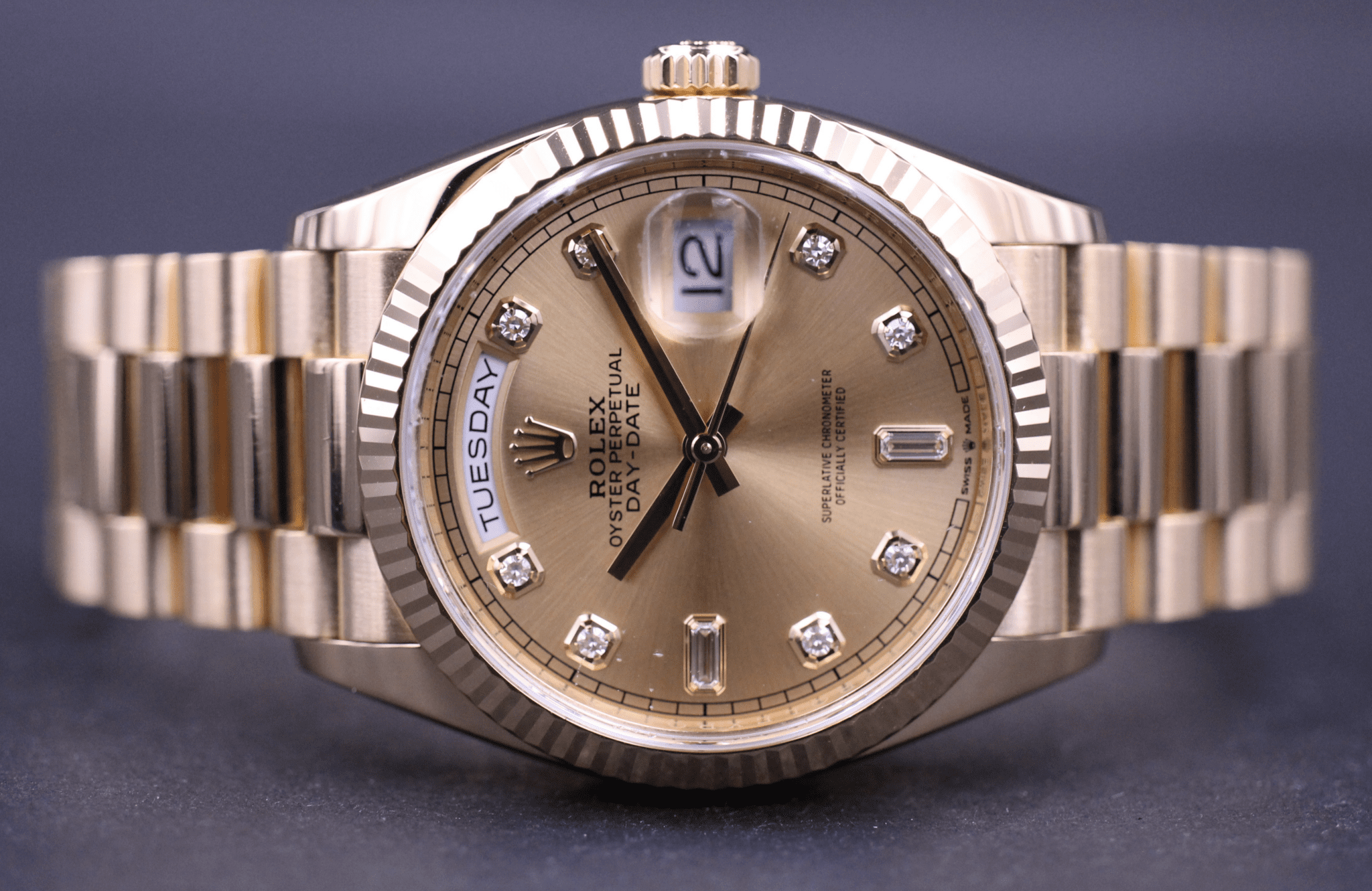 Hos første gang hos MM Watches præsenteres dette super smukke Day-Date i 36mm med den flotte guld dial med diamanter. Uret er i 18k guld.