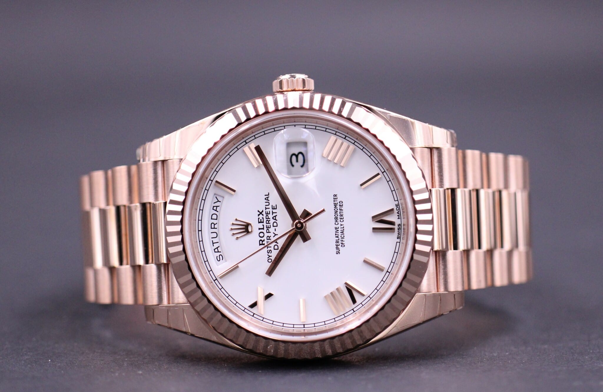 Super smukt Day-Date i 40mm med den flotte hvide skive med rosegold romertal. Uret er i 18k Rosegold.