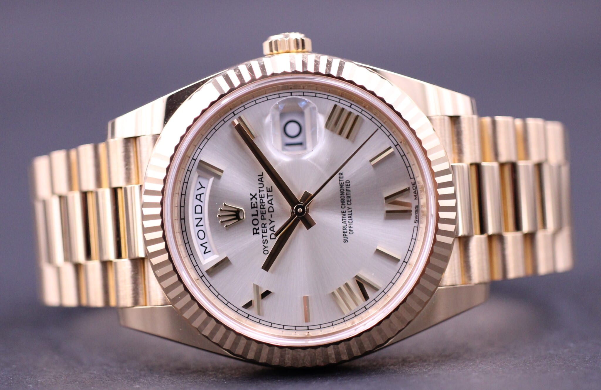 Super smukt Day-Date i 40mm med den populære sundust dial med romertal i guld. Uret er også i 18k guld og måler 40mm