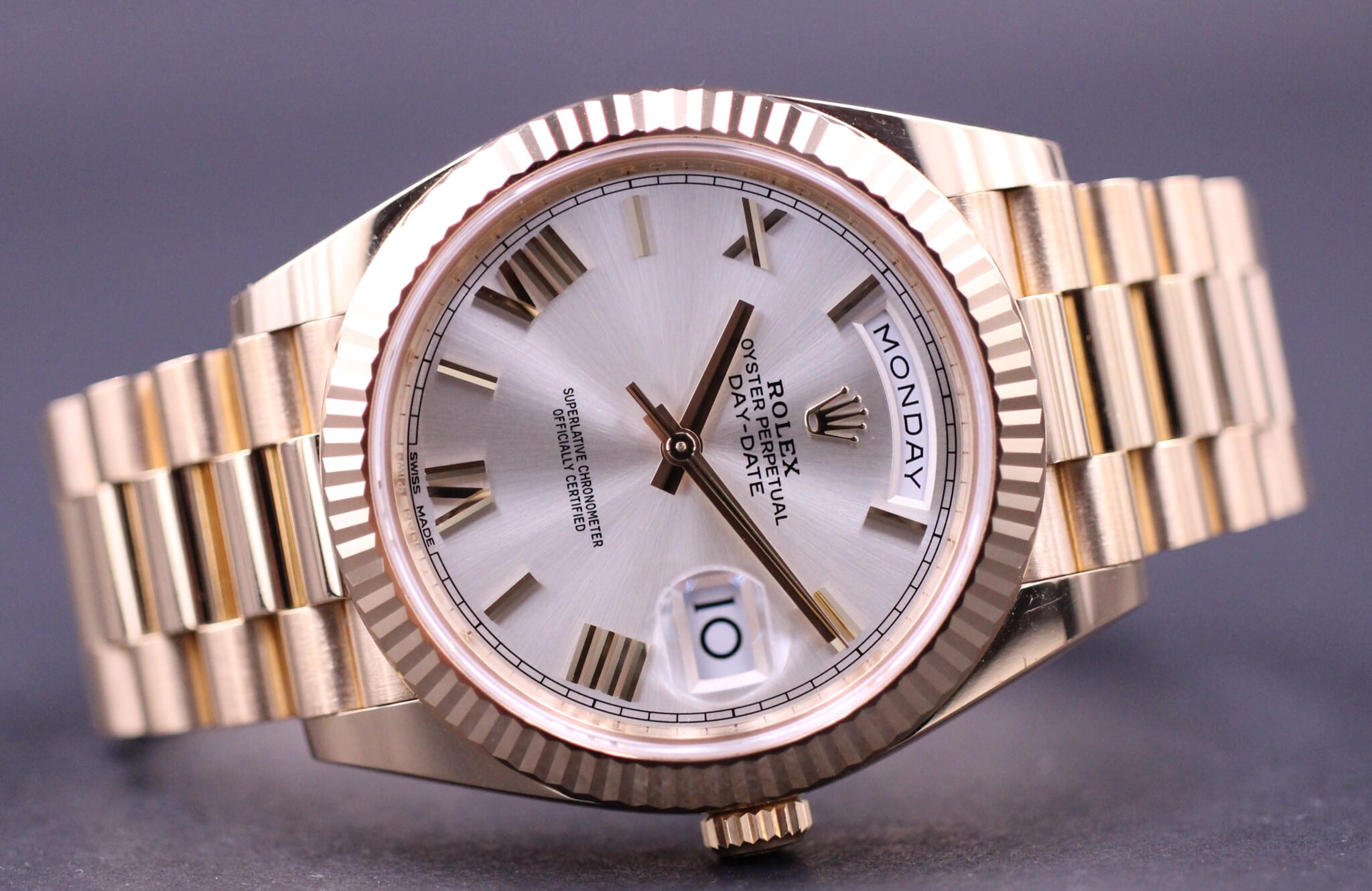 Rolex Day-Date 40, ref 228238. Uret er fra 2018 og dermed omfattet af Rolex WorldWide garanti til 2023.