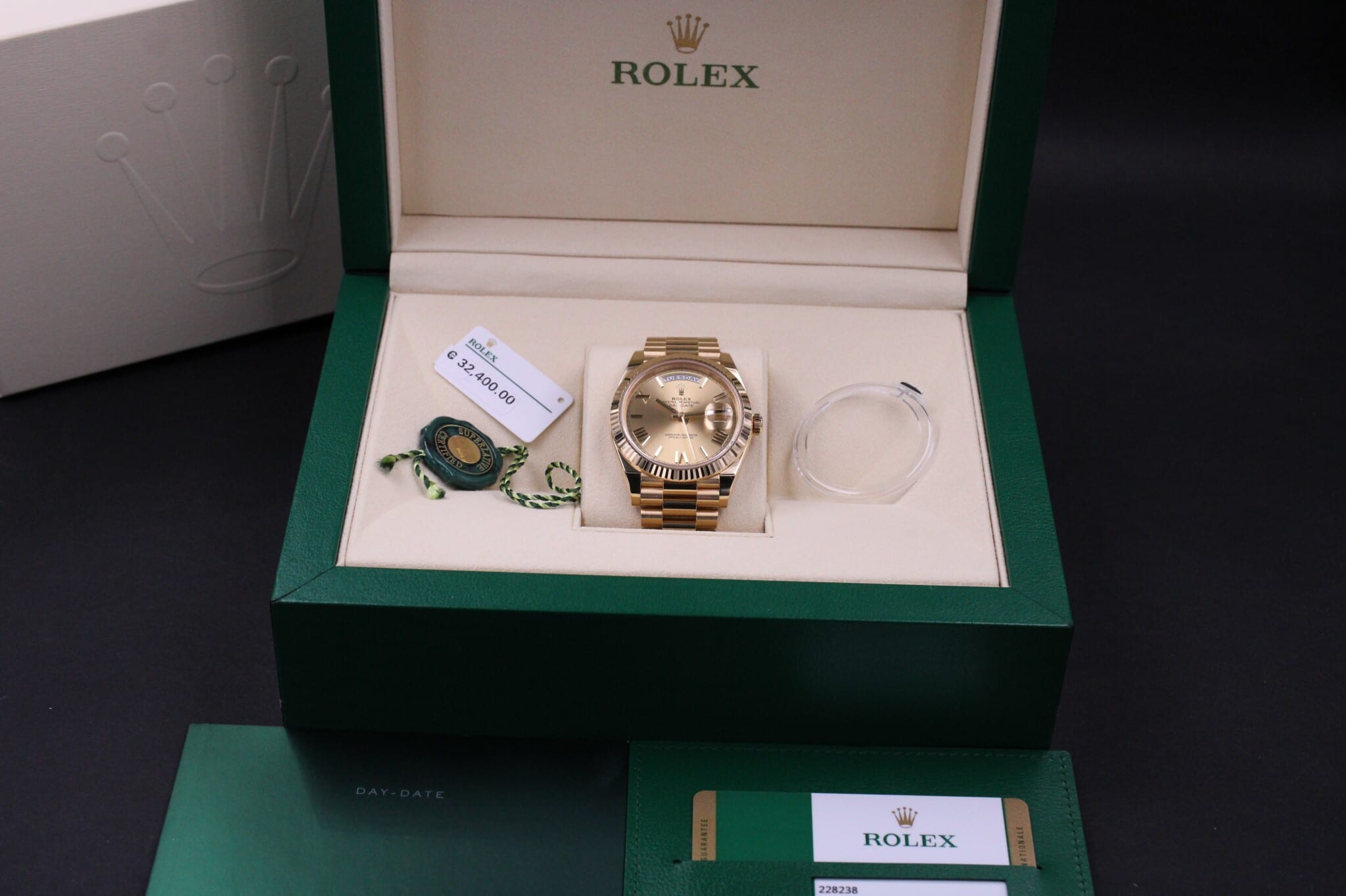 Rolex Day-Date 40, ref 228238. Fra 2017 og dermed omfattet af Rolex World Wide Garanti til 2022. Uret er stadig i delvist folie, og står tæt på nystand.