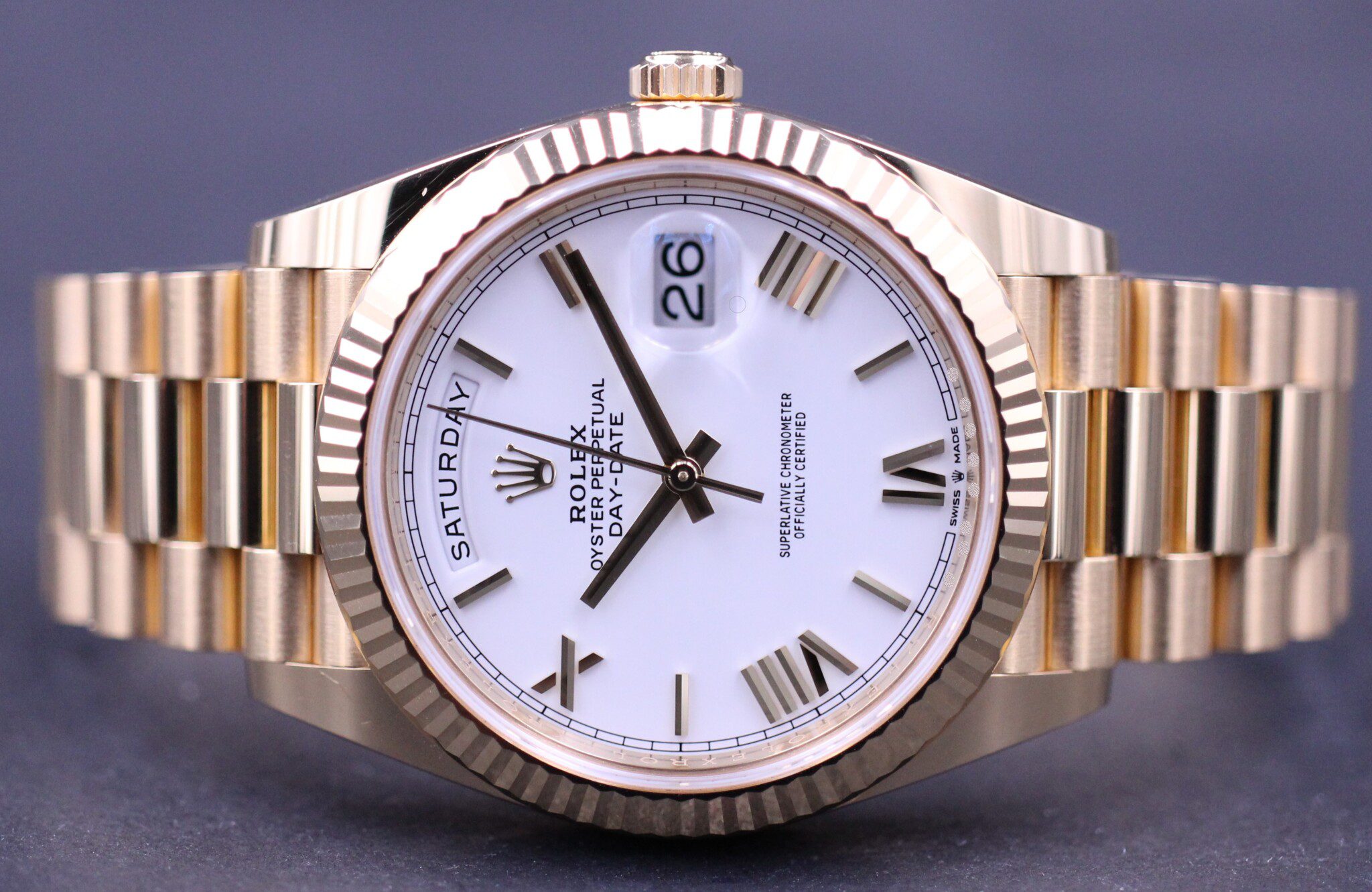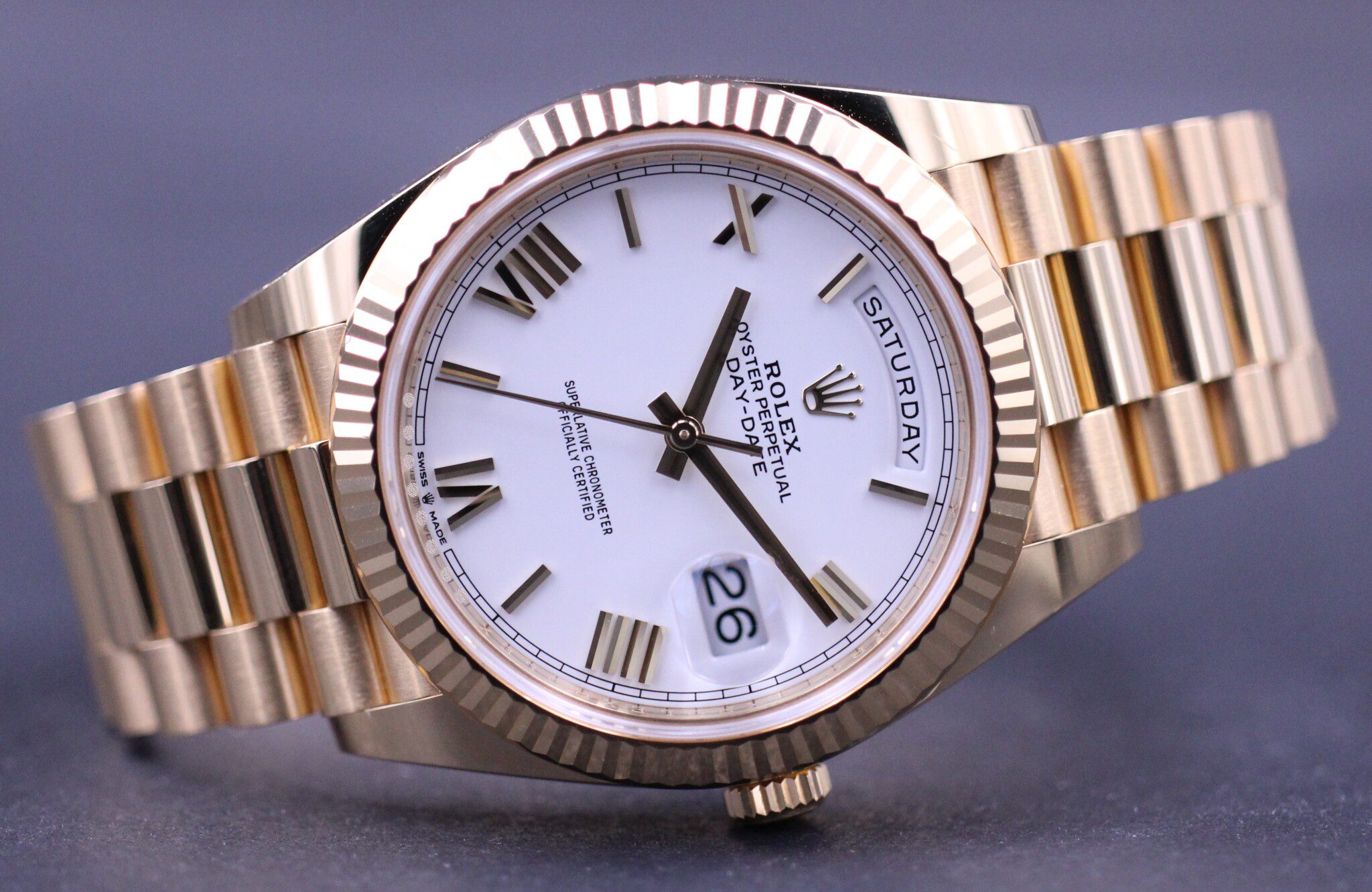 Super smukt Day-Date i 40mm med den flotte hvide dial. Uret er i 18k guld.