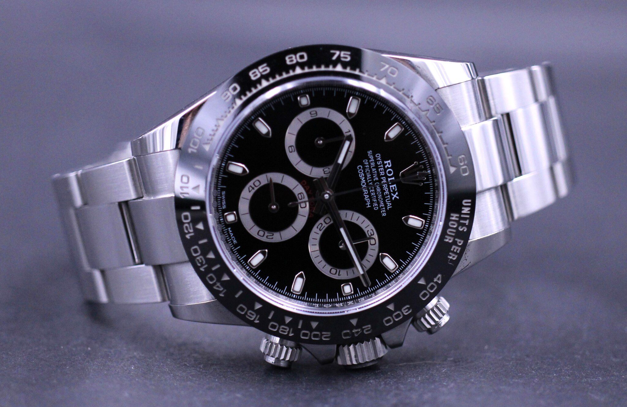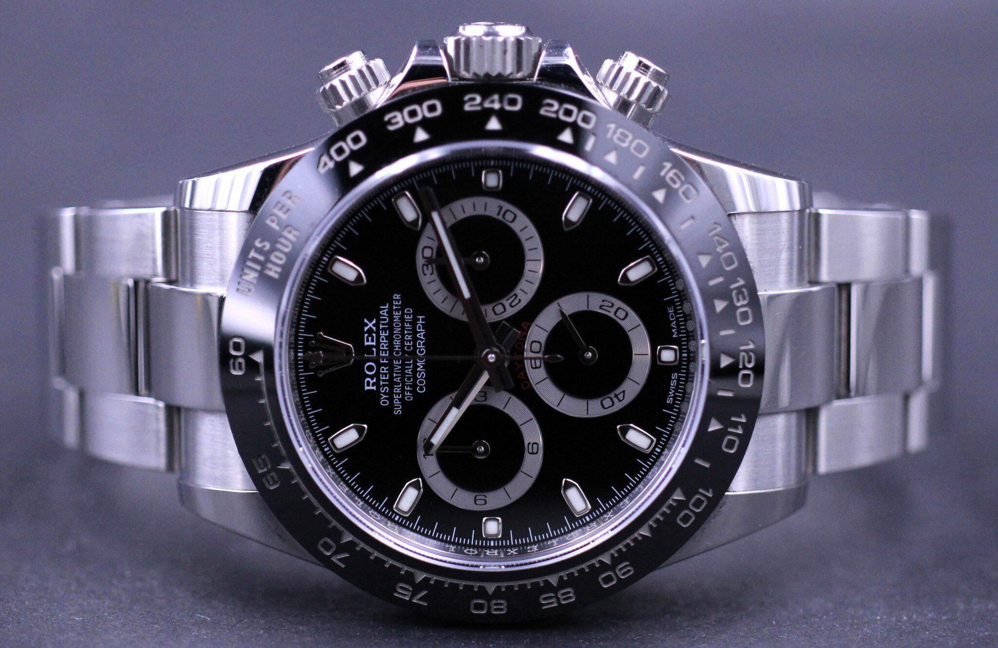 Rolex Daytona med sort skive og sort keramisk insert. Nyeste model. Uret er et af de mest eftertragtede sportsure fra Rolex.