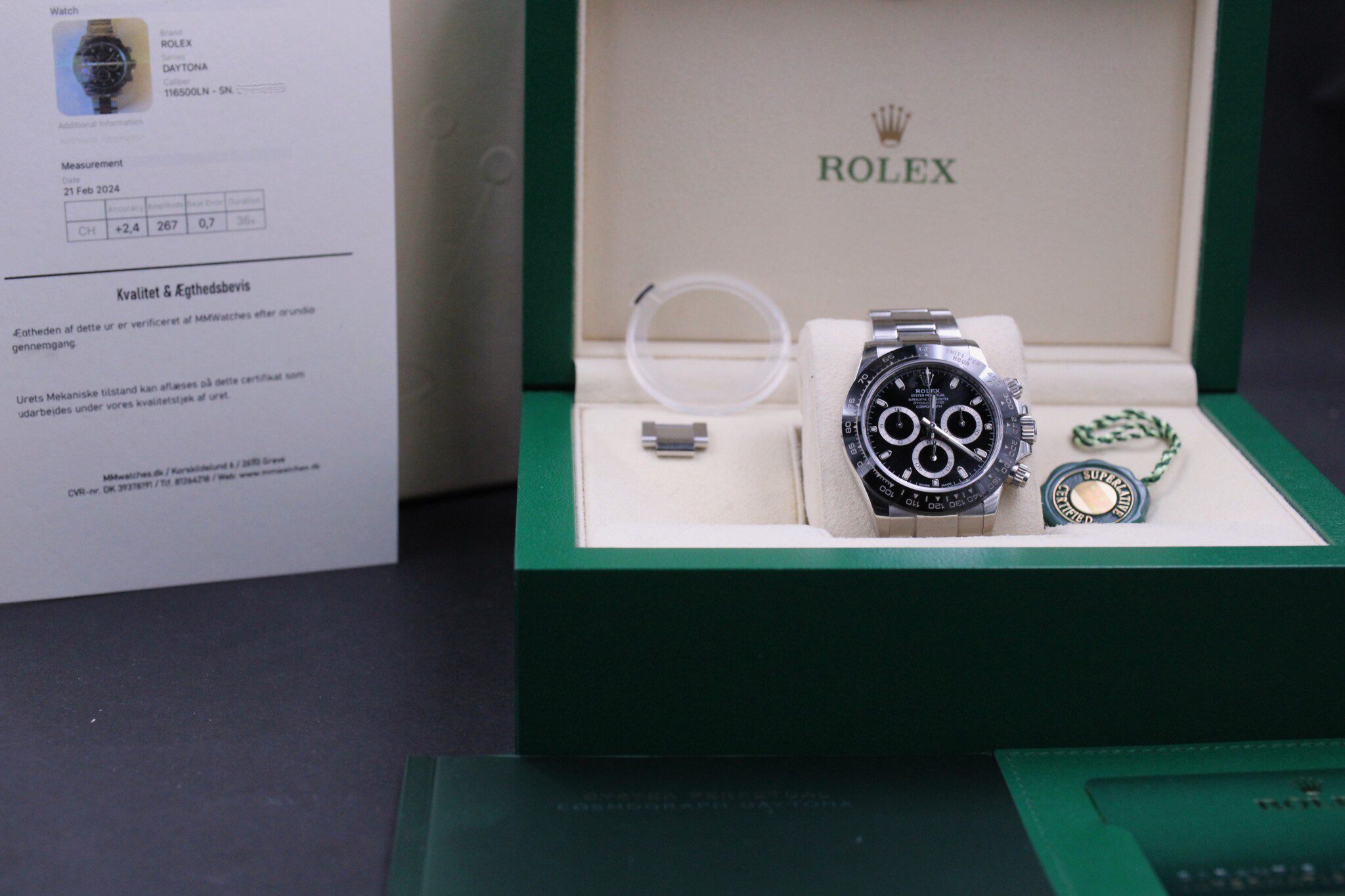 Mærke: Rolex Model: Daytona Ref. nr.: 116500LN Årgang: 2021 Tilbehør: Boks, papirer & certifikat Funktioner: Kronograf, Tachymeter Størrelse: 40 Stand: 97%