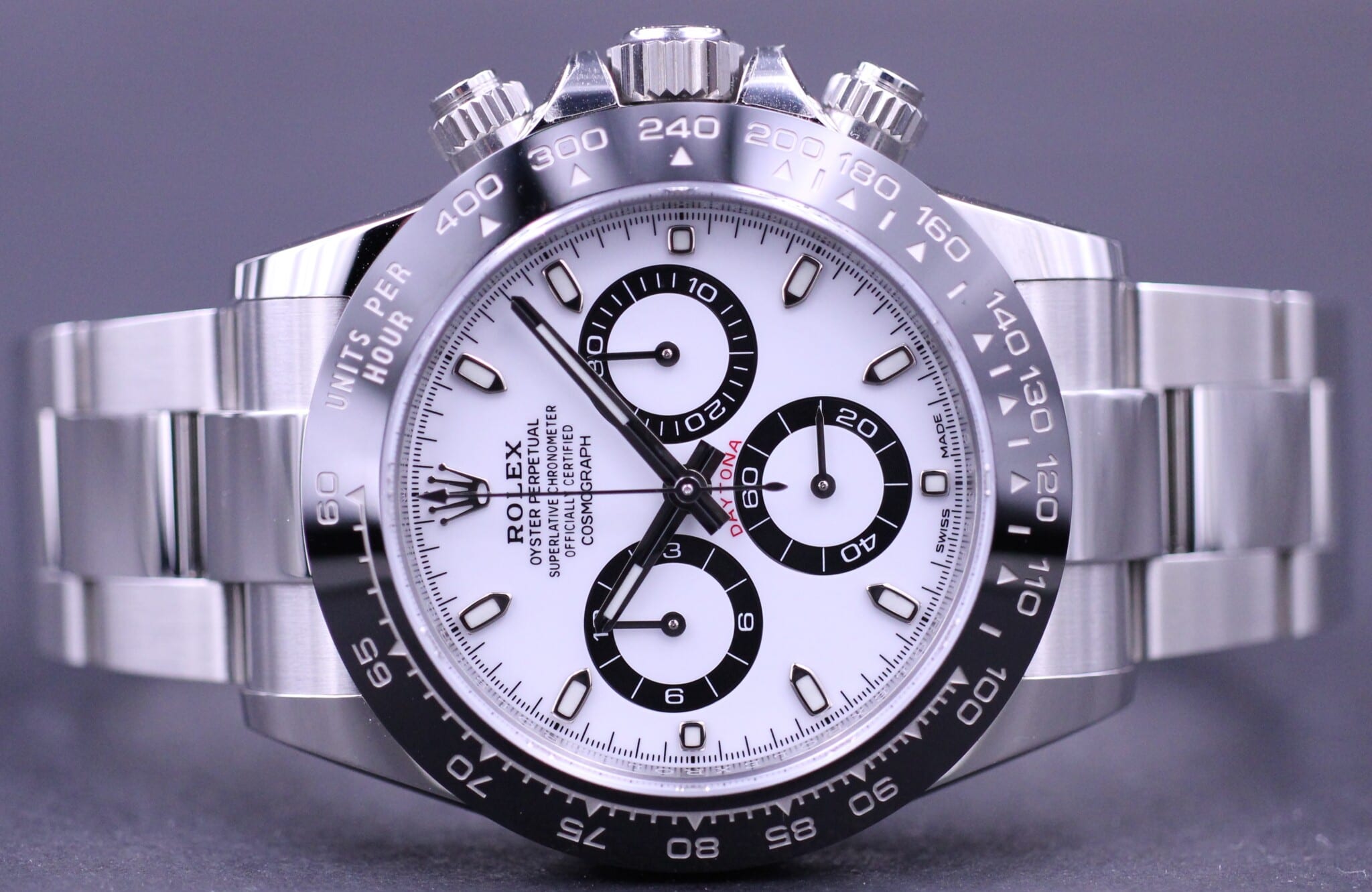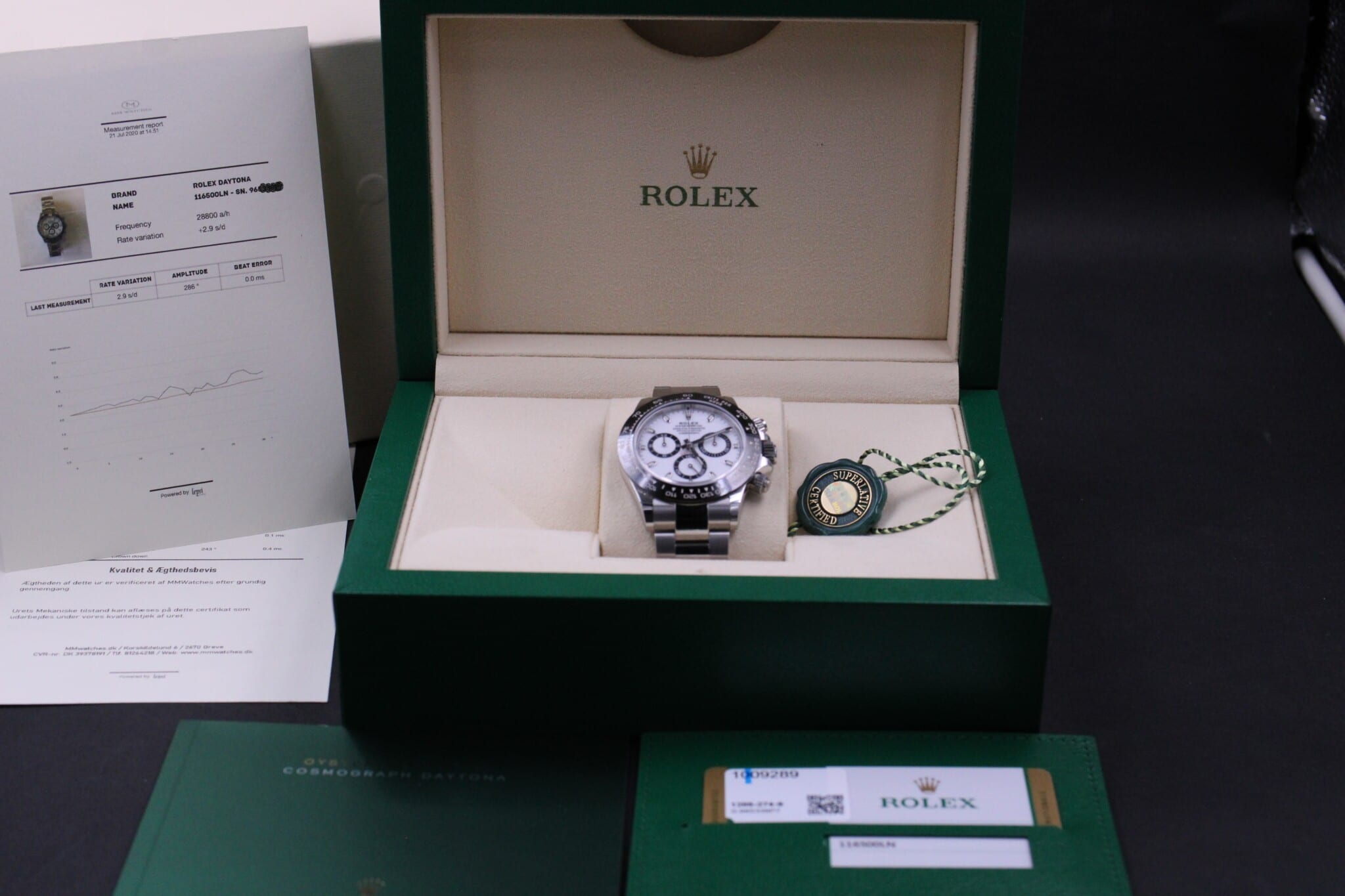 Rolex Daytona med hvid skive og sort keramisk insert. Nyeste model. Uret er et af de mest eftertragtede sportsure fra Rolex.