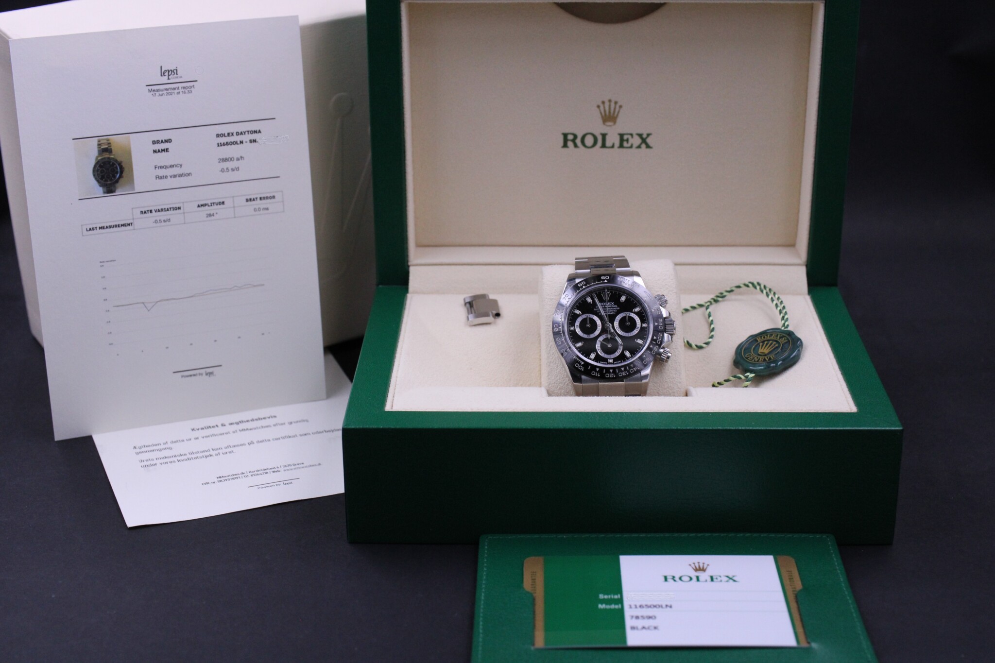 Mærke: Rolex Model: Daytona Ref. nr.: 116500LN Årgang: 2020 Tilbehør: Boks, papirer & certifikat Funktioner: Kronograf, Tachymeter Størrelse: 40mm Stand: 90%