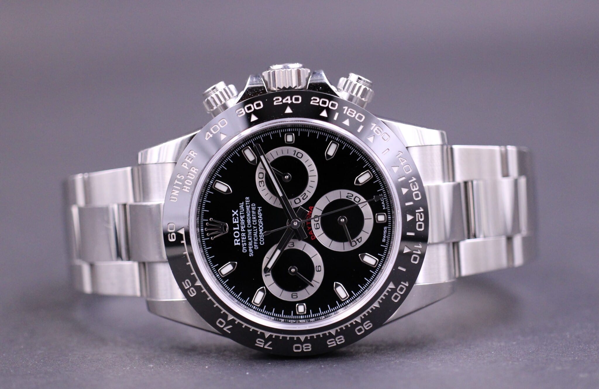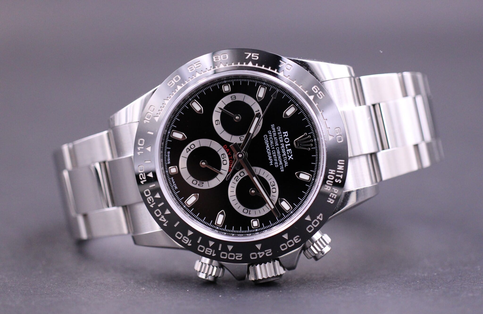 Rolex Daytona med sort skive og sort keramisk insert. Nyeste model. Uret er et af de mest eftertragtede sportsure fra Rolex.