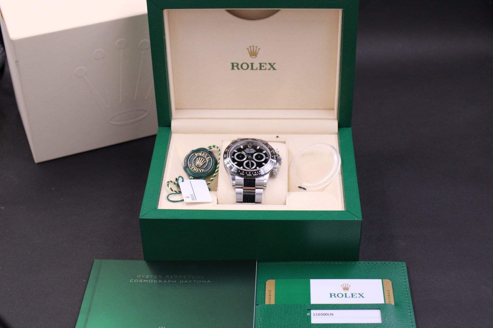 Mærke: Rolex Model: Daytona Ref. nr.: 116500LN Årgang: 2018 Tilbehør: Boks, papirer og certifikat Funktioner: Dato & Kronograf Størrelse: 40mm Stand: 90%