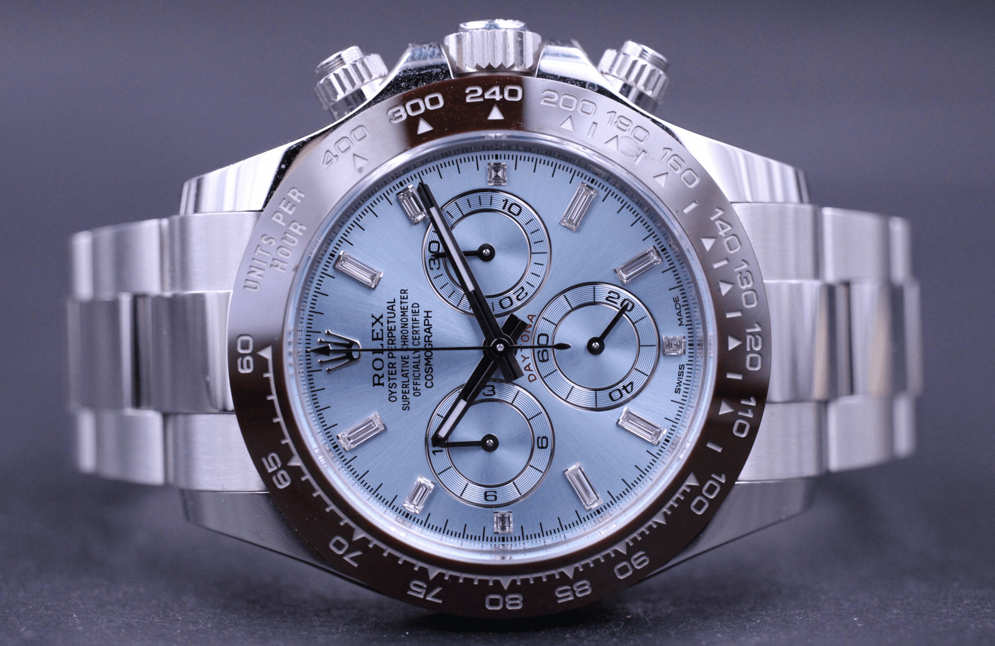 Gennemført lækkert Platin Daytona med Ice Blue Baguette Diamond Dial.